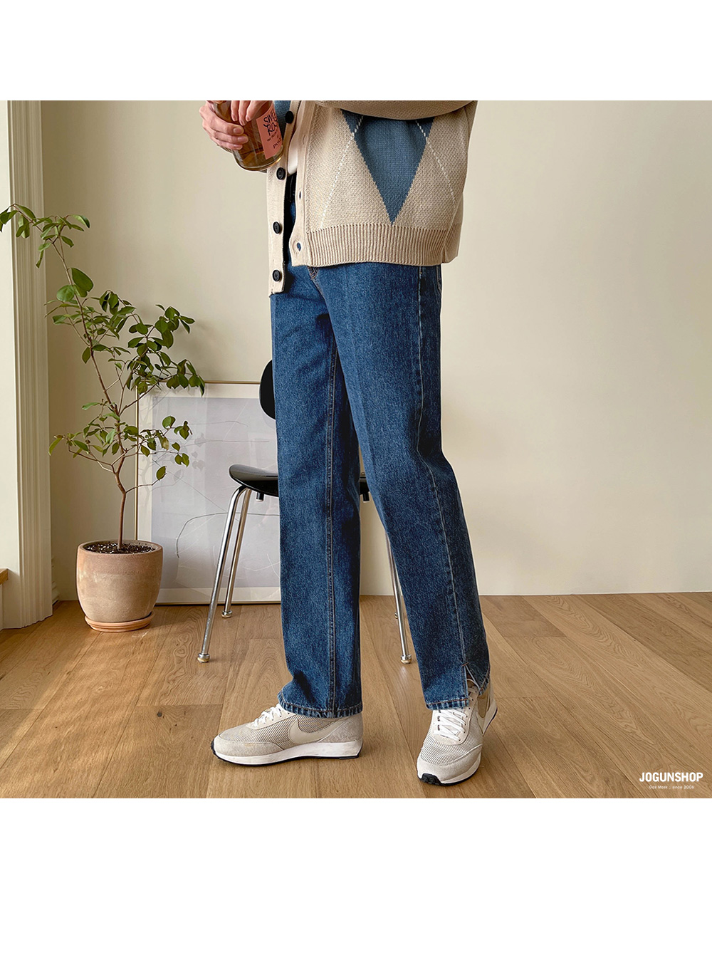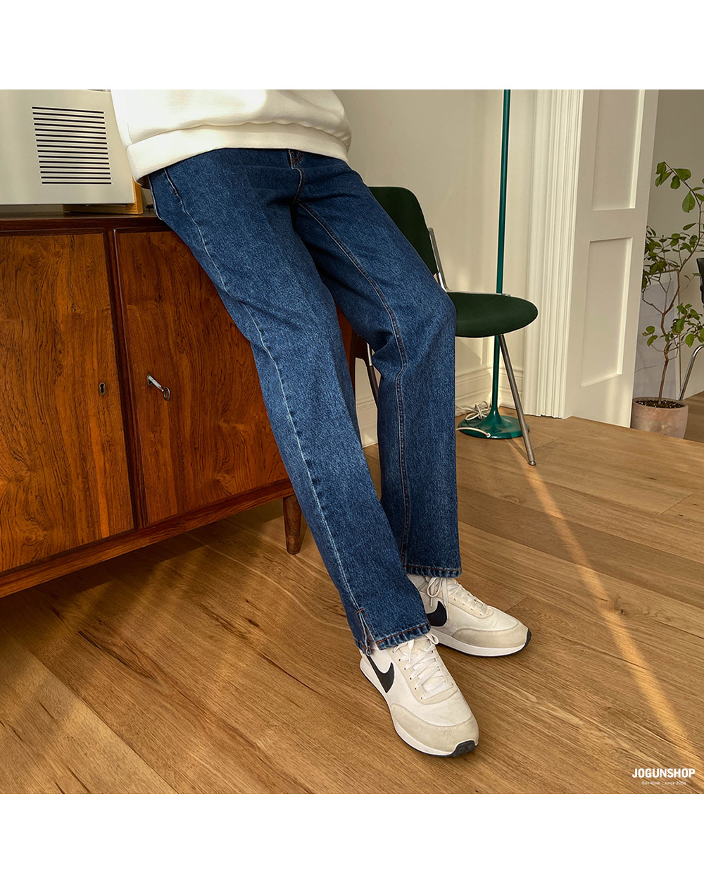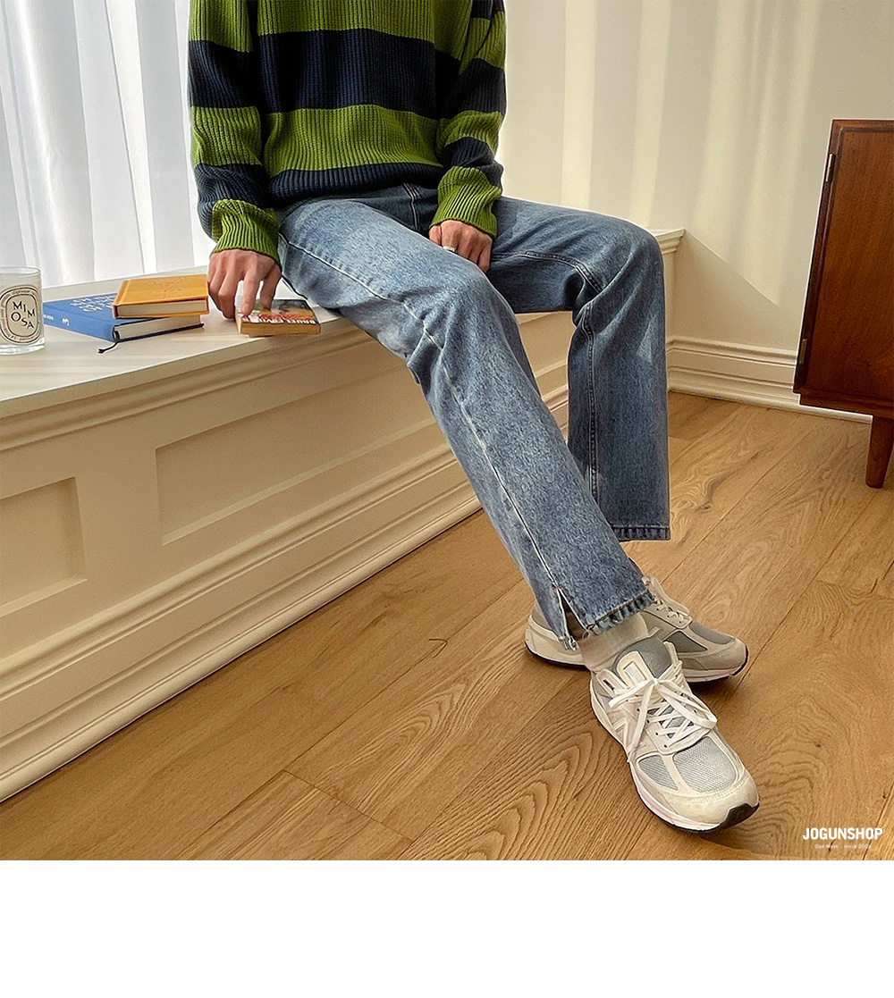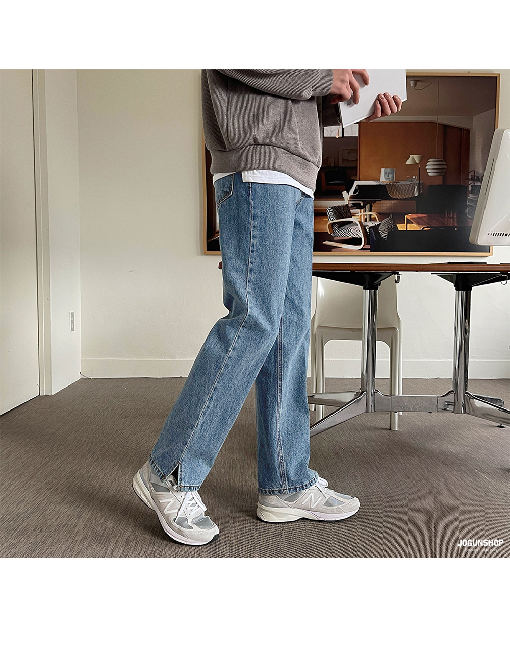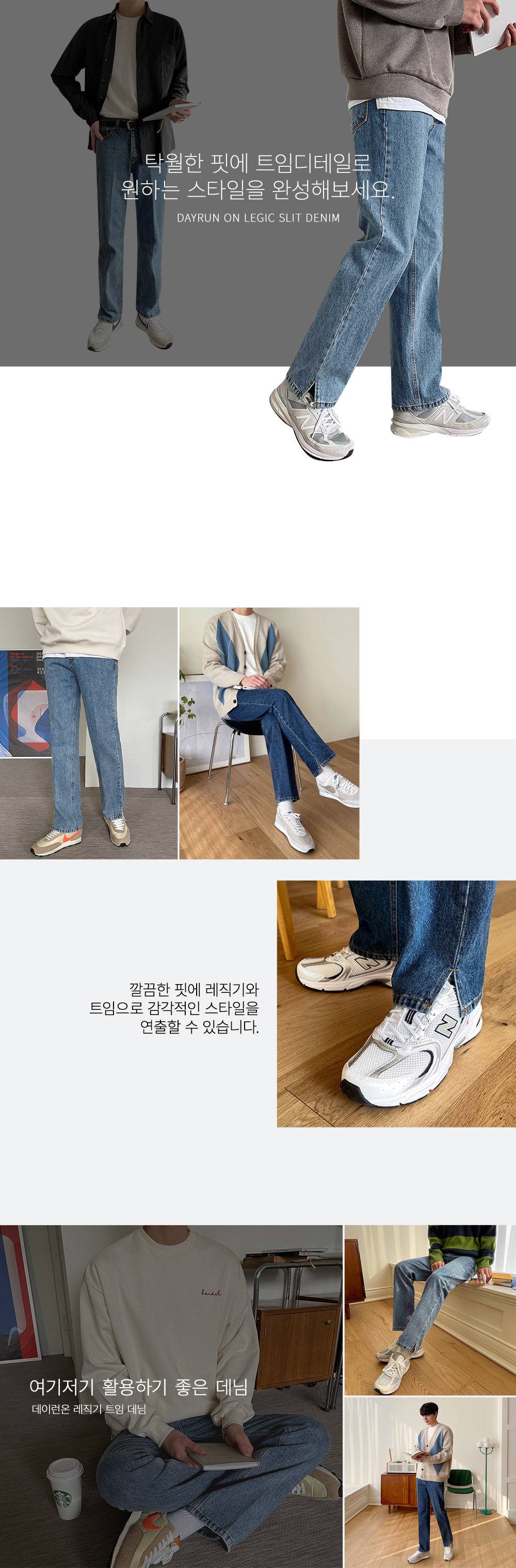 트렌디한 세미 와이드 핏과 양쪽 밑단 트임이 특징인 제품입니다.