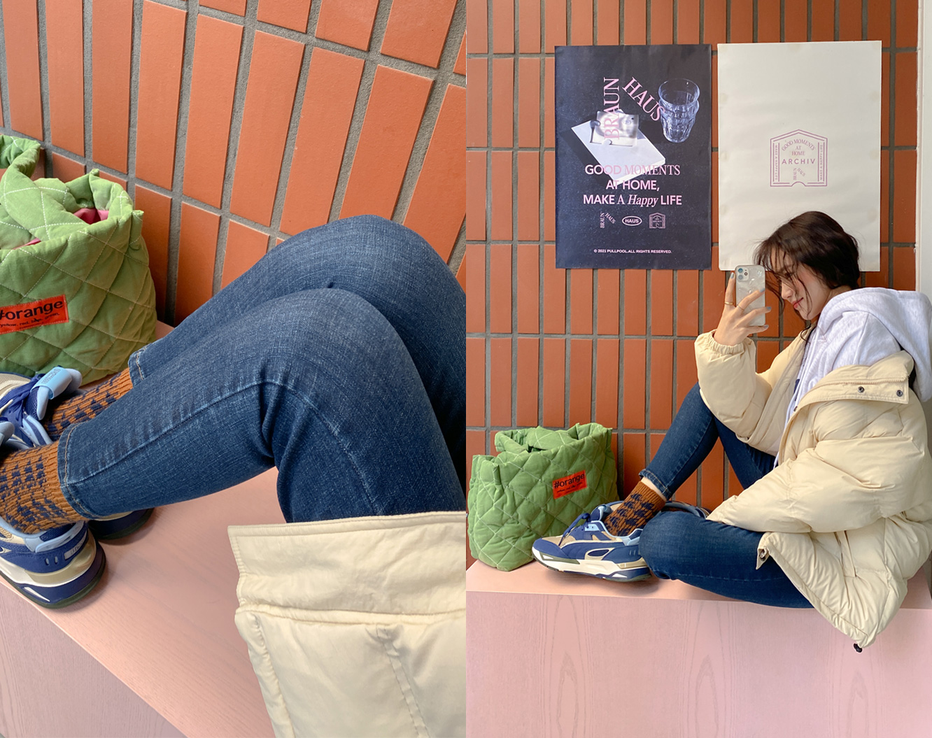 트렌디한 컬러의 스티치와 잔잔한 세로방향워싱