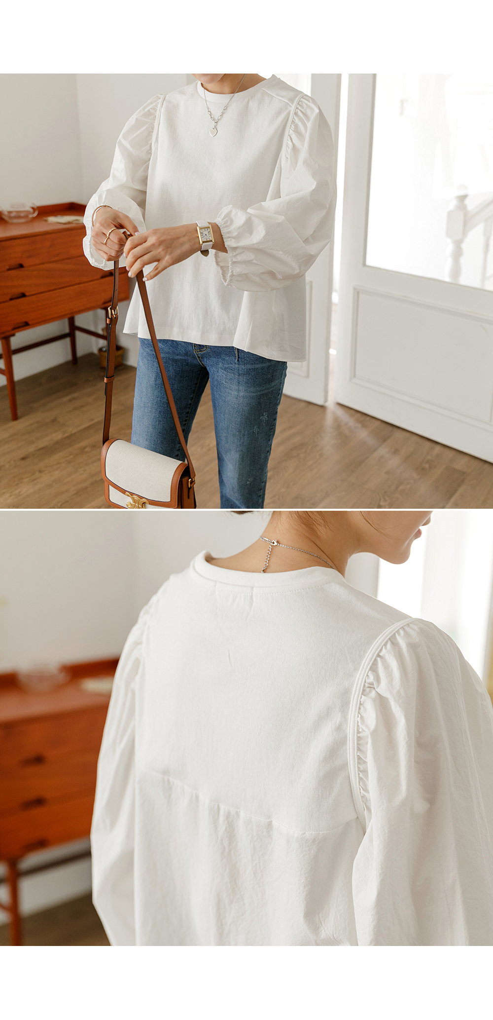 소매엔 셔링으로 볼륨감을 살려줘