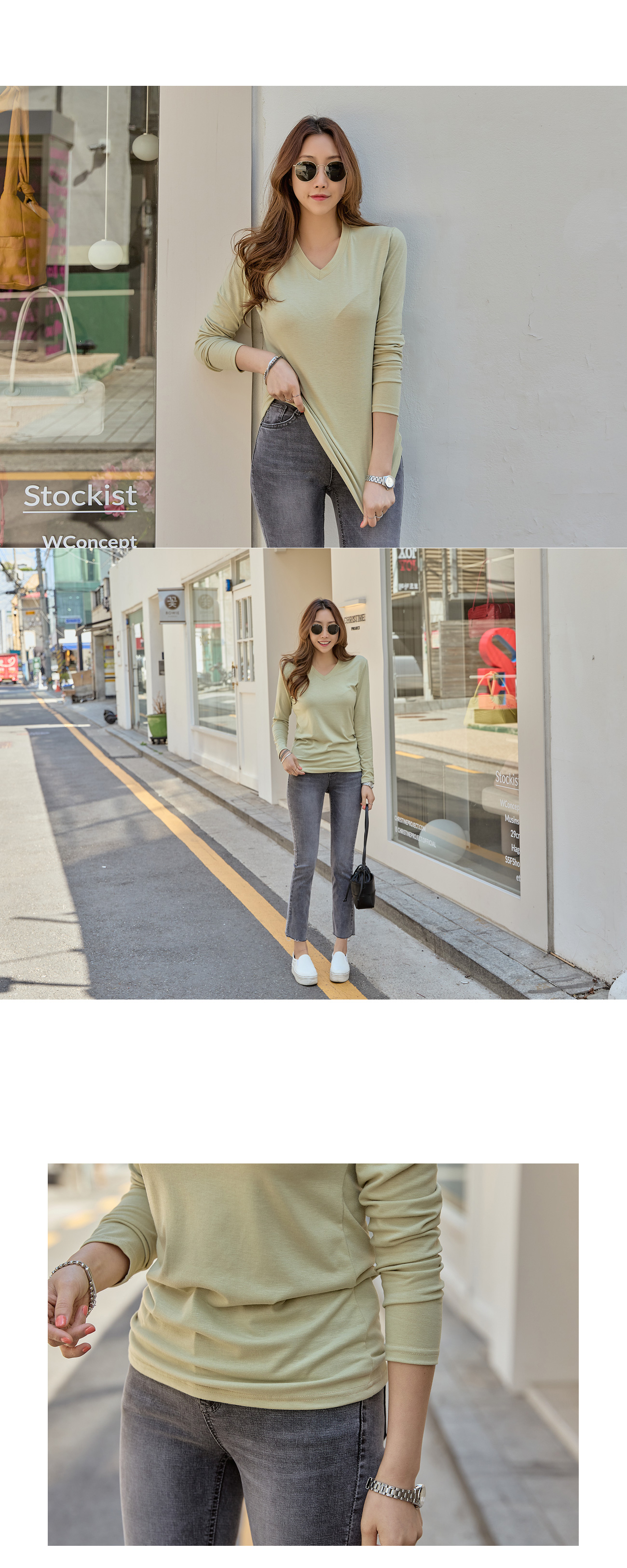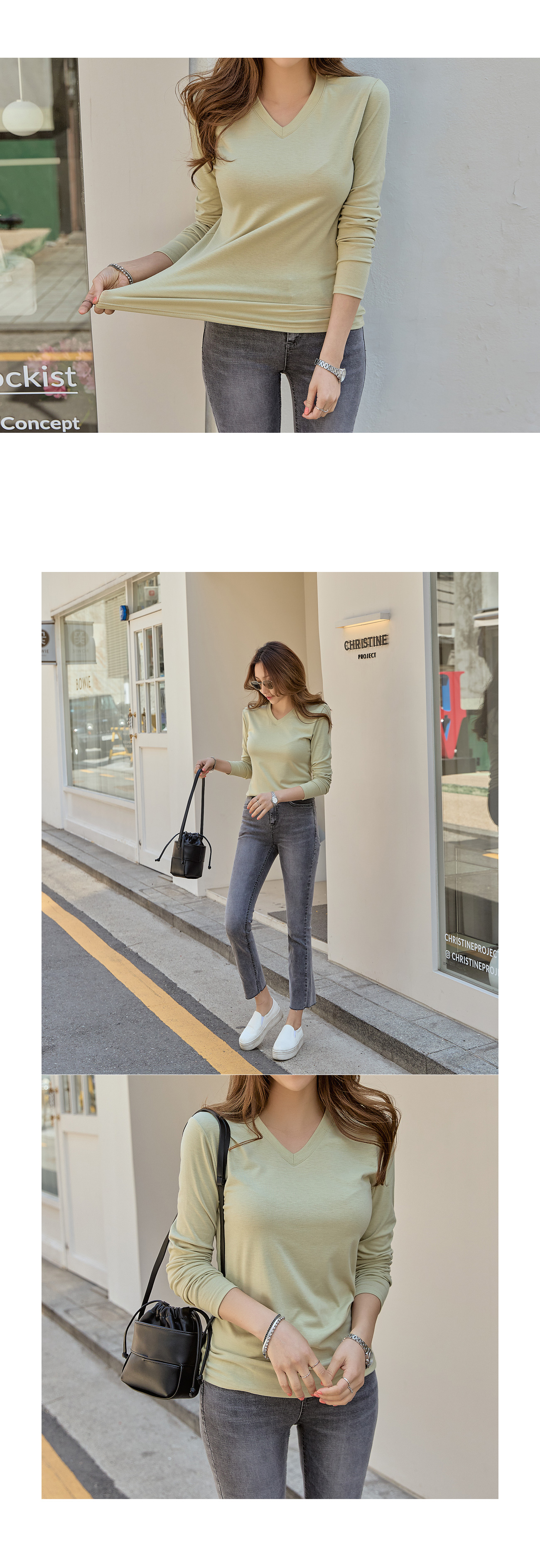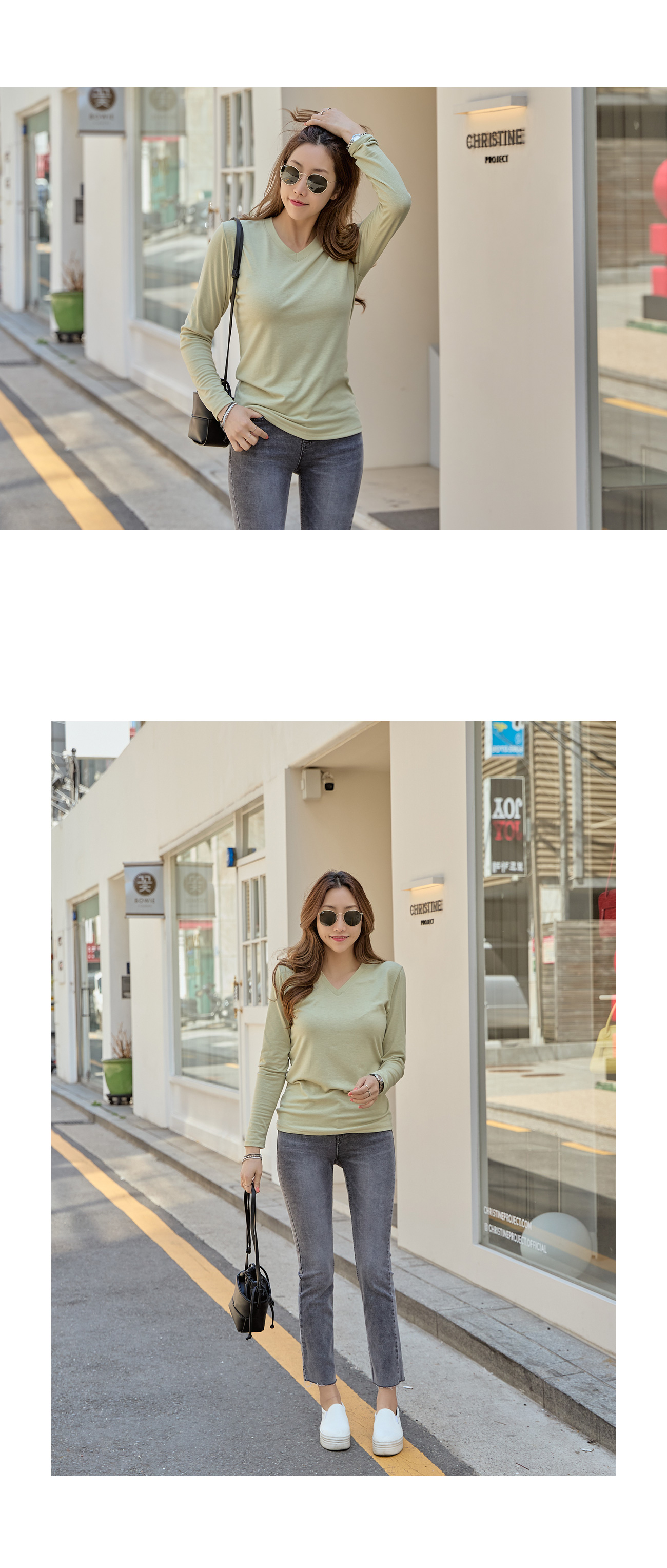 너무 깊지않은 브이넥으로 여리여리 해보이는 체형 효과와 함께