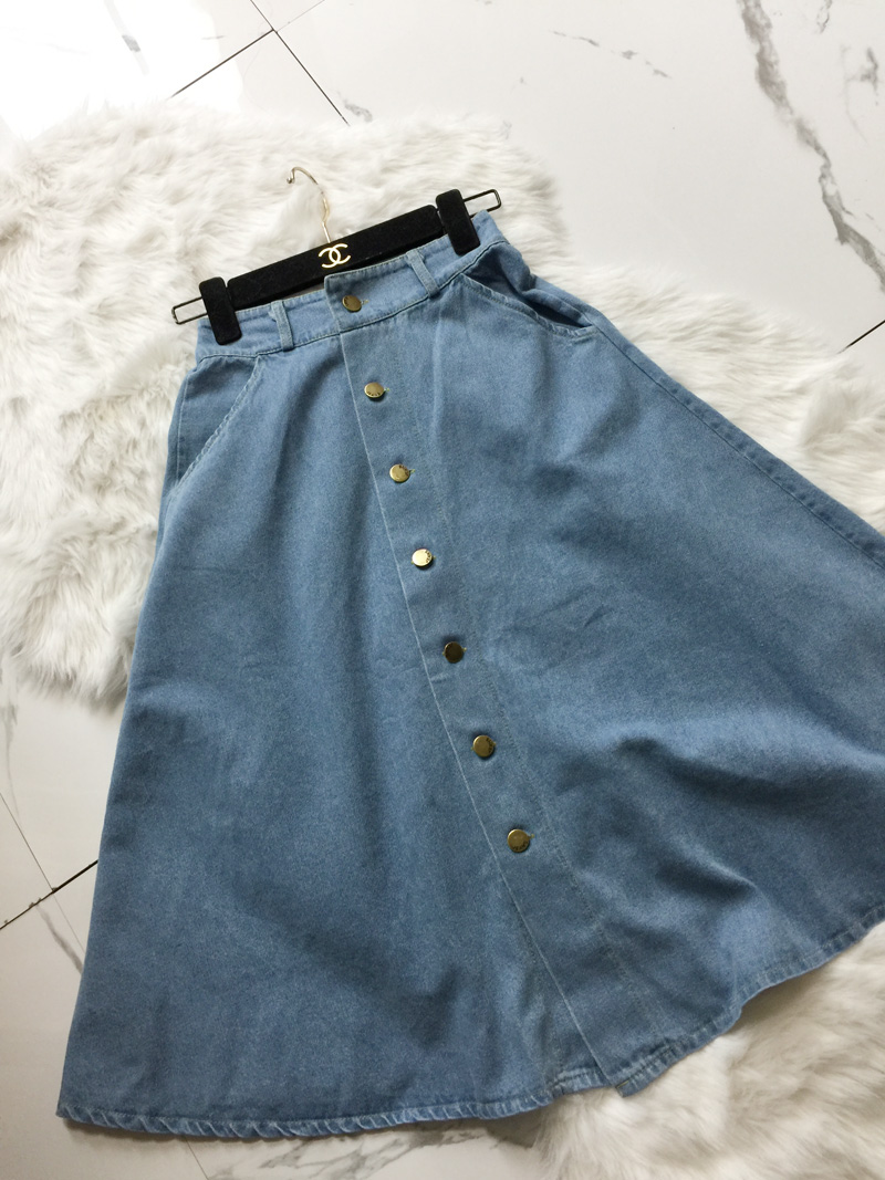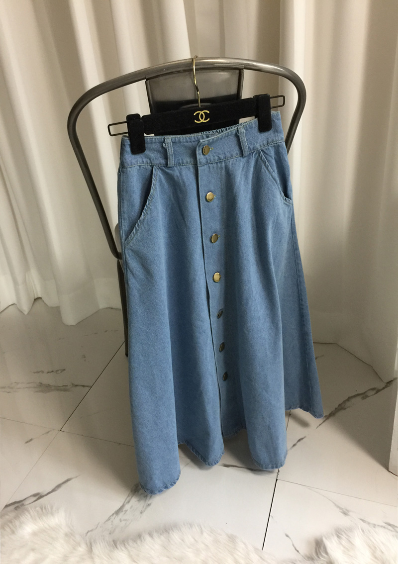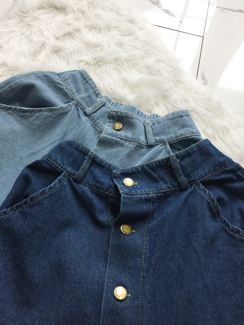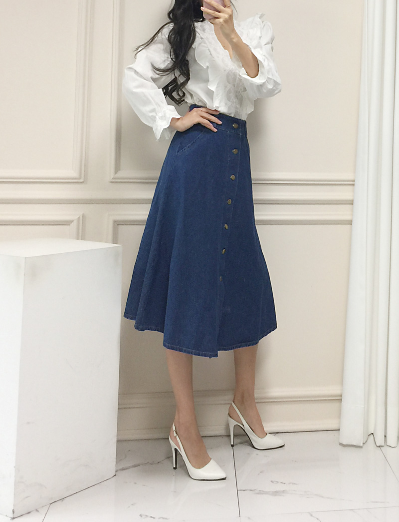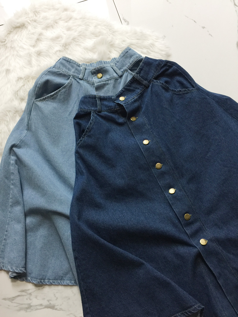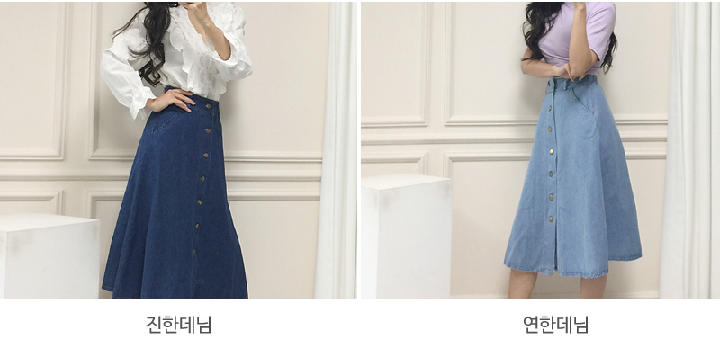 소르비 밴딩 버튼 데님 플레어 롱 스커트