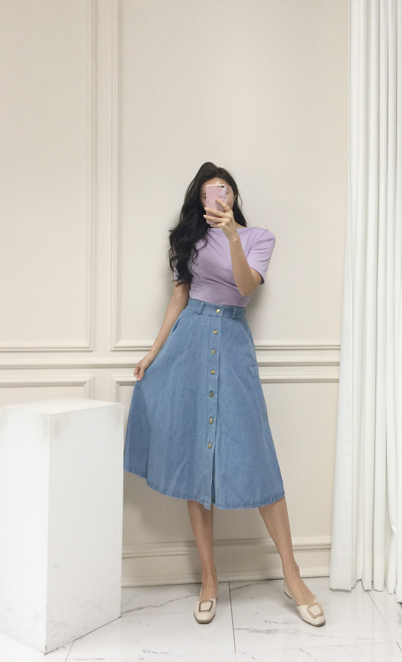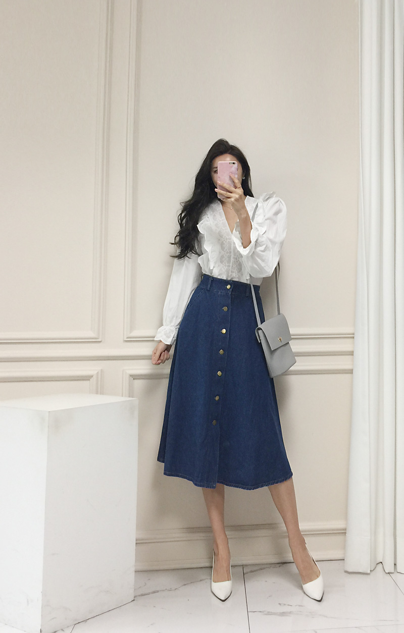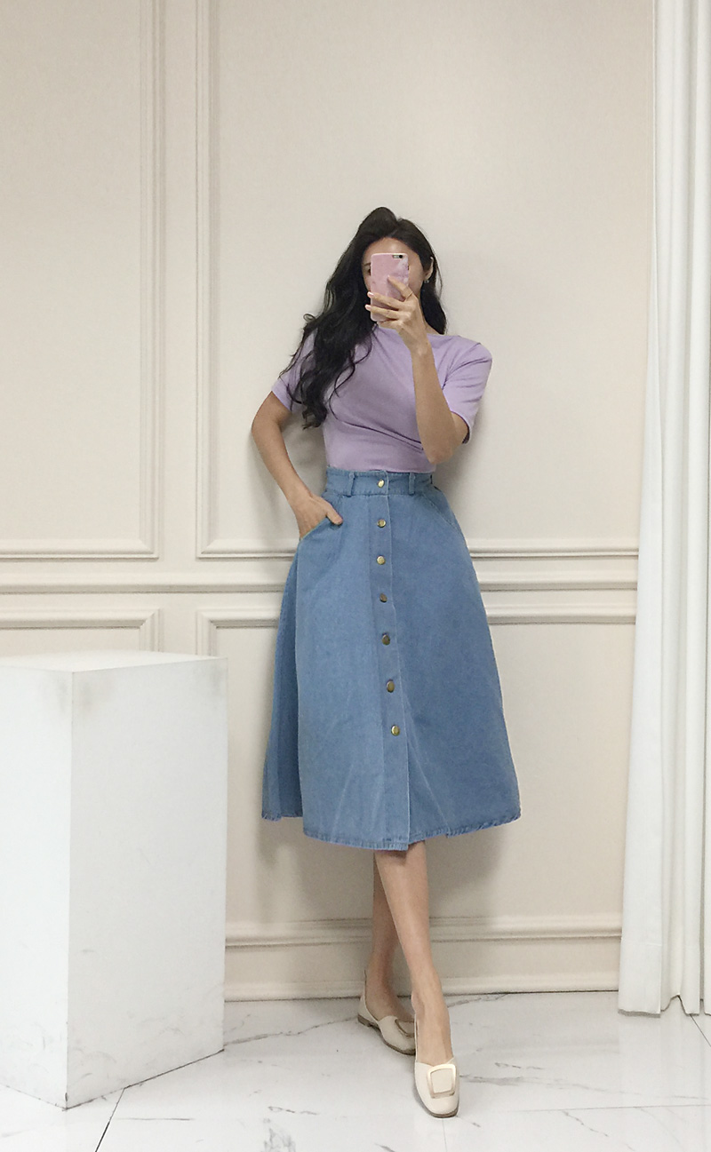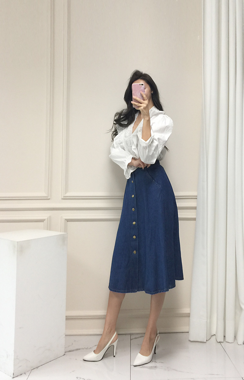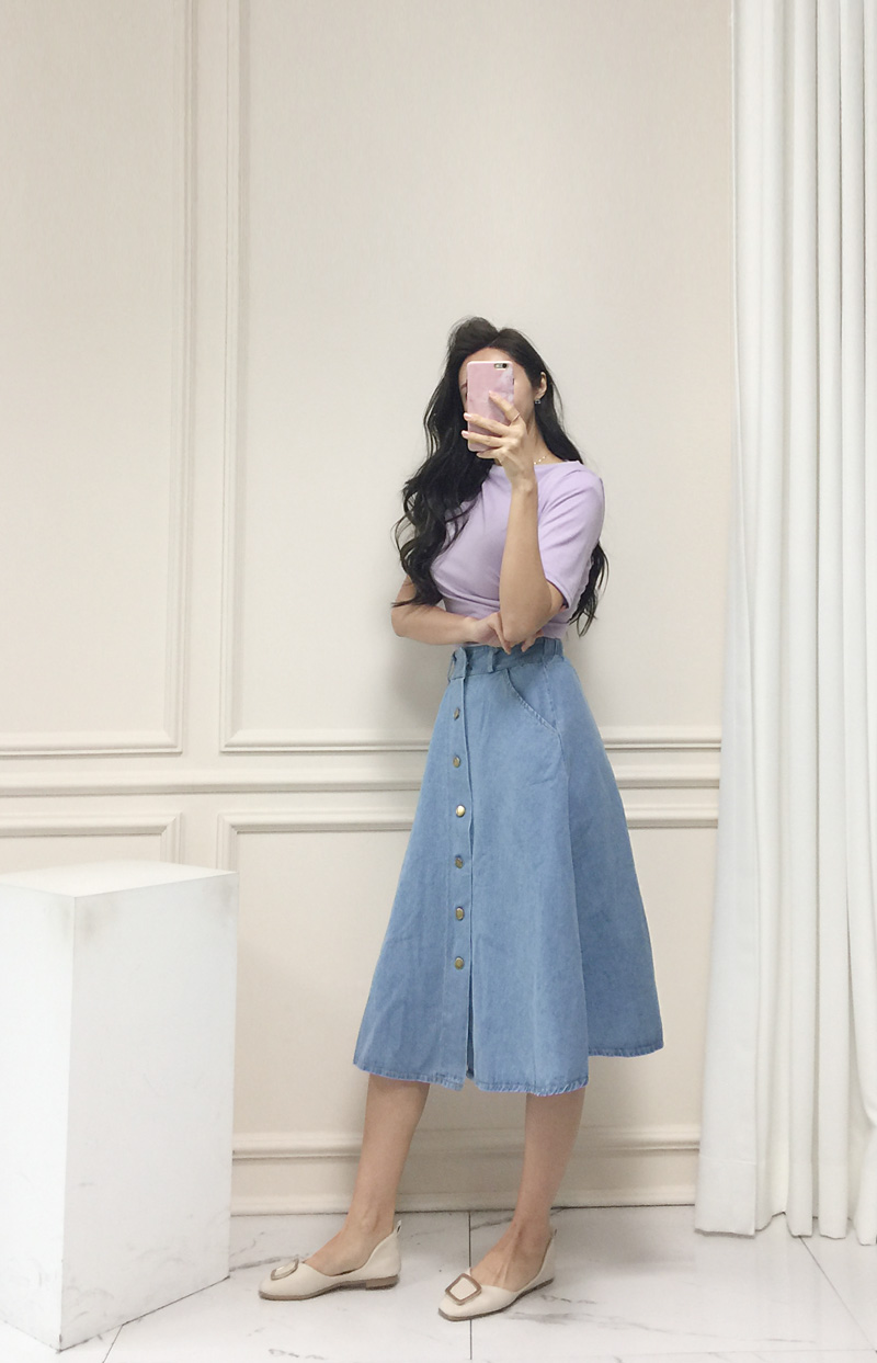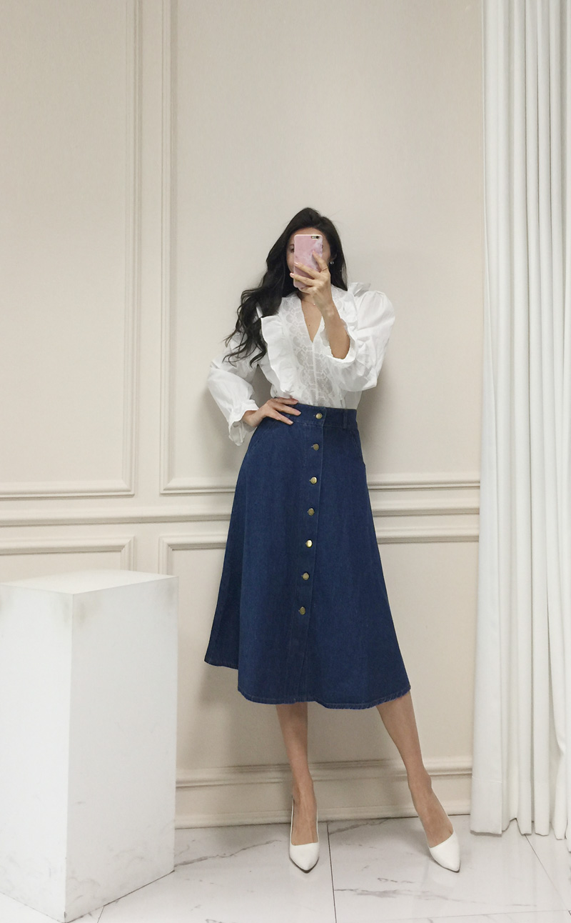 소르비 밴딩 버튼 데님 플레어 롱 스커트