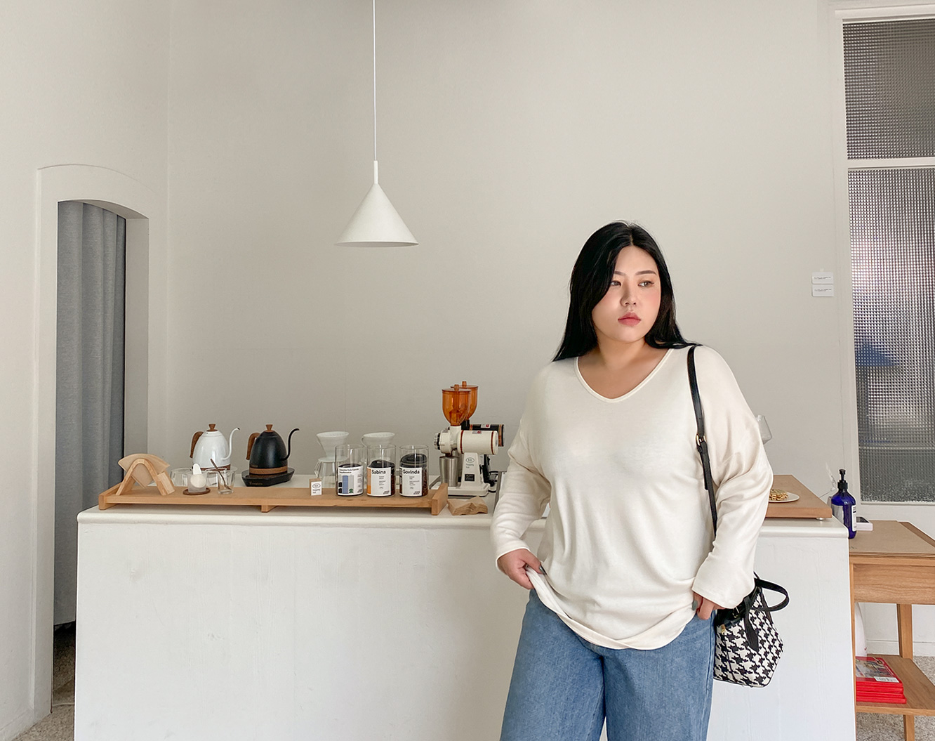 사지통통형으로 팔,다리가 통통하며 허리가 얇은 체형입니다.Hourglass body shape & Relatively plump arms and legs