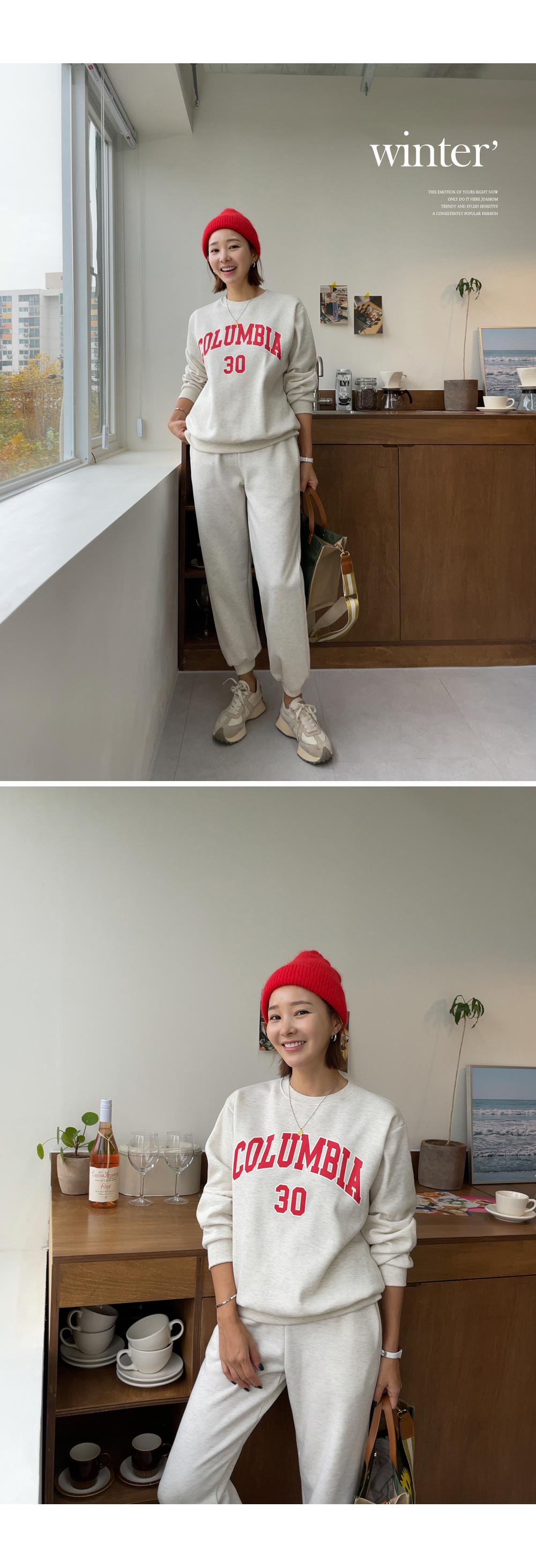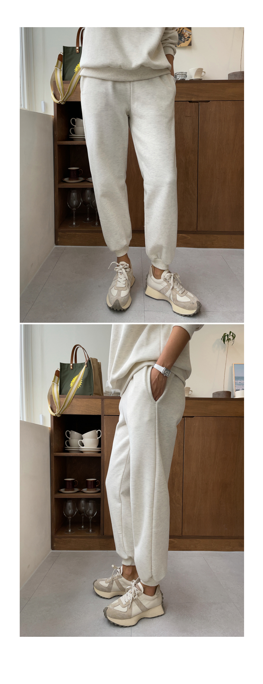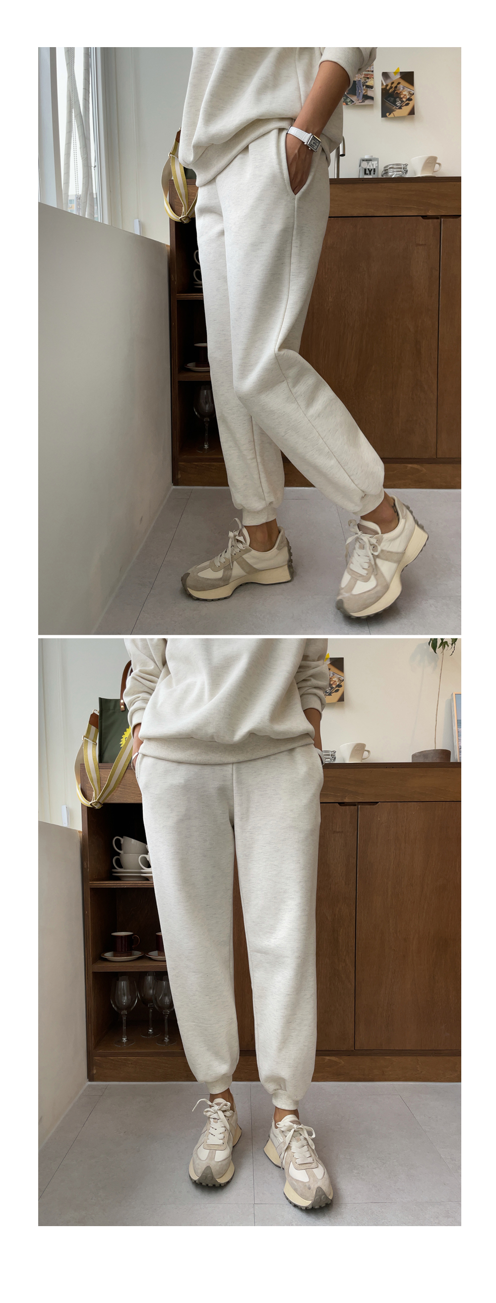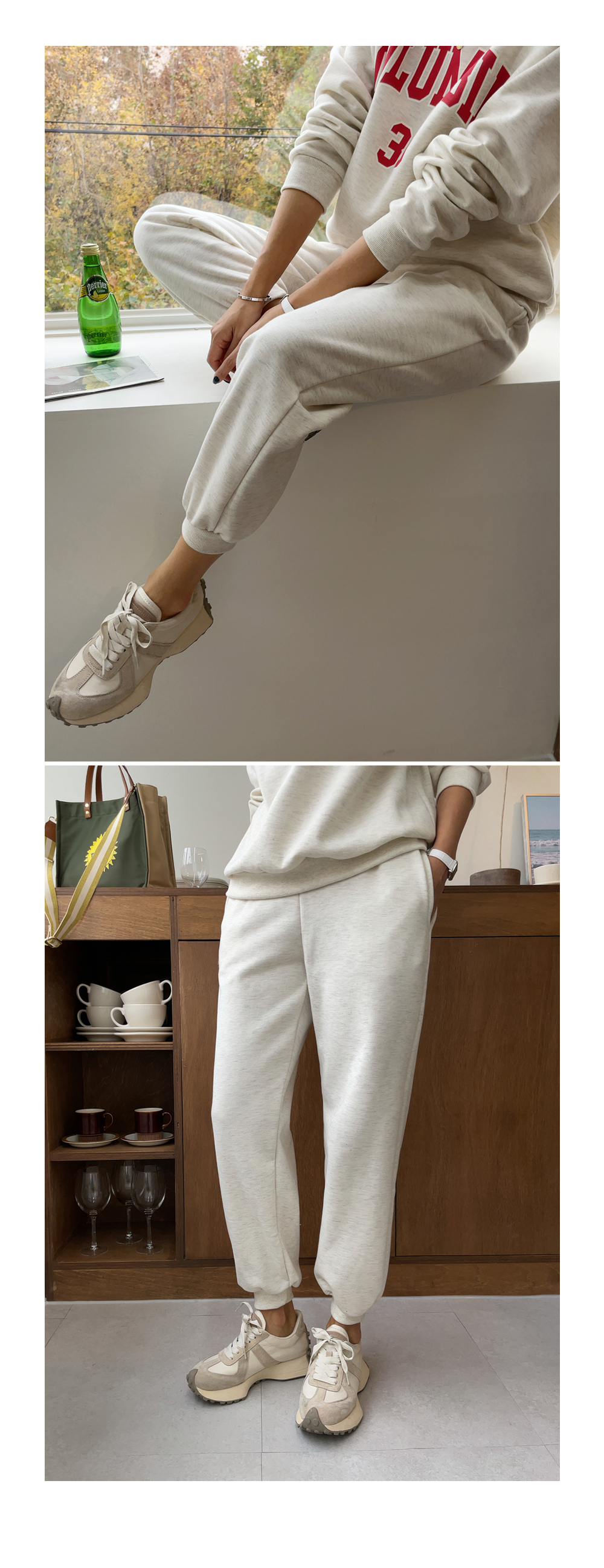깔끔하게 떨어지는 조거 팬츠가 세트로 구성되었구요.