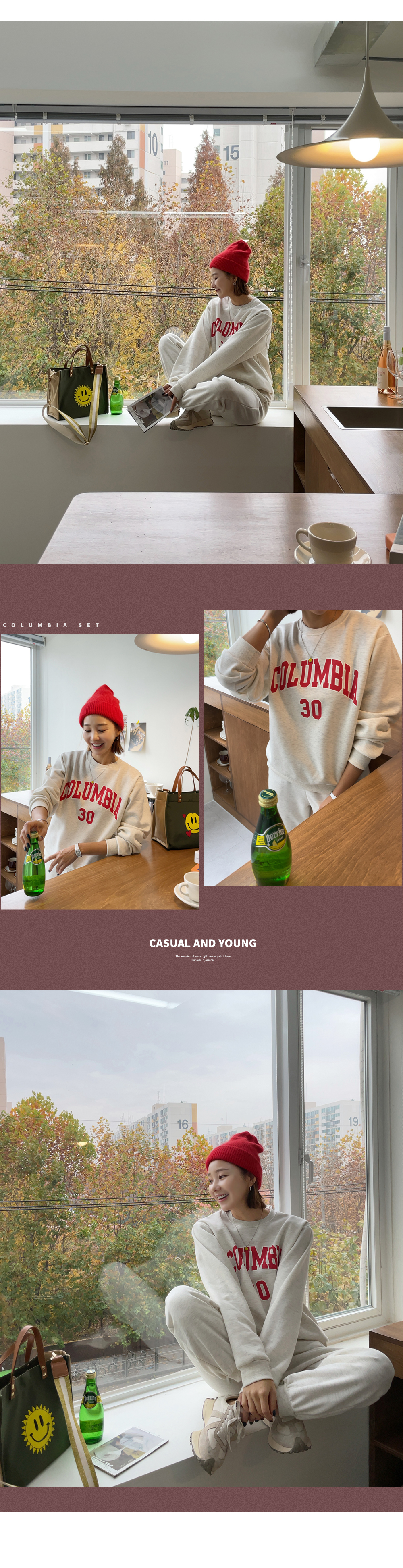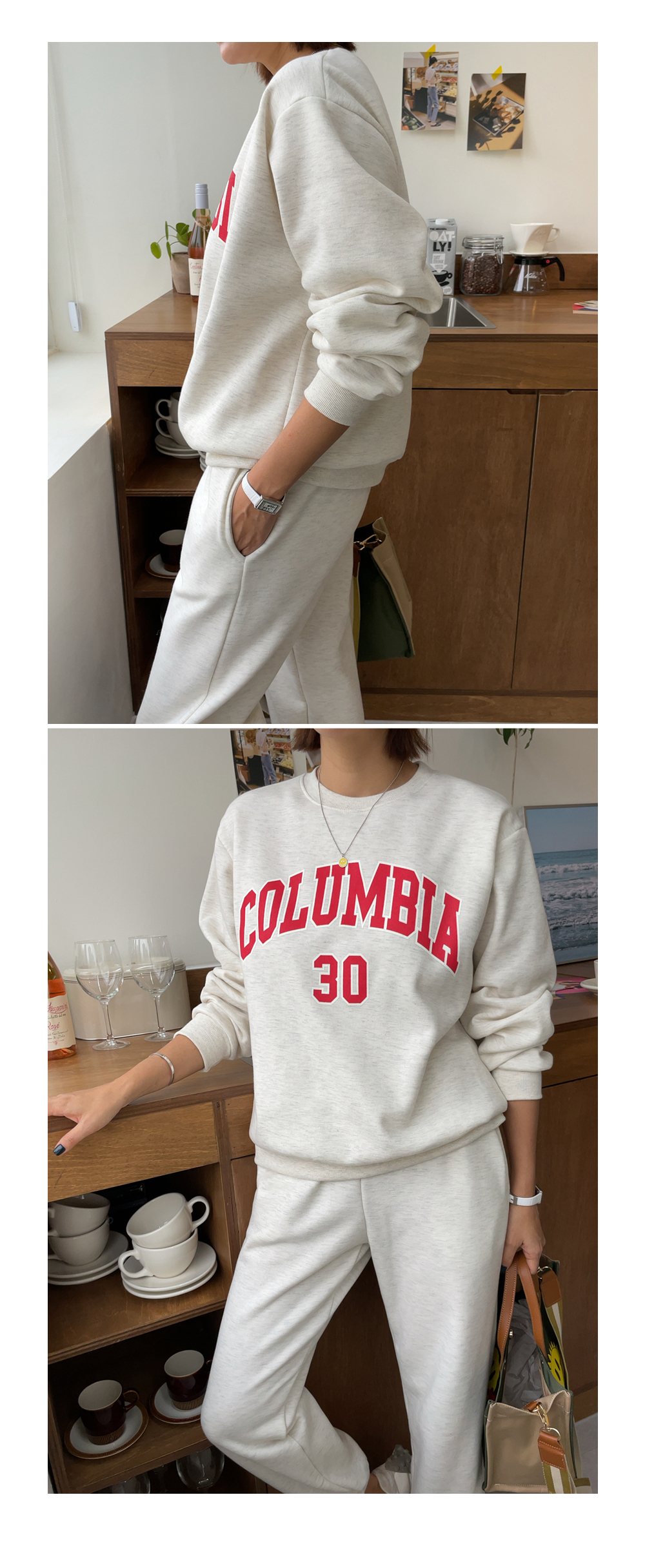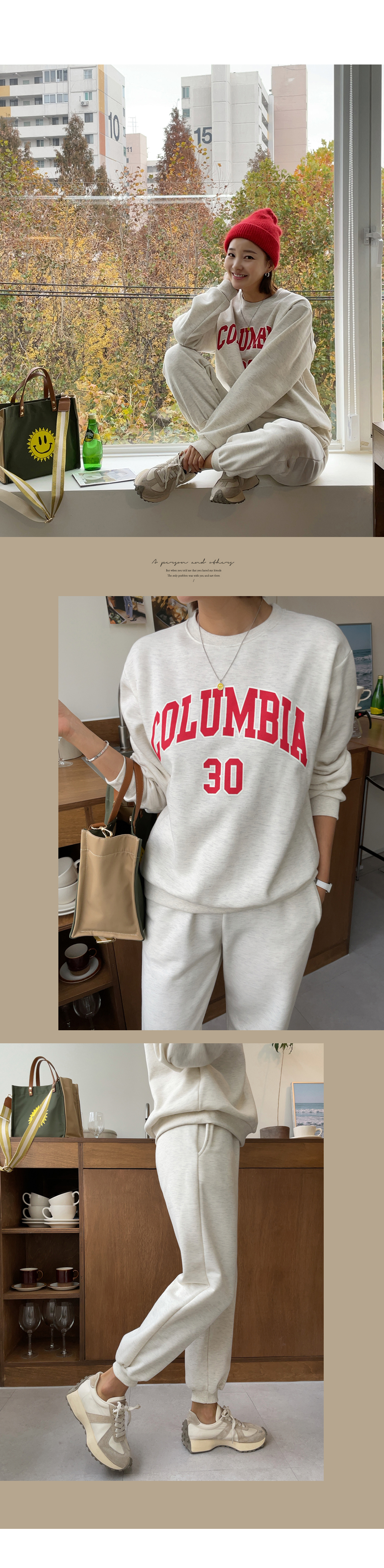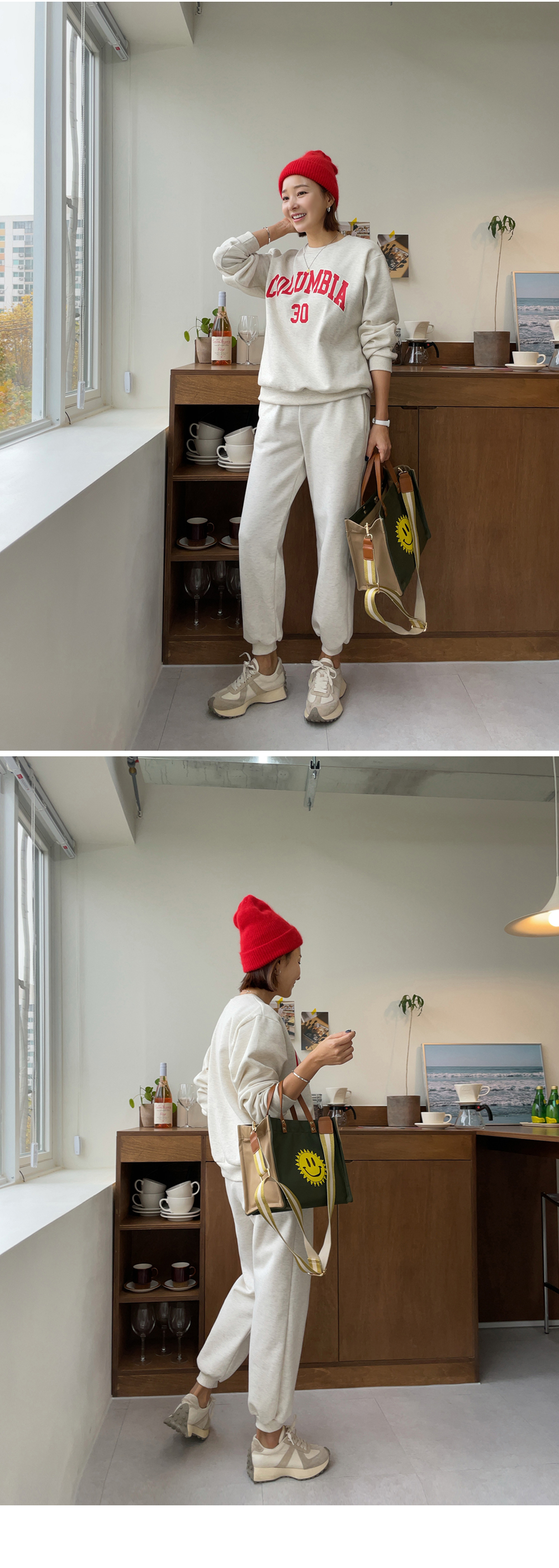 깔끔하게 떨어지는 조거 팬츠가 세트로 구성되었구요.