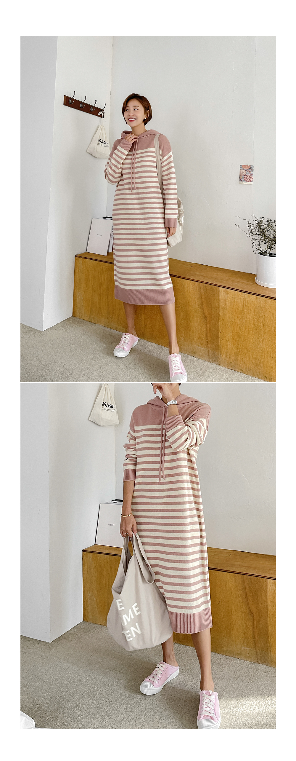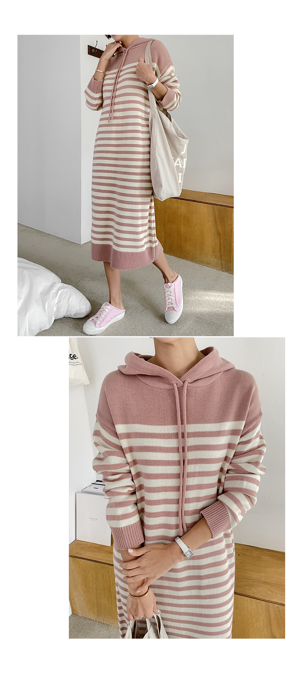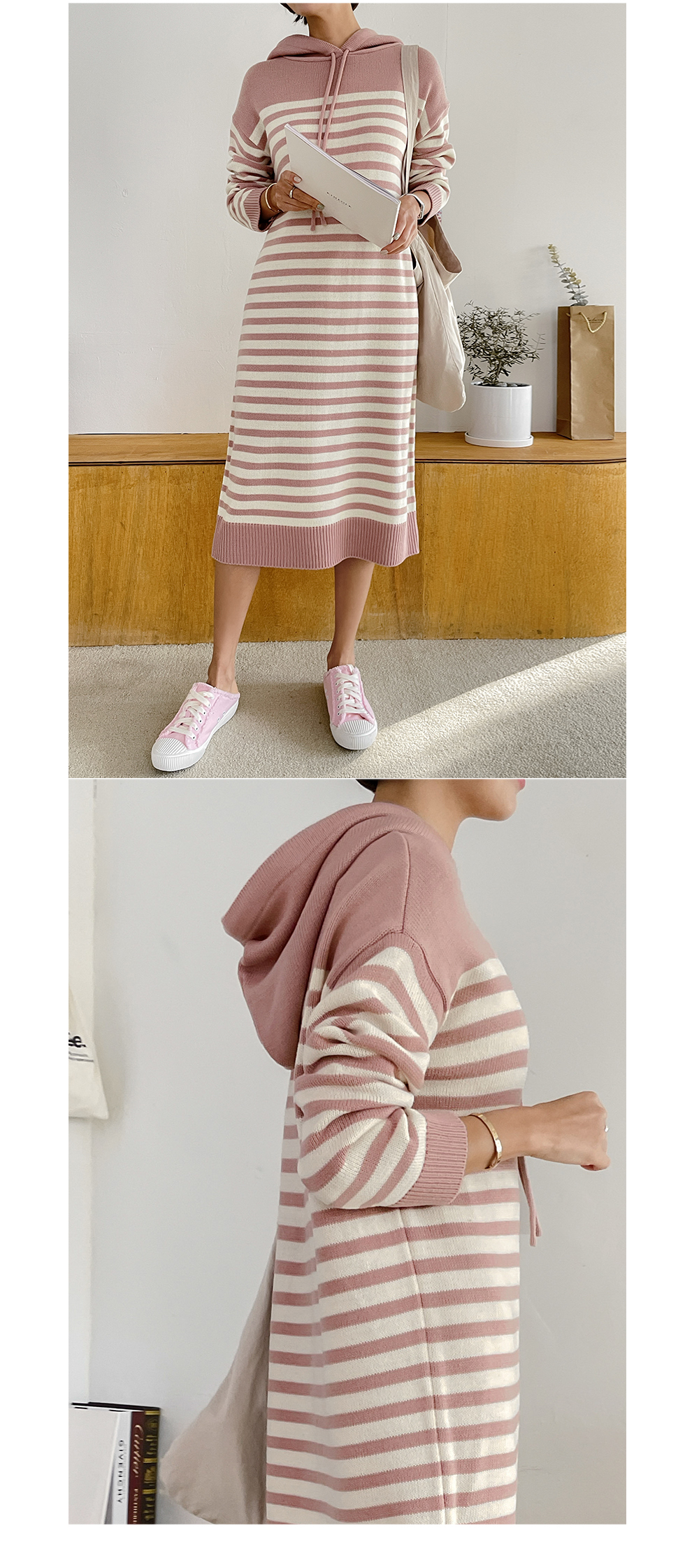 일자로 툭 차분하게 떨어지는 후드 니트 원피스에요.