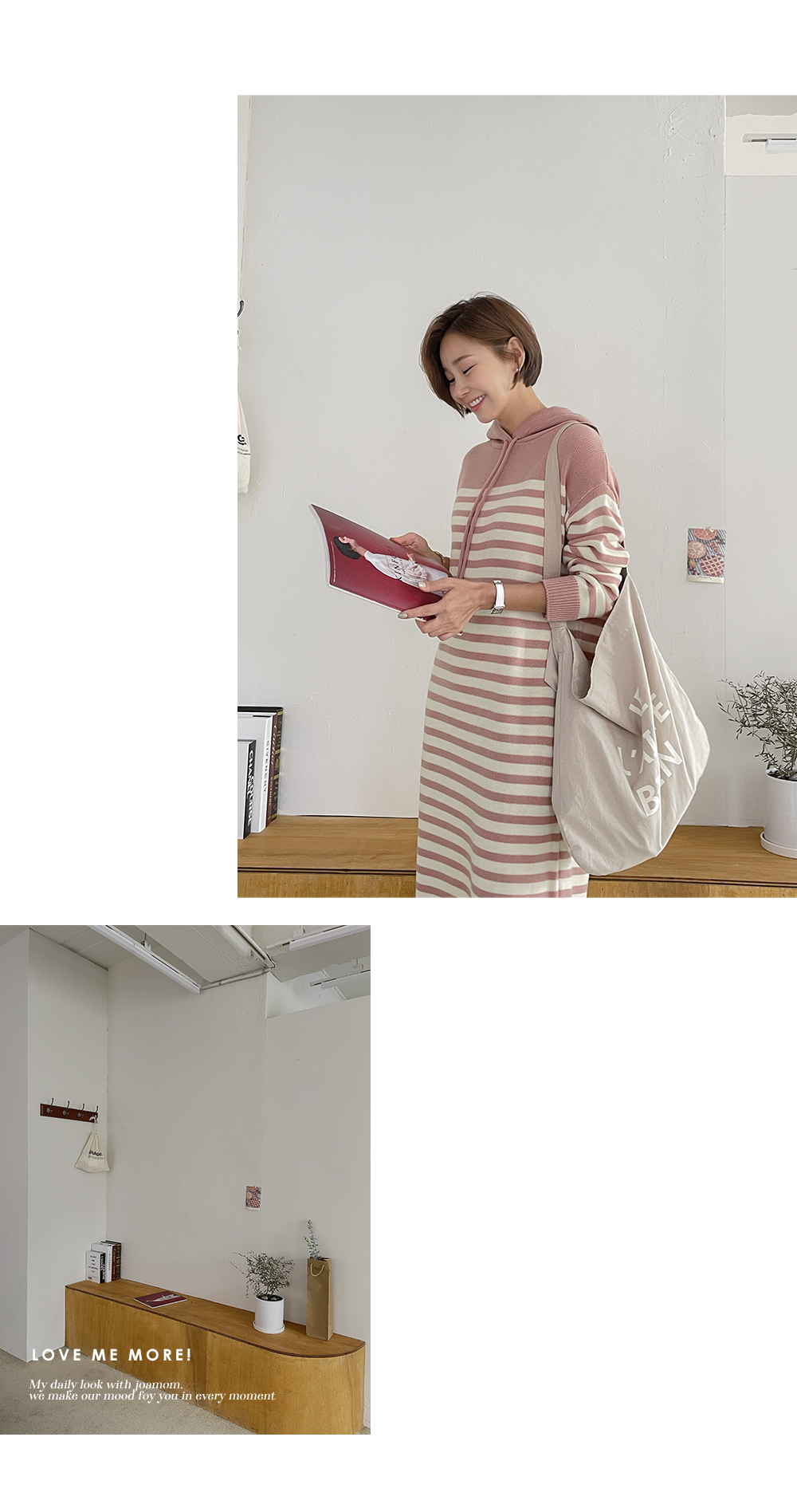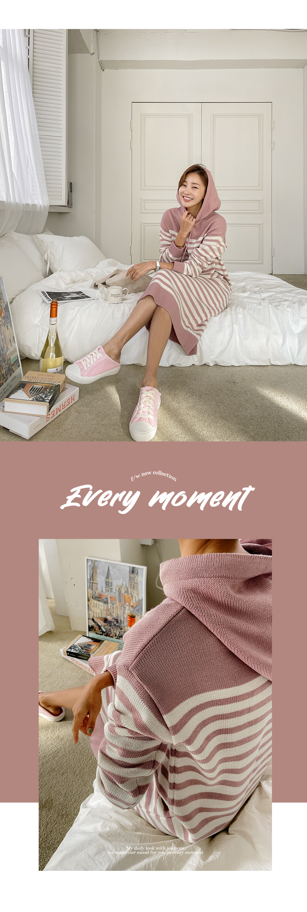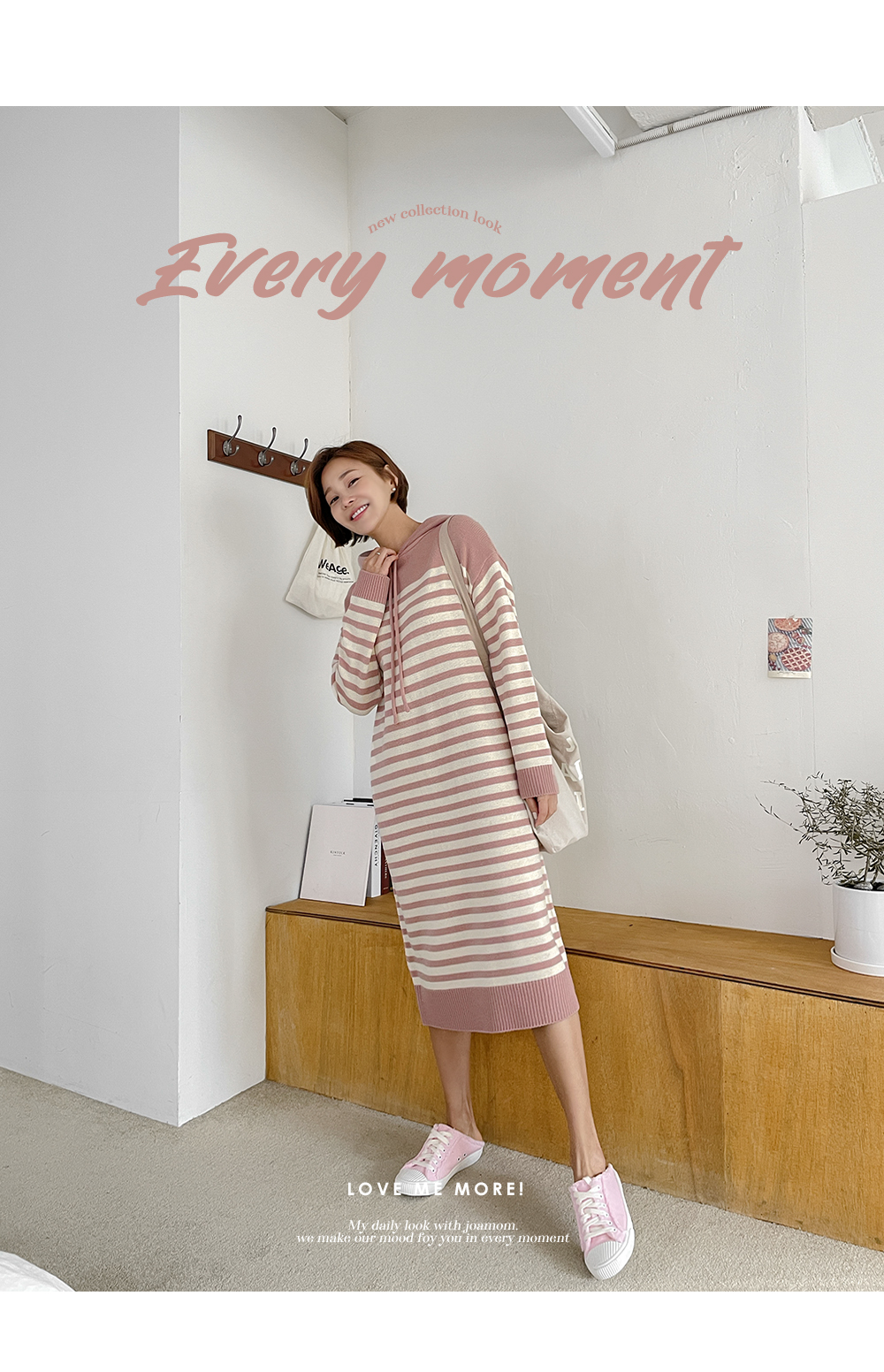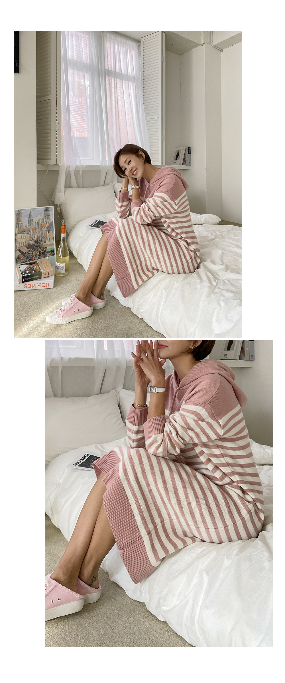 일자로 툭 차분하게 떨어지는 후드 니트 원피스에요.