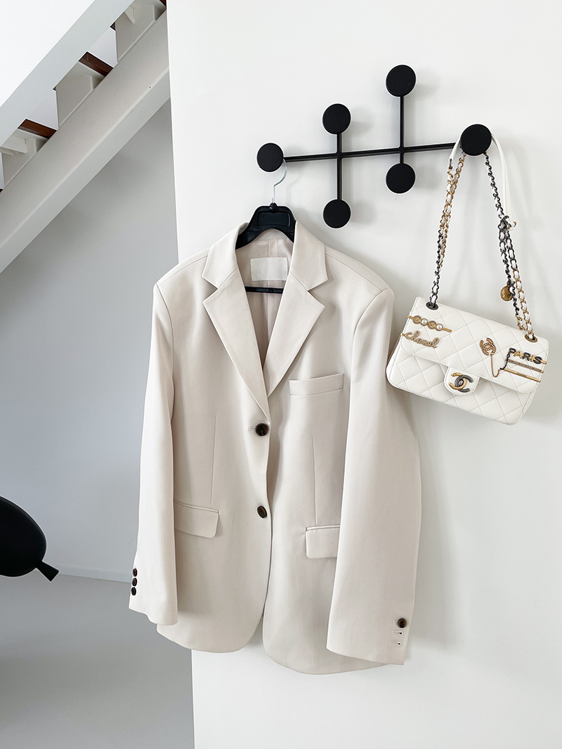 어깨패드로 어깨라인을 살려주고 간절기에 입기 좋은 두께감으로