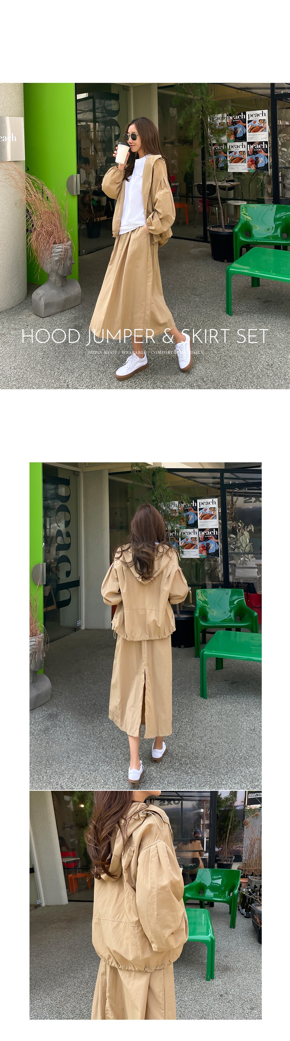 따로 또 같이 자유롭게 스타일링이 가능한 후드 점퍼+스커트 세트입니다.