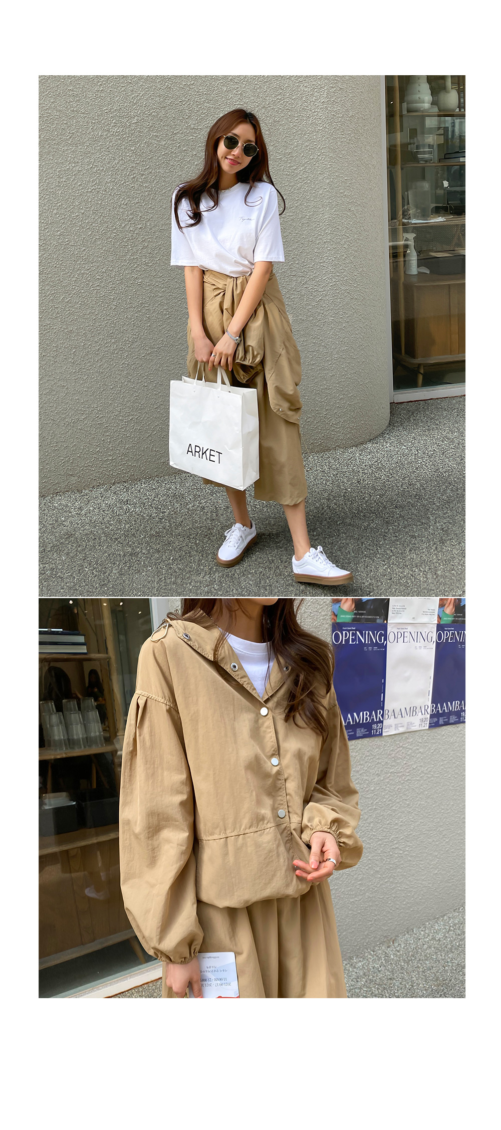 단품 아우터로도 손색없는 점퍼 스타일의 상의는 캐주얼한 후드 스타일로