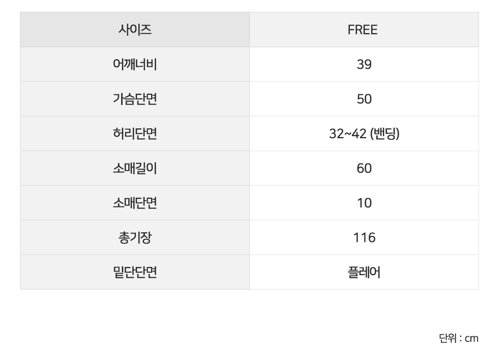 소매길이60 소매단면10 밑단단면(플레어) 총기장116