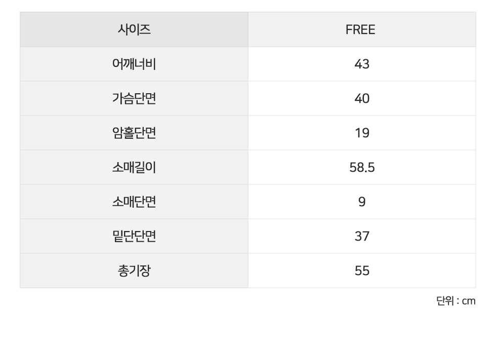 소매길이58.5 소매단면9 밑단단면37 총기장55