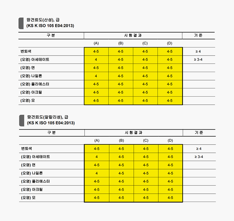 인체에서 배출되는 땀에 의한 변색이나 이염 내구성이 높아