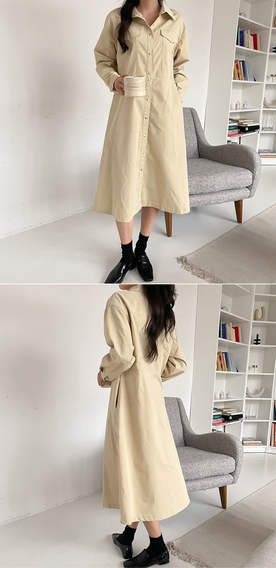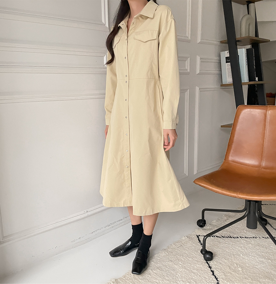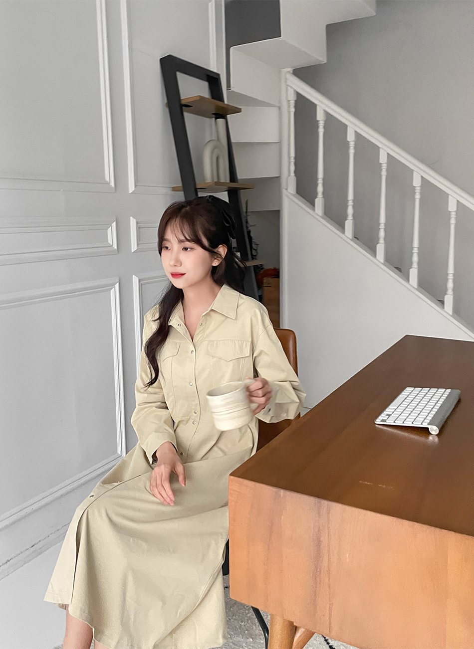 Roaming Pocket Collar One Piece-2color, Tangy Textured Touch-Tick Button, Calm Long Dress - Style Tiva