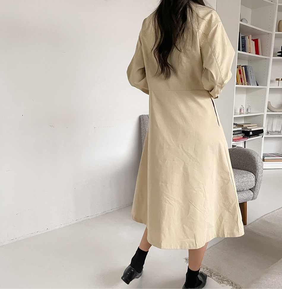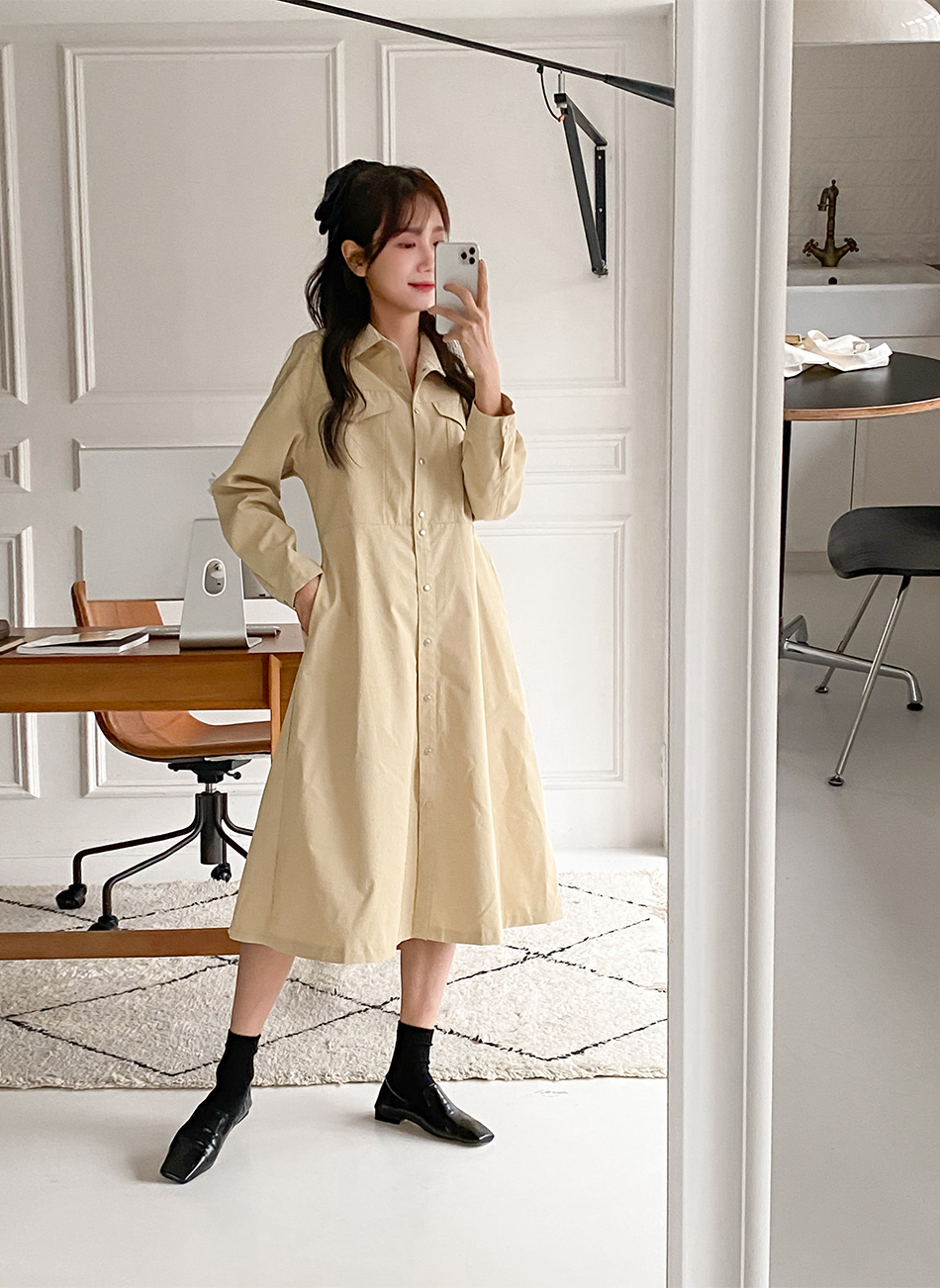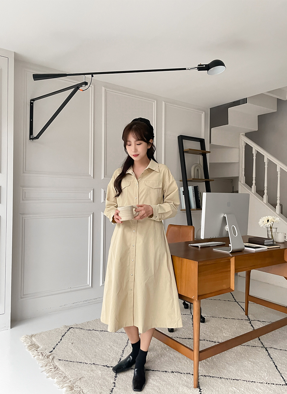 Roaming Pocket Collar One Piece-2color, Tangy Textured Touch-Tick Button, Calm Long Dress - Style Tiva