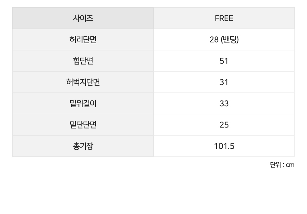 FREE 허리단면28(밴딩) 힙단면51 허벅지단면31