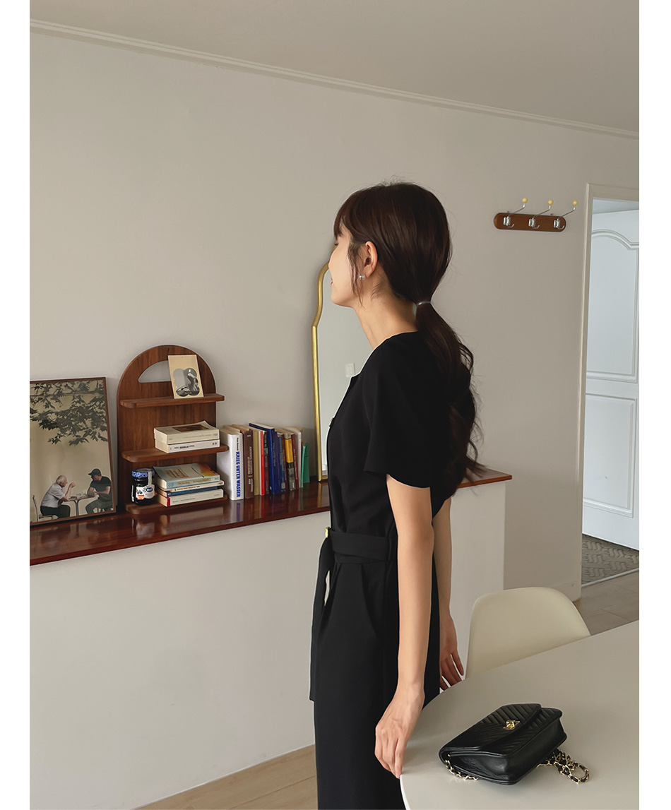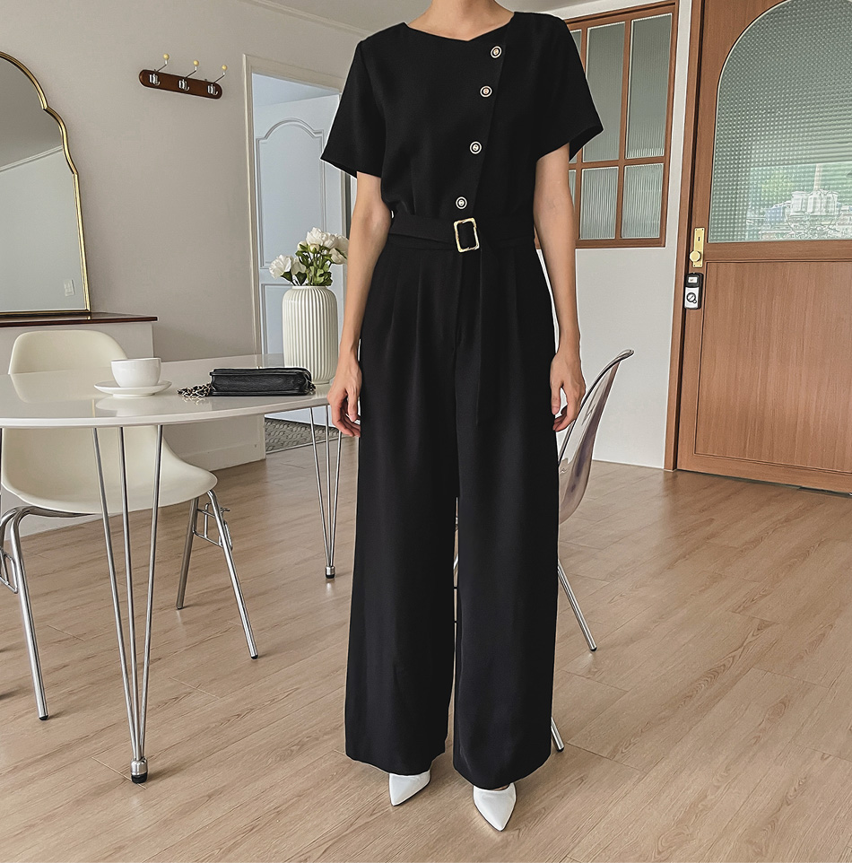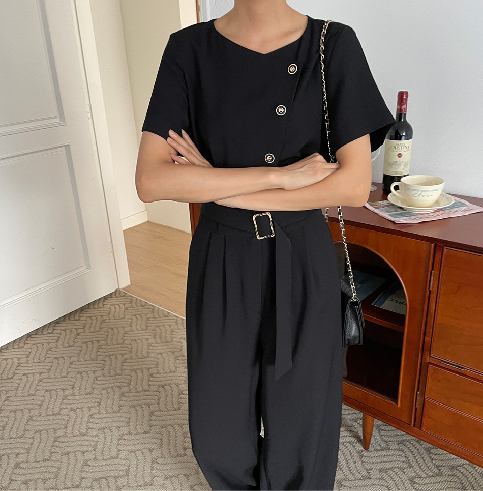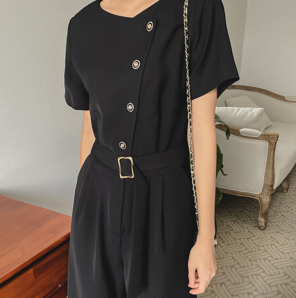 Lea diagonal button belt jumpsuit-2color, mature and feminine mood-Easy jumpsuit without worrying about coordination!!-Banding the back of the waist, slimmer body line -Style tee