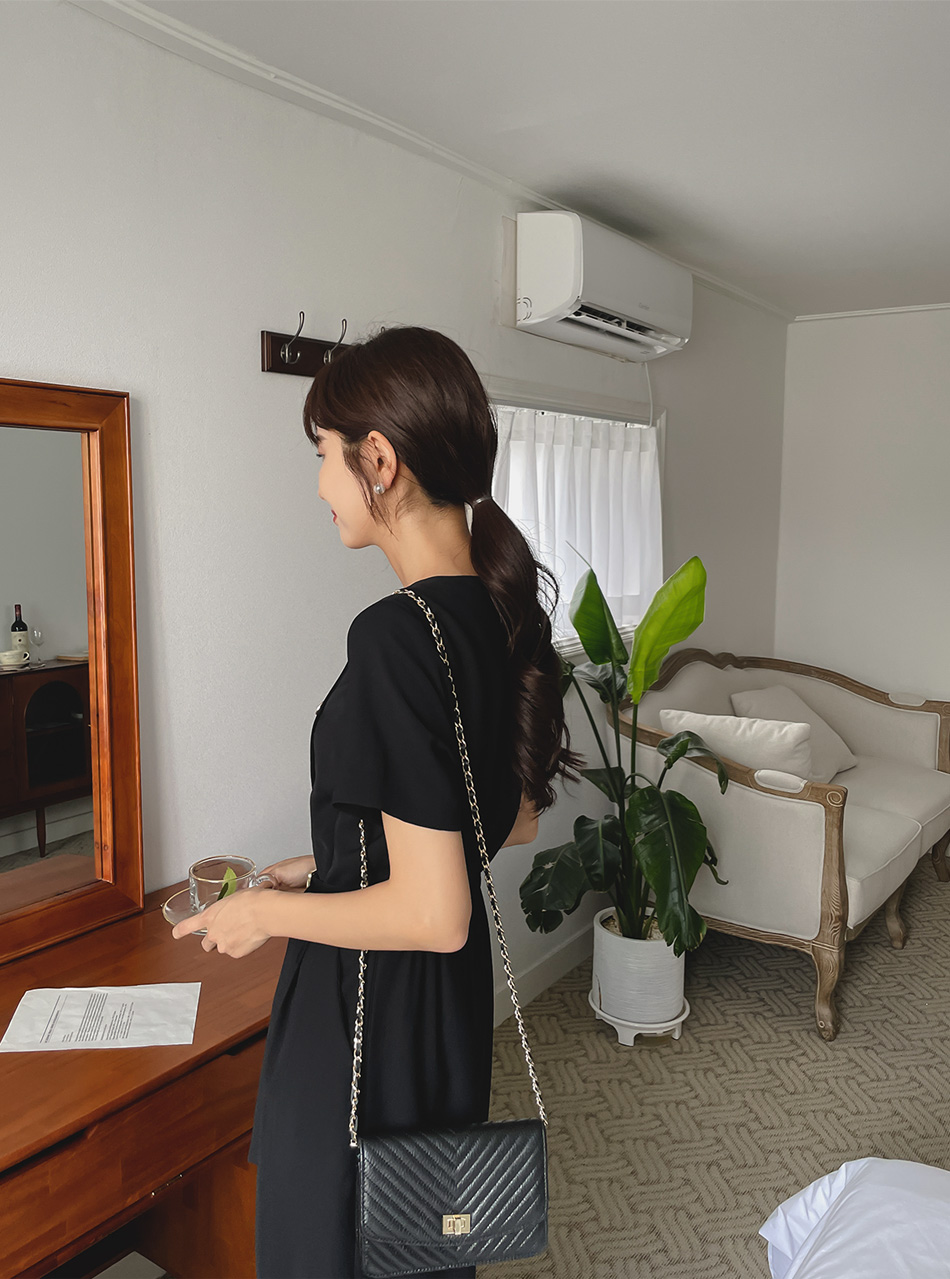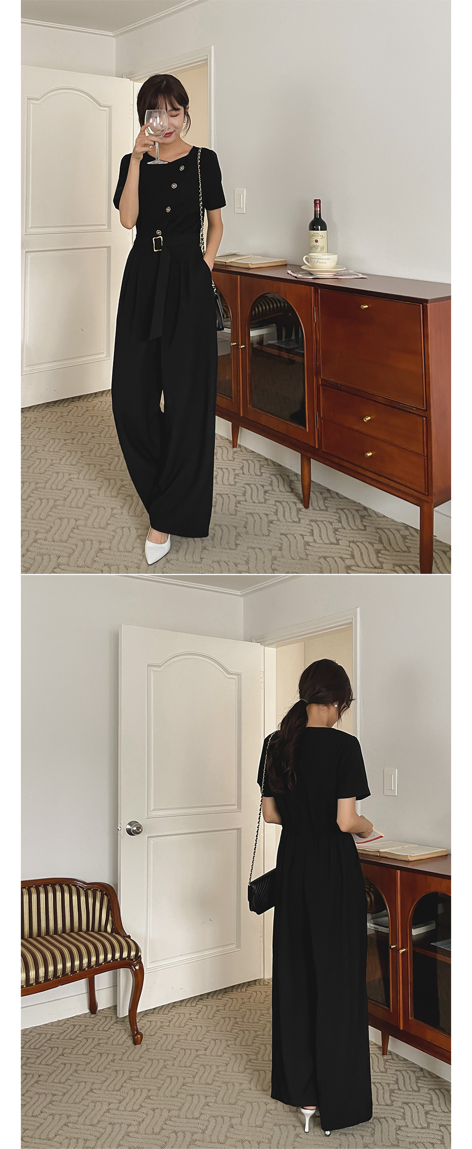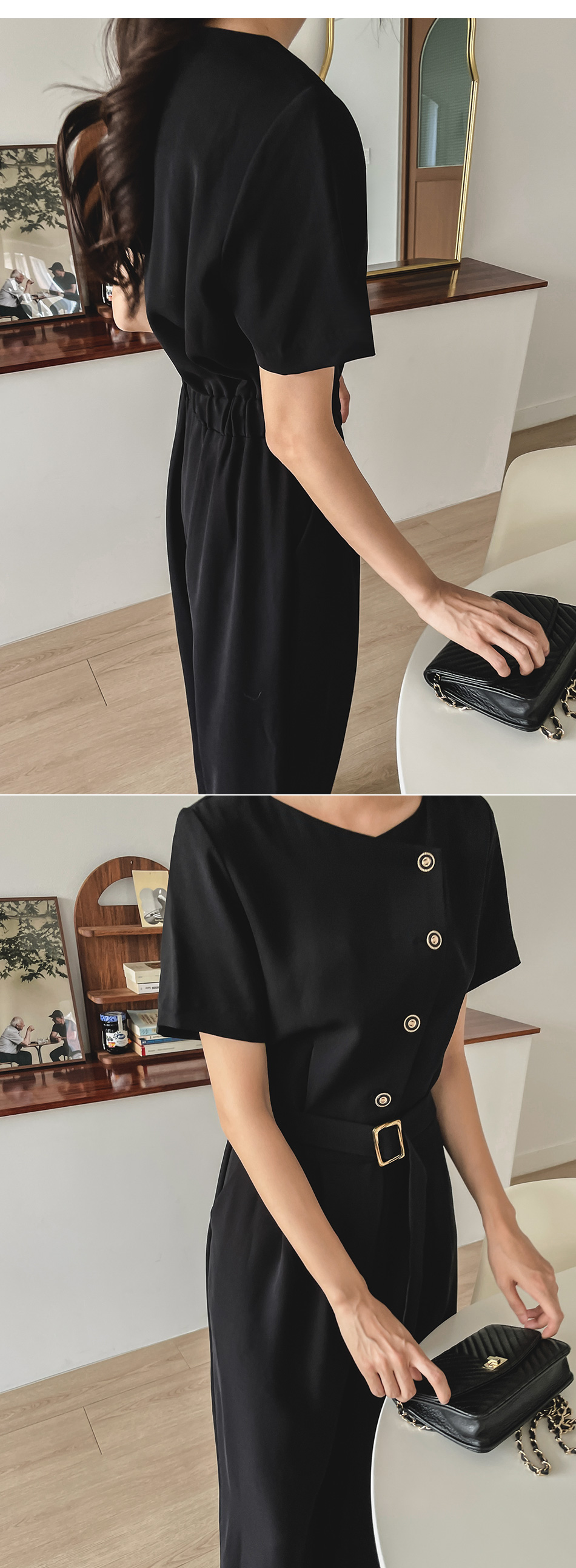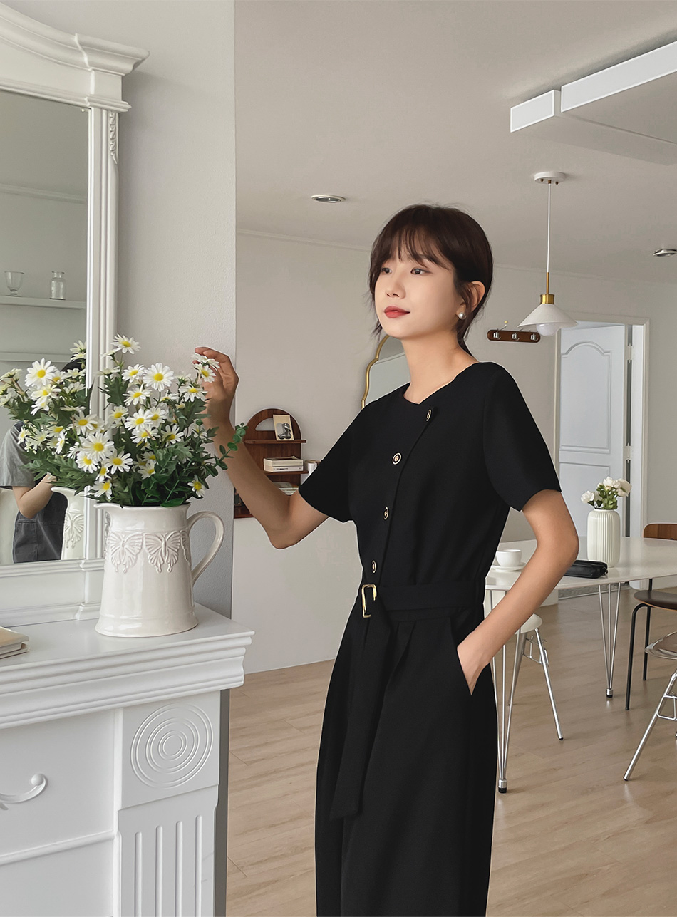 Lea diagonal button belt jumpsuit-2color, mature and feminine mood-Easy jumpsuit without worrying about coordination!!-Banding the back of the waist, slimmer body line -Style tee