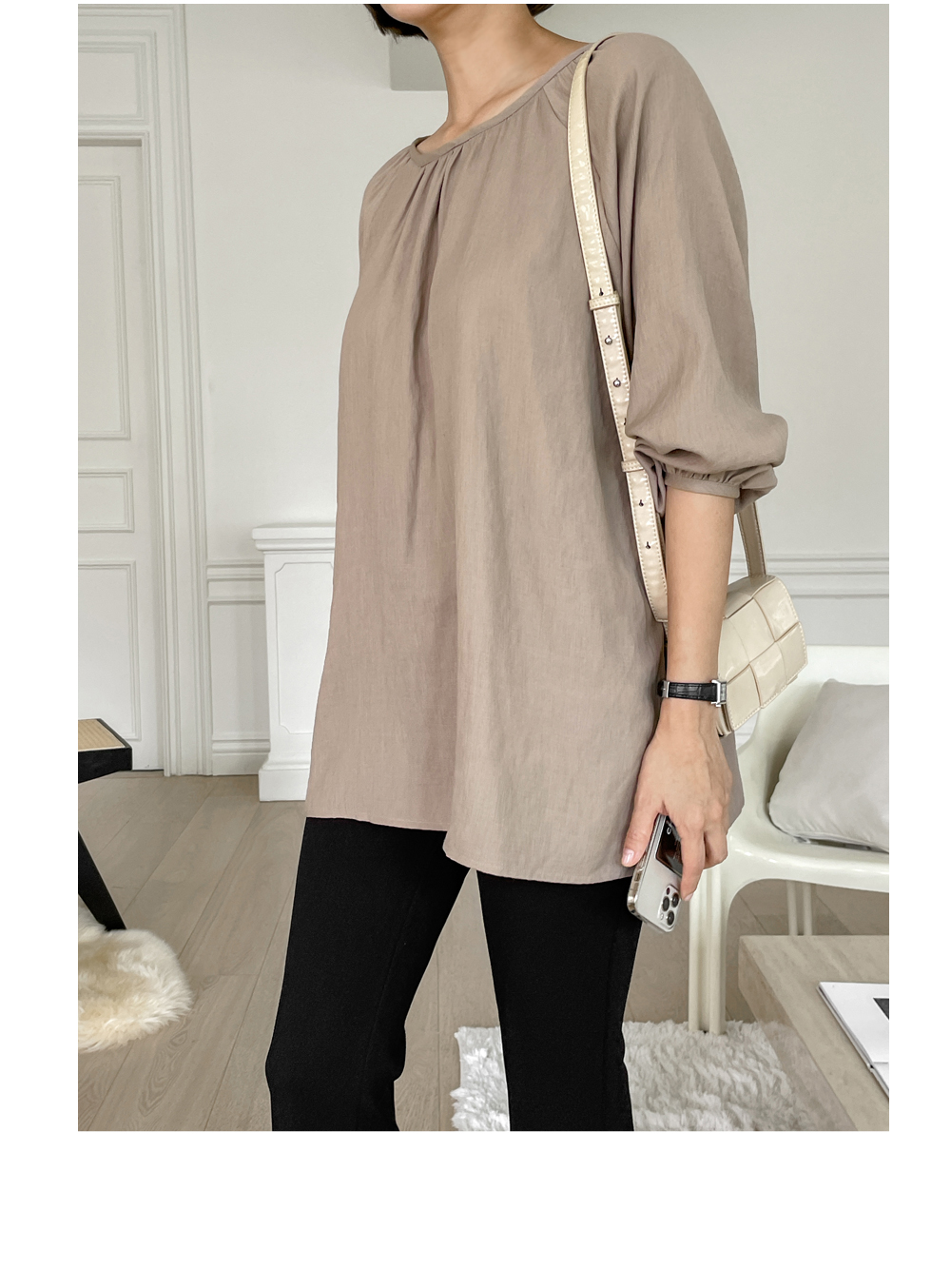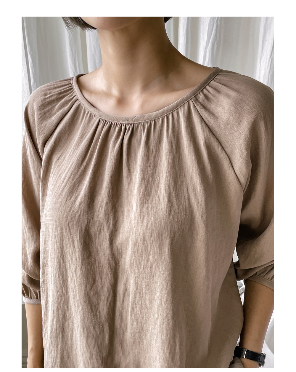넥라인 아래로 더해진 촘촘한 셔링 디테일이