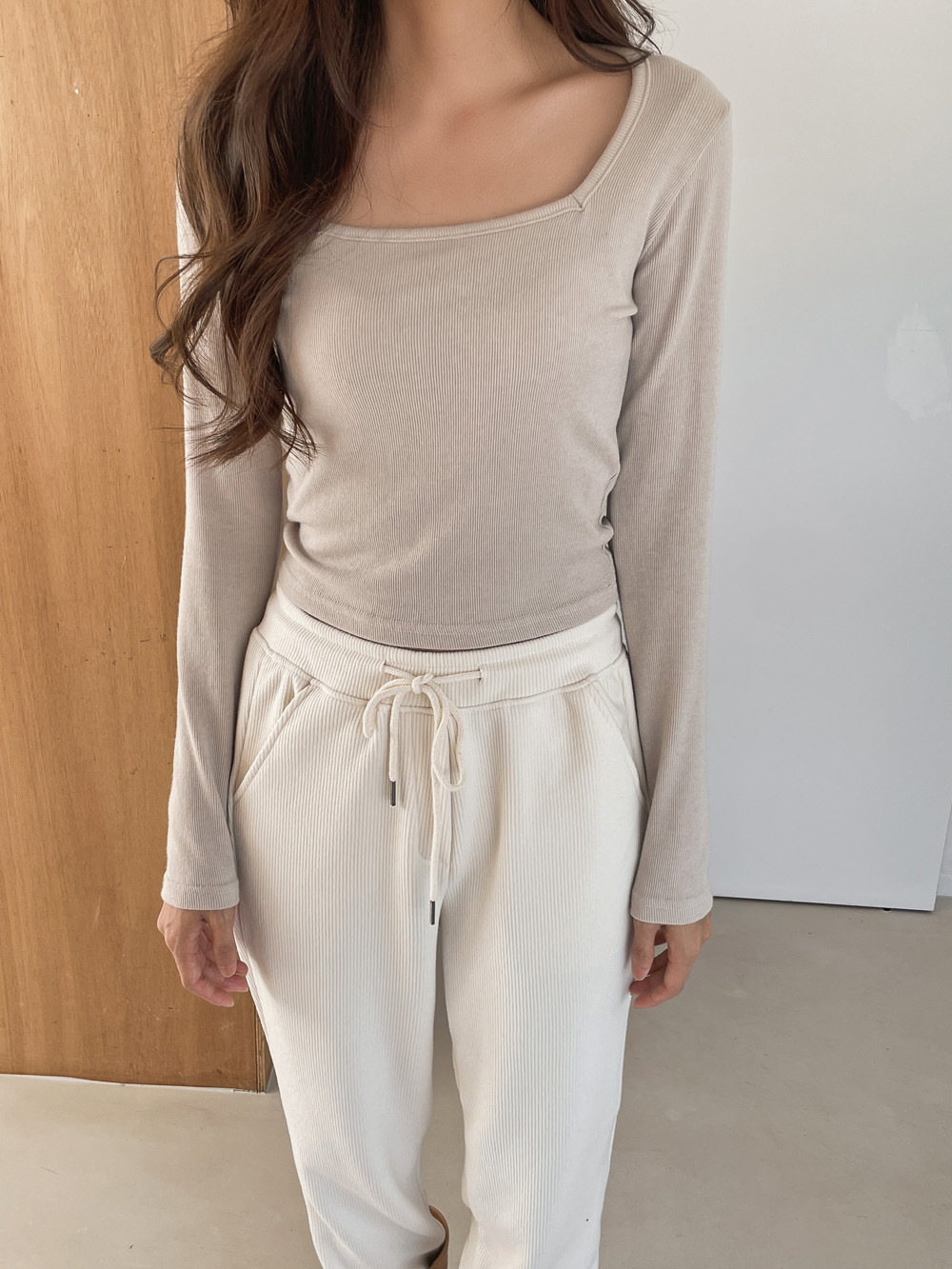 Via square ribbed long sleeve tee - 3color, with inner sook~ - Clavicle is exposed softly - Slim fit that holds the body line - Style tee