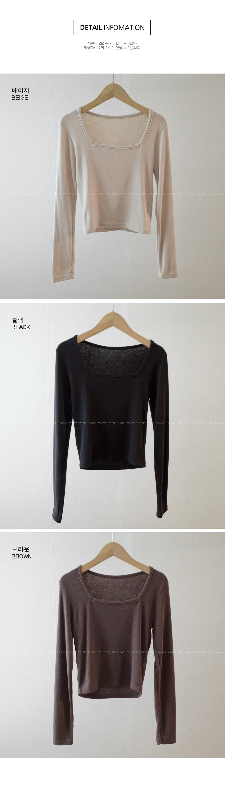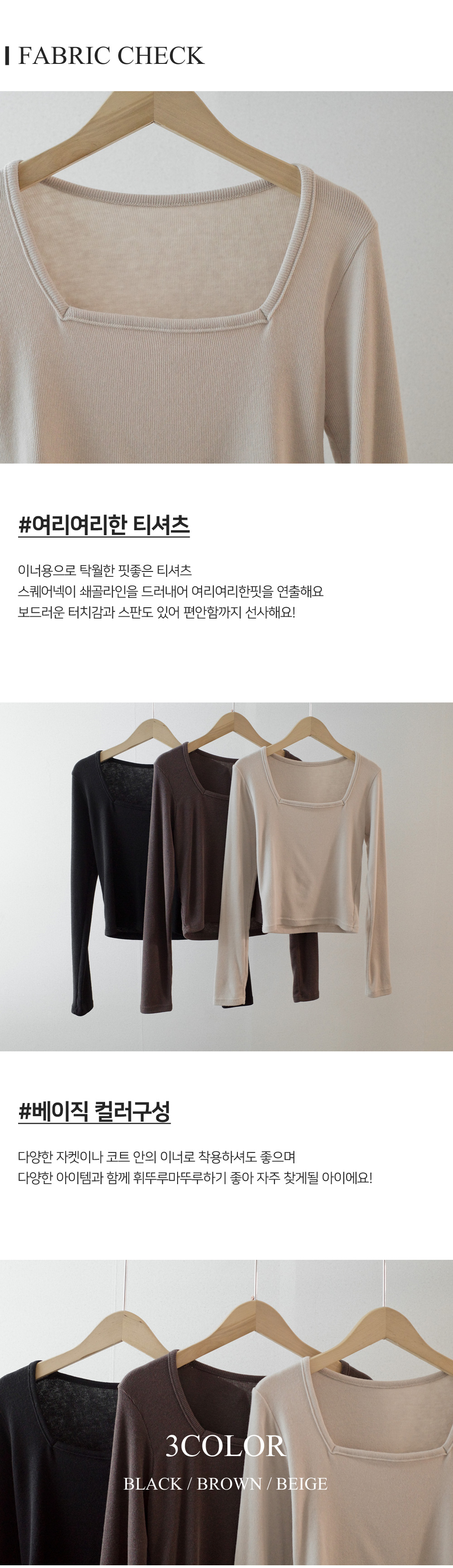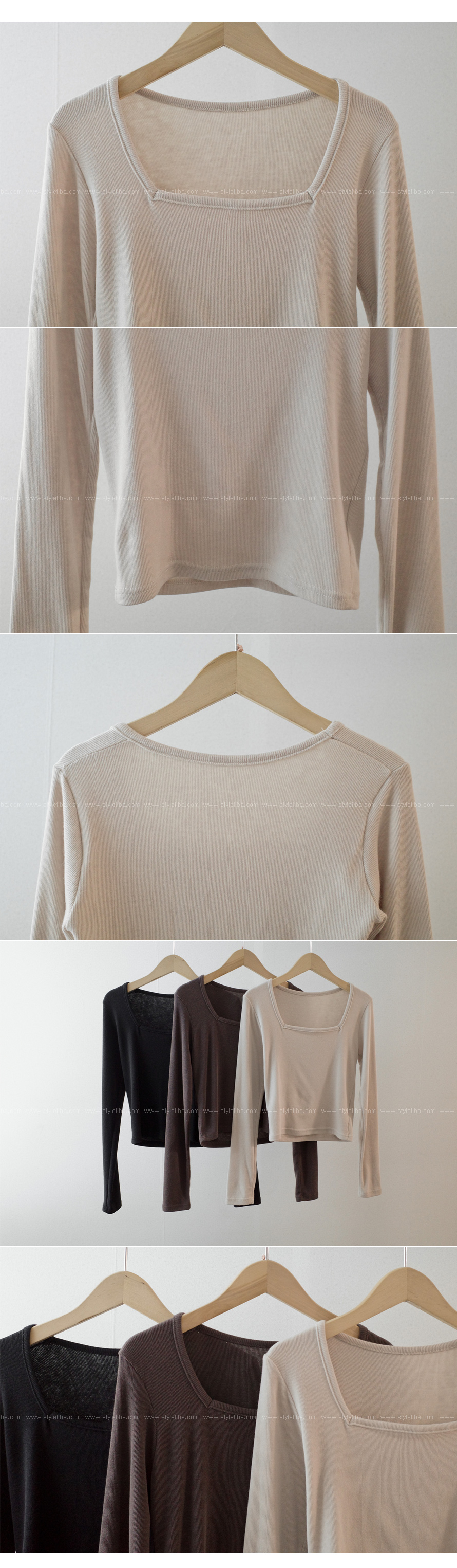 비아 스퀘어 골지긴팔티-3color,이너로 쏘옥~-쇄골이 은은하게 드러나 여리여리-바디라인을 잡아주는 슬림핏 - 스타일티바