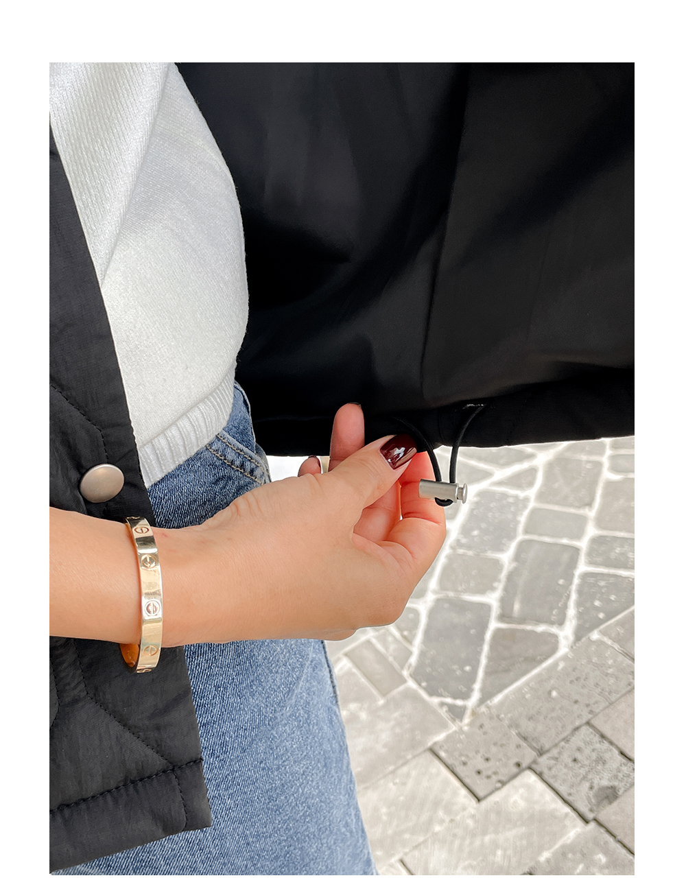밑단에 더해진 스트링으로