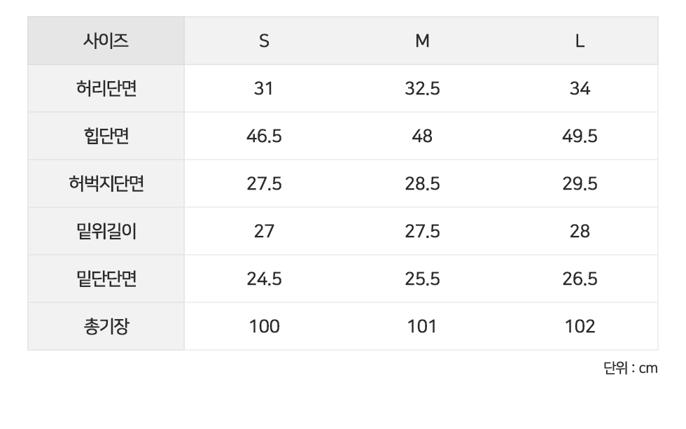 S 허리단면31 힙단면46.5 허벅지단면27.5밑위길이27 밑단단면24.5 총기장100