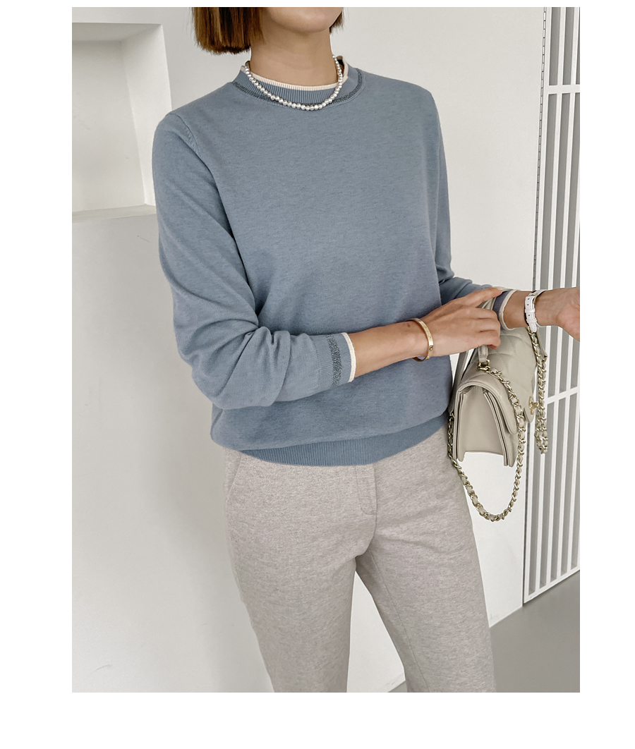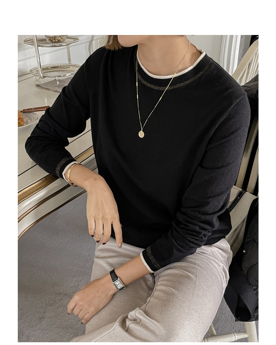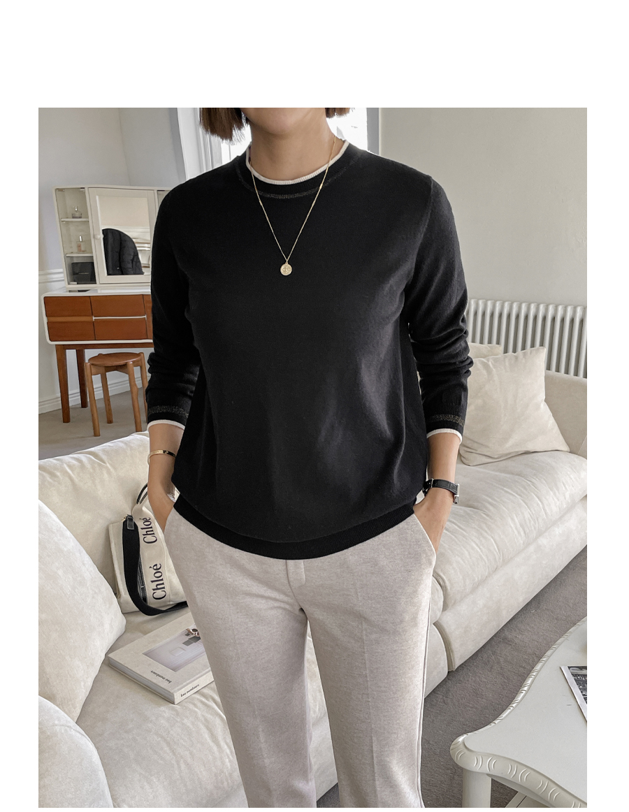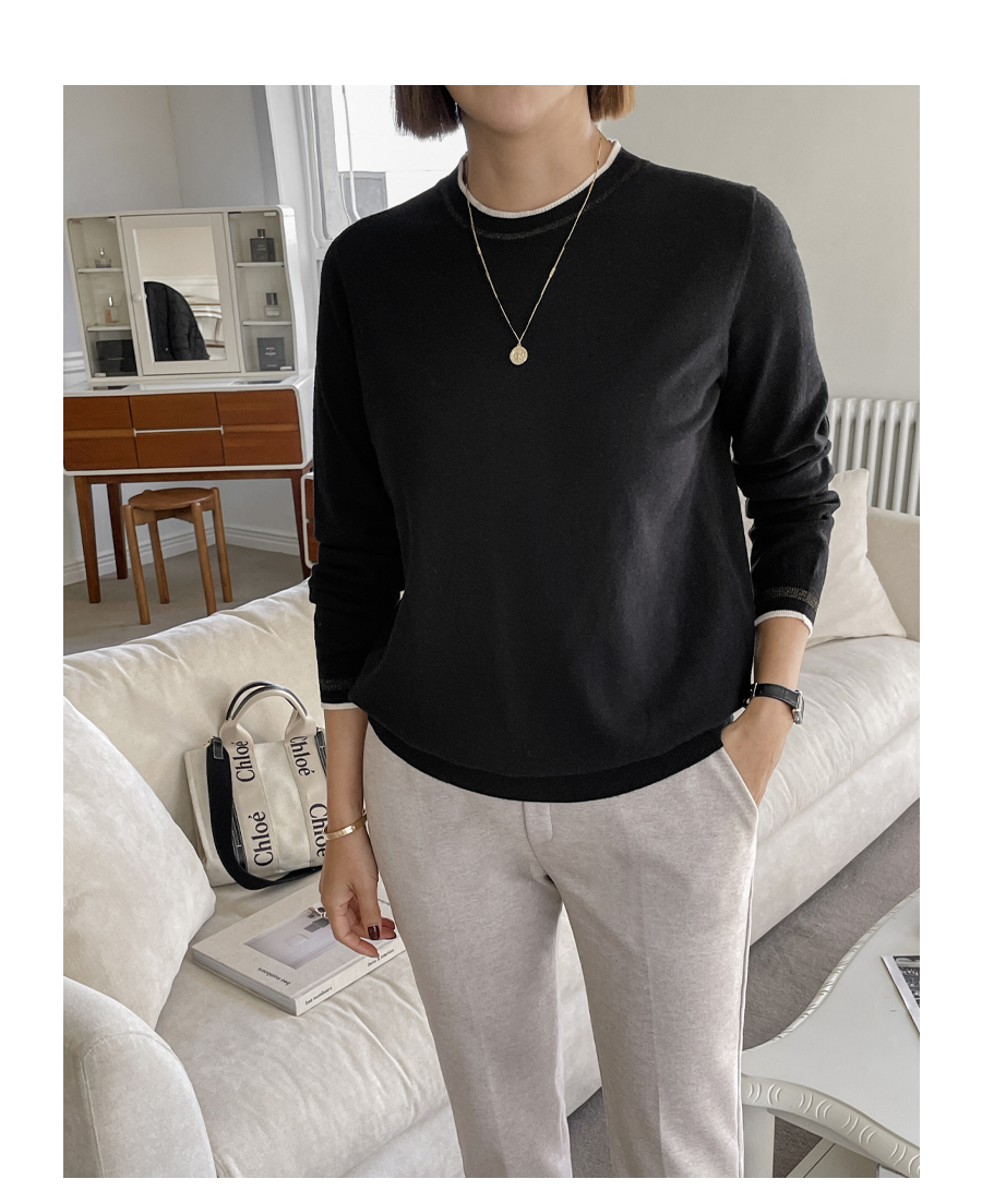넥라인과 소맷단에는 배색 컬러의 라인으로