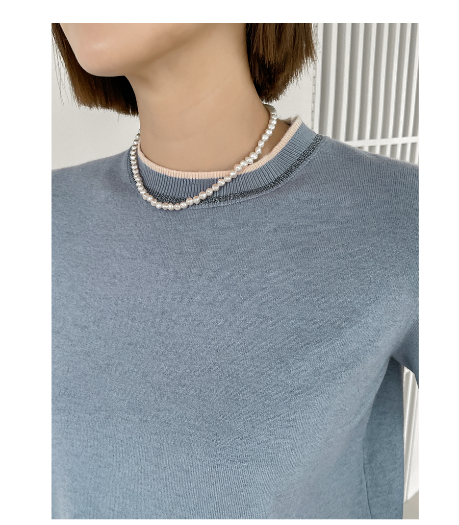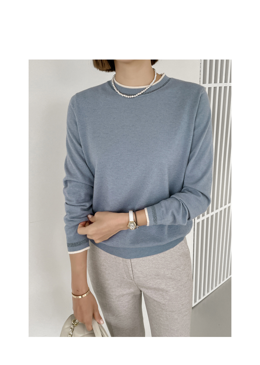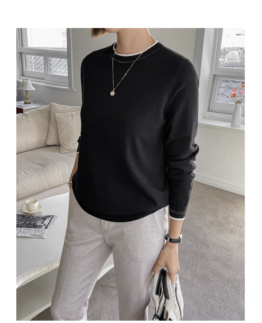 넥라인과 소맷단에는 배색 컬러의 라인으로