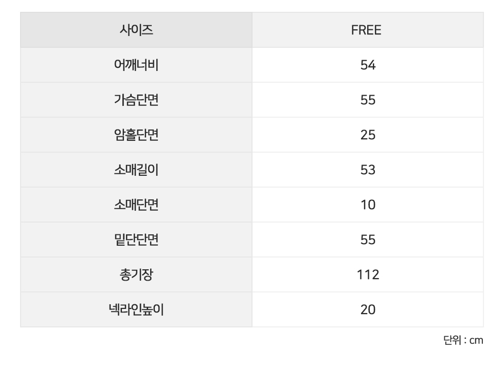 소매길이53 소매단면10 밑단단면55 총기장112 넥라인높이20