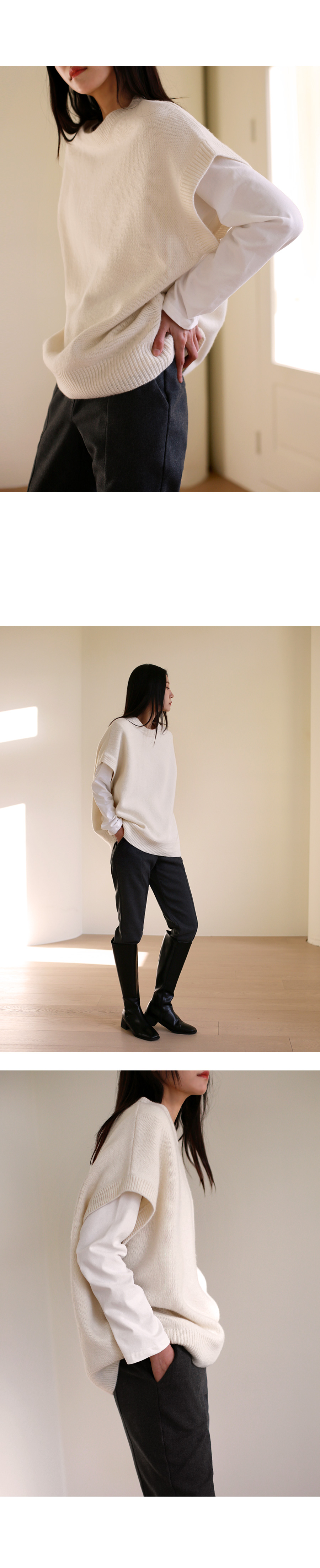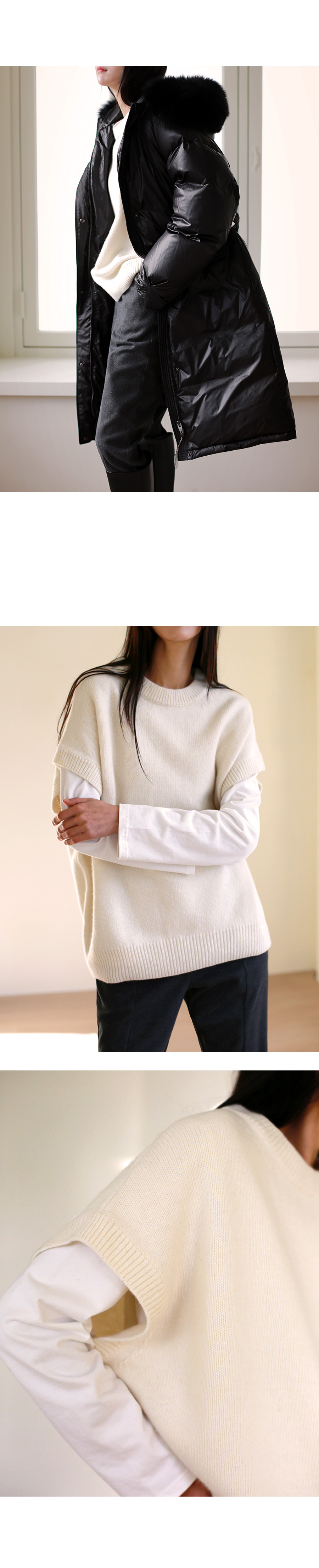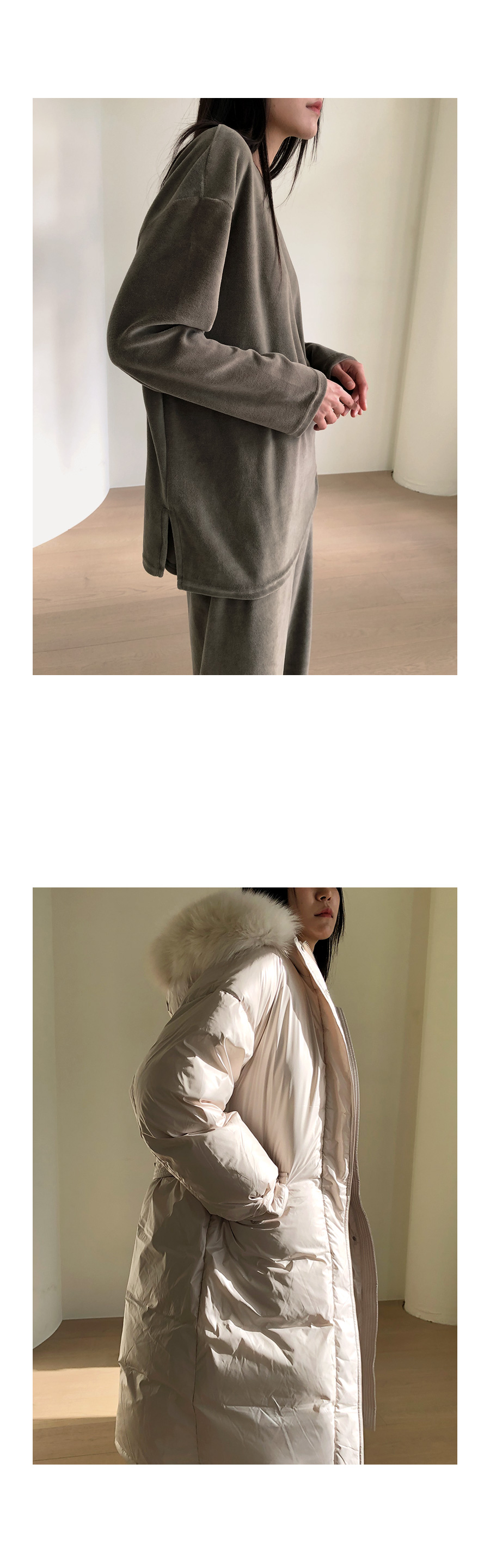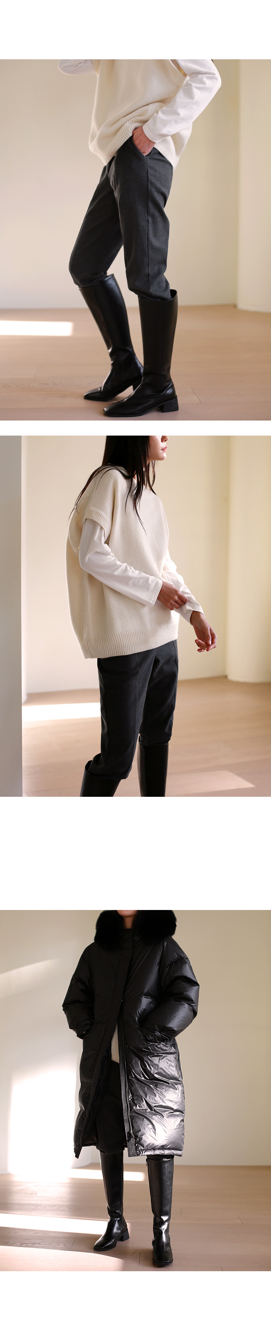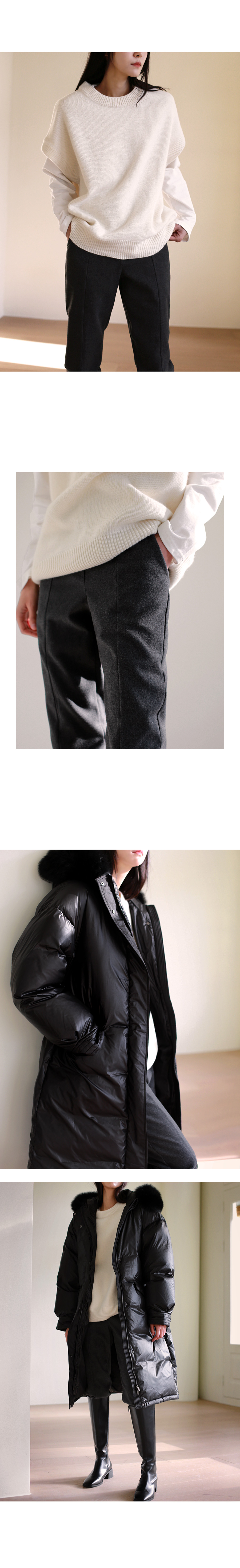 | 모델 착용정보 | J.Y 모델 (키 167cm, 상의 마른 55, 하의 26 inch, 신발 240mm) : 아이보리, 블랙 E.A 모델 (키 168cm, 상의 마른 55, 하의 25 inch, 신발 240mm) : 블랙 |