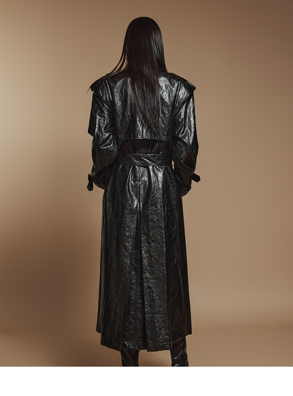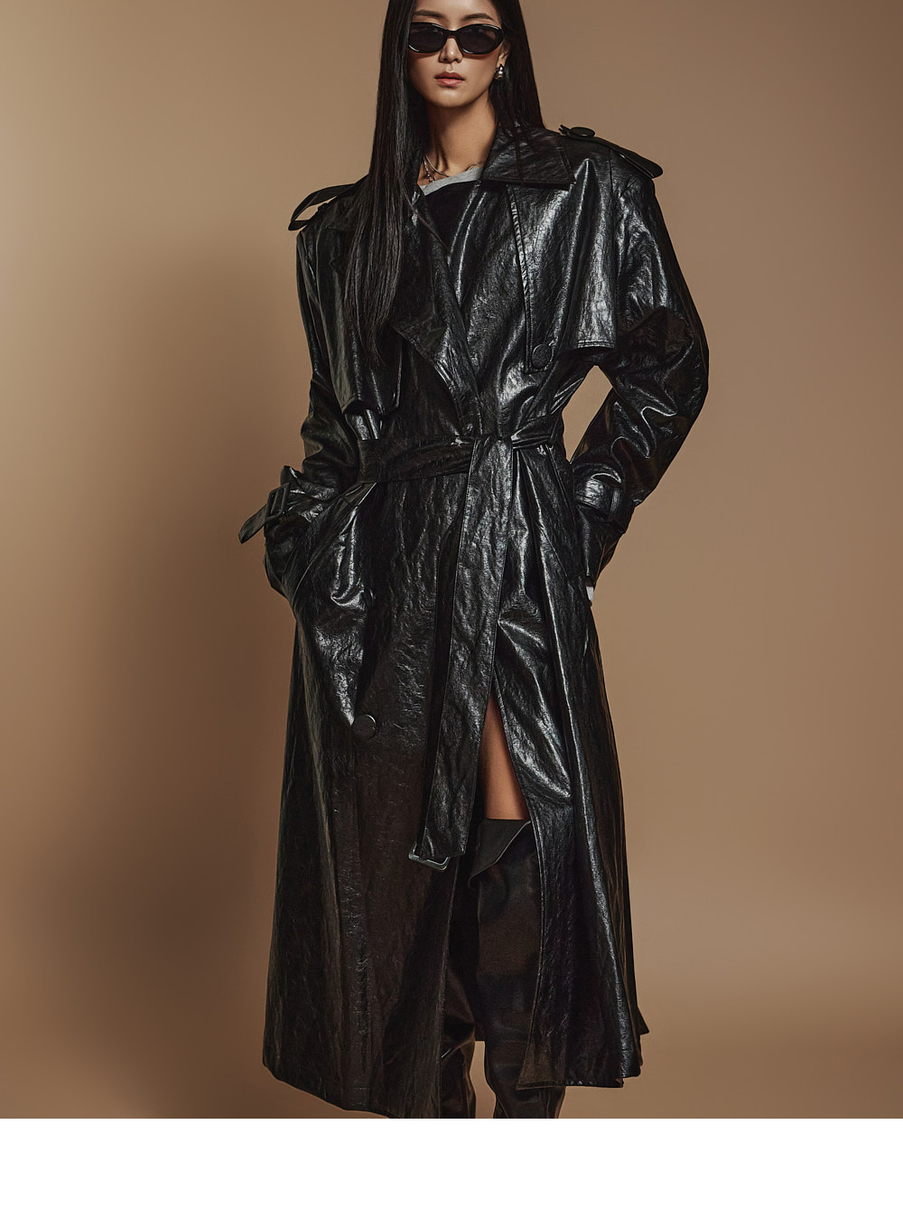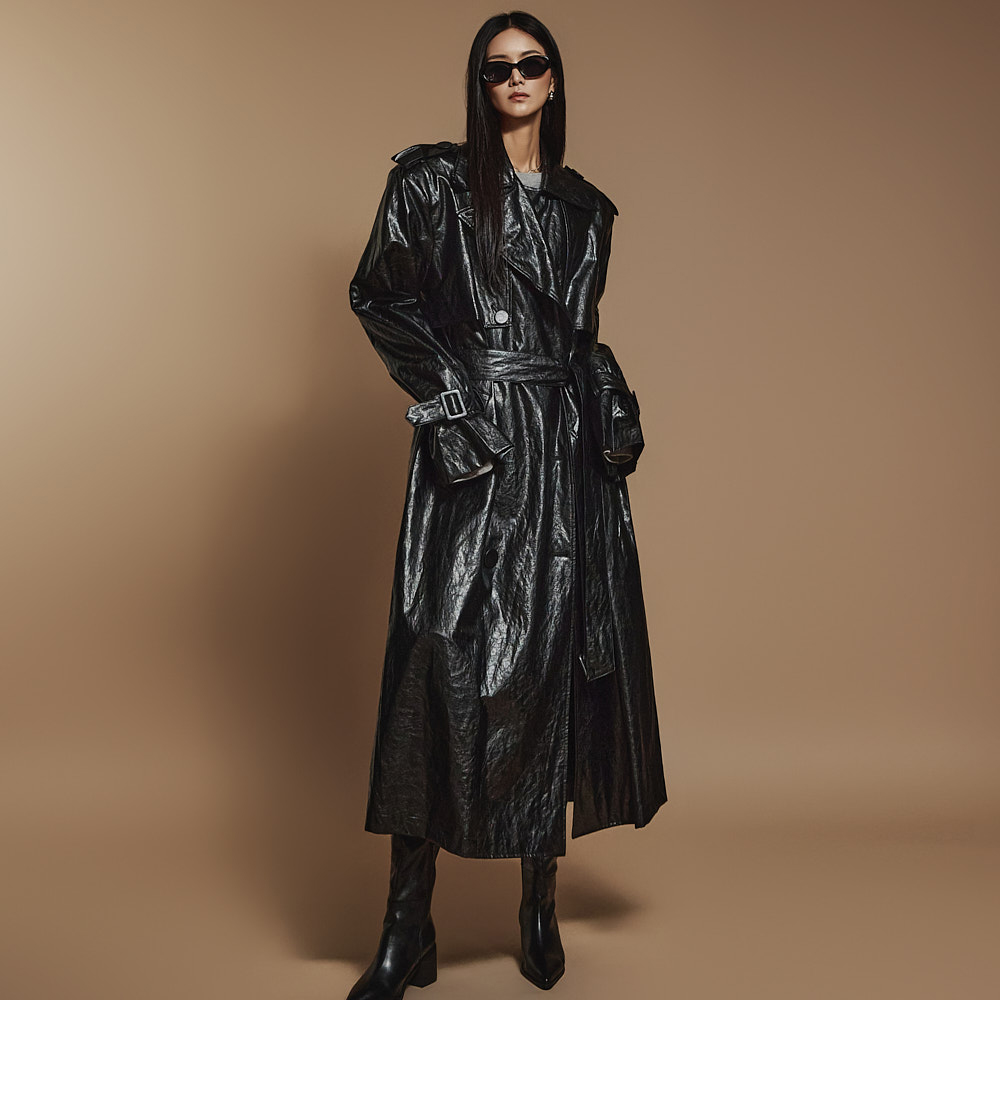 스타일리시한 무드의 레더 트렌치코트 입니다.