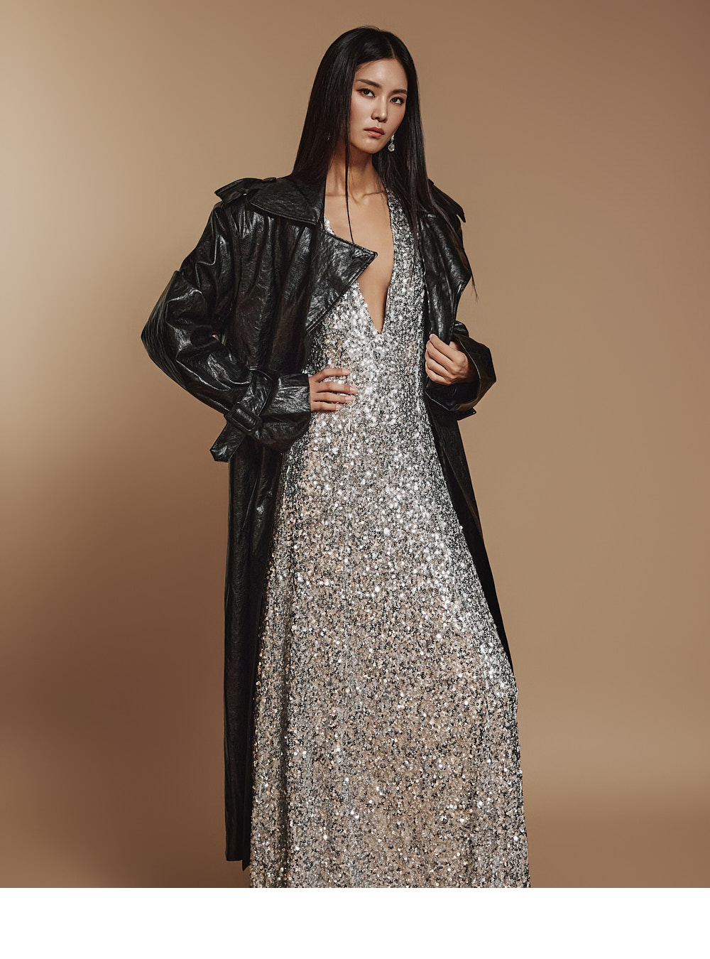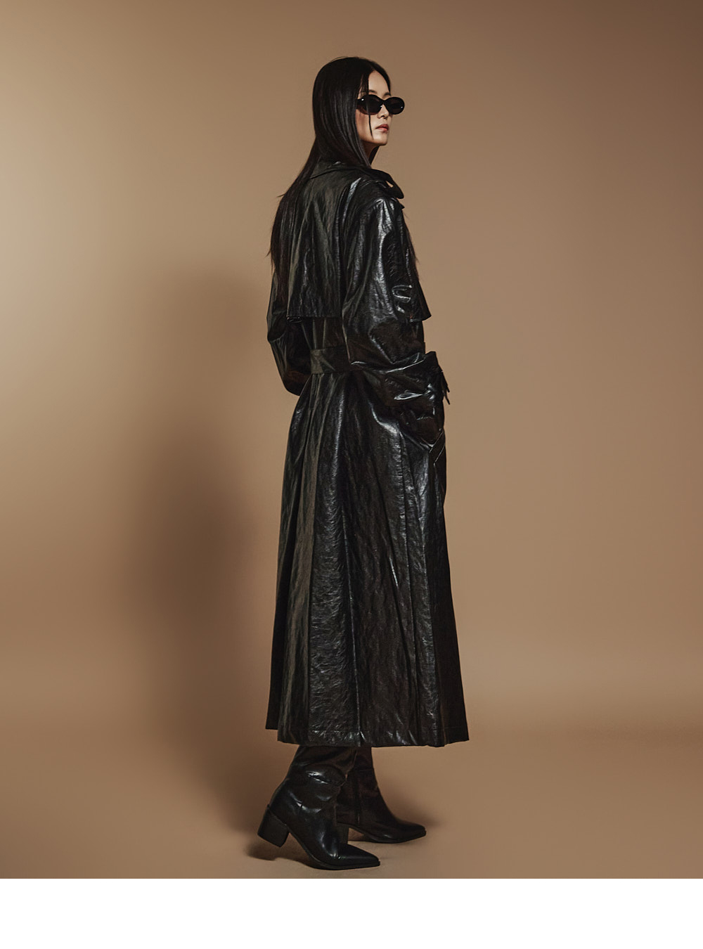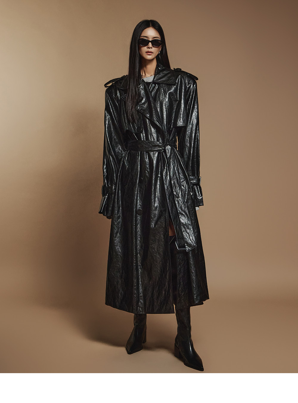 스타일리시한 무드의 레더 트렌치코트 입니다.