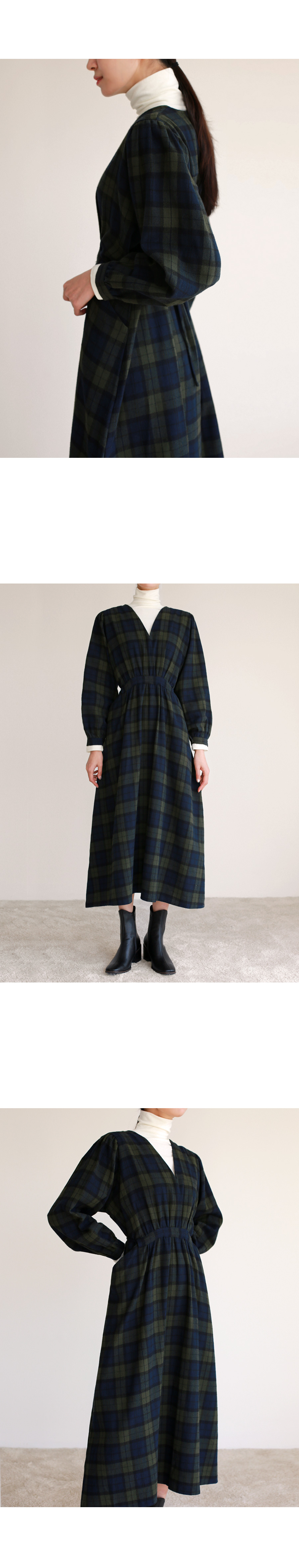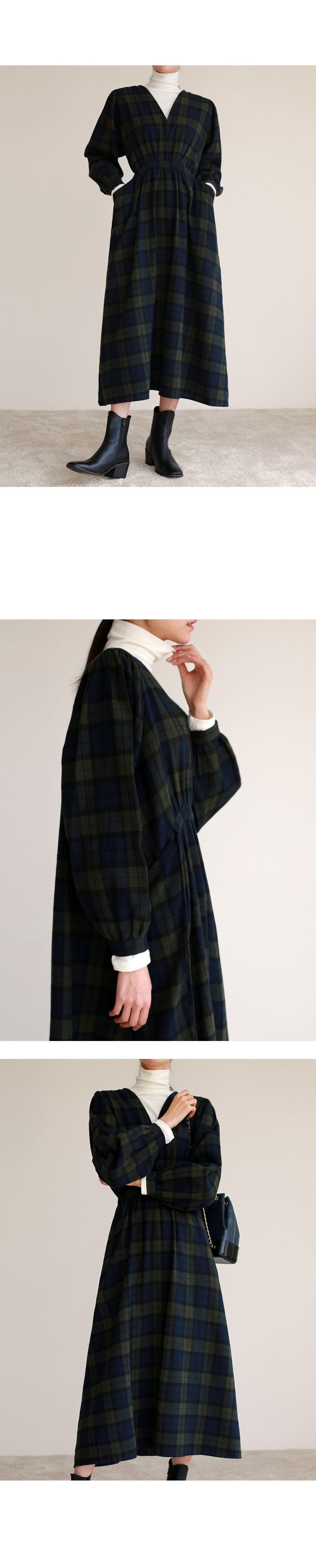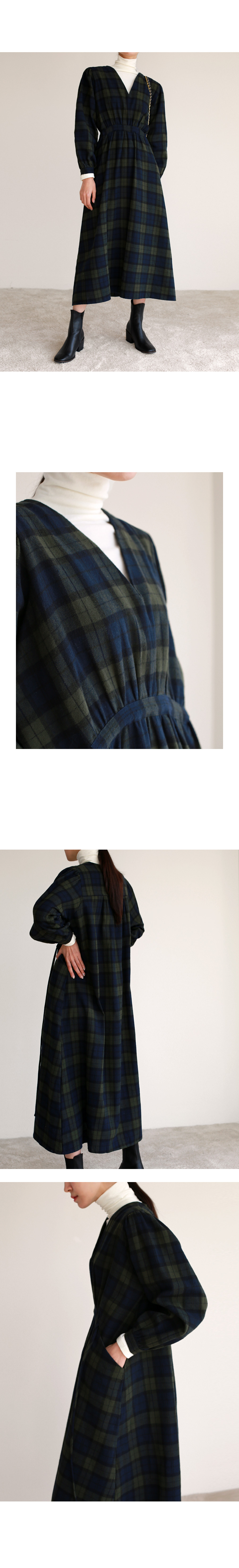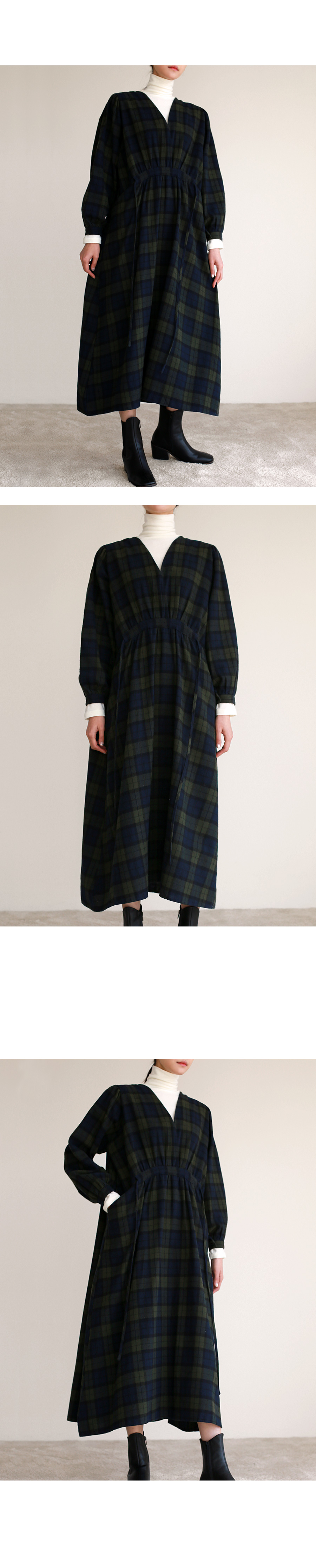 브이넥 체크 롱 원피스