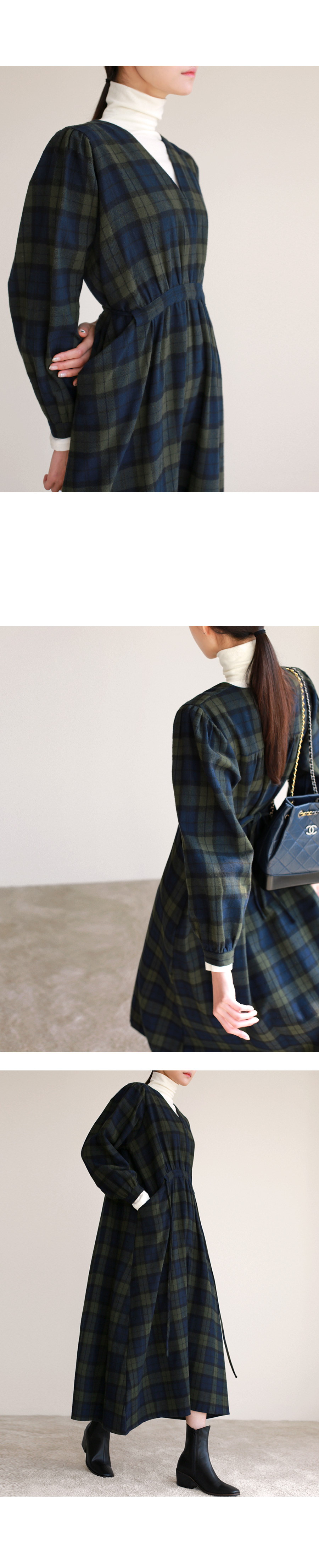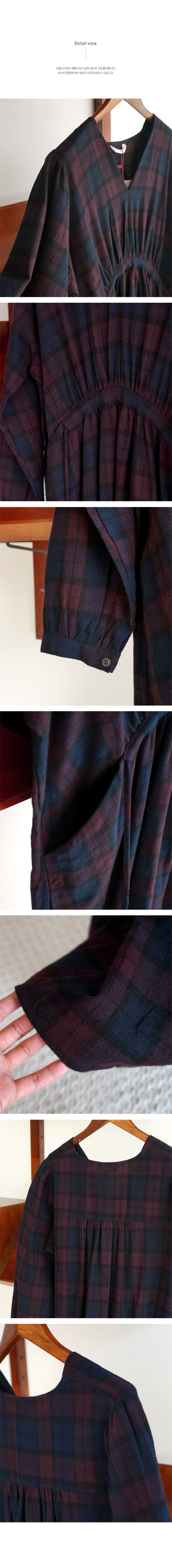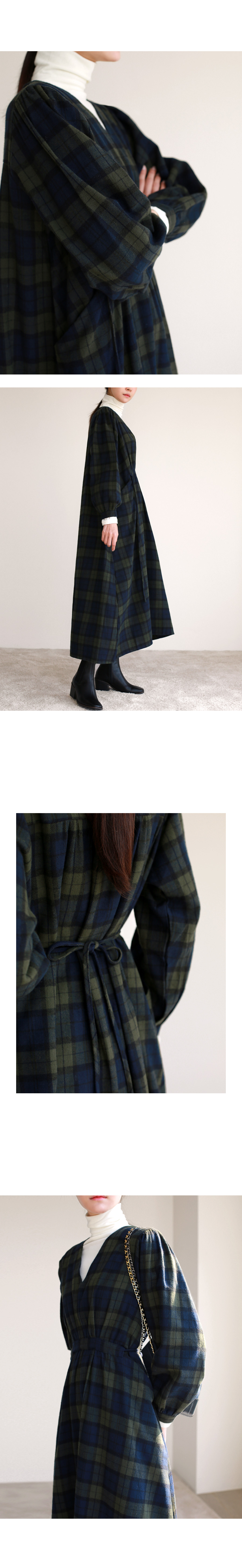브이넥 체크 롱 원피스