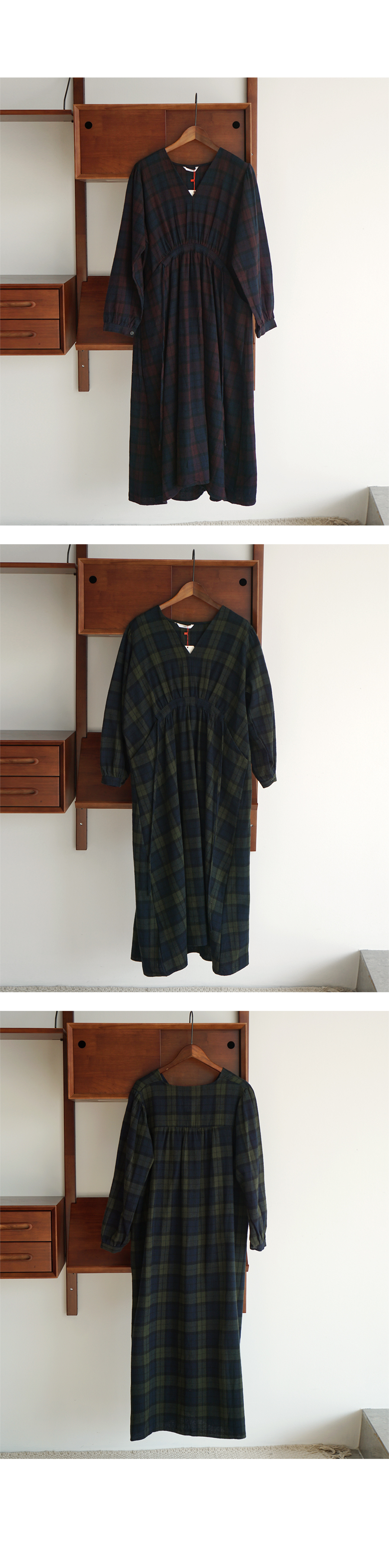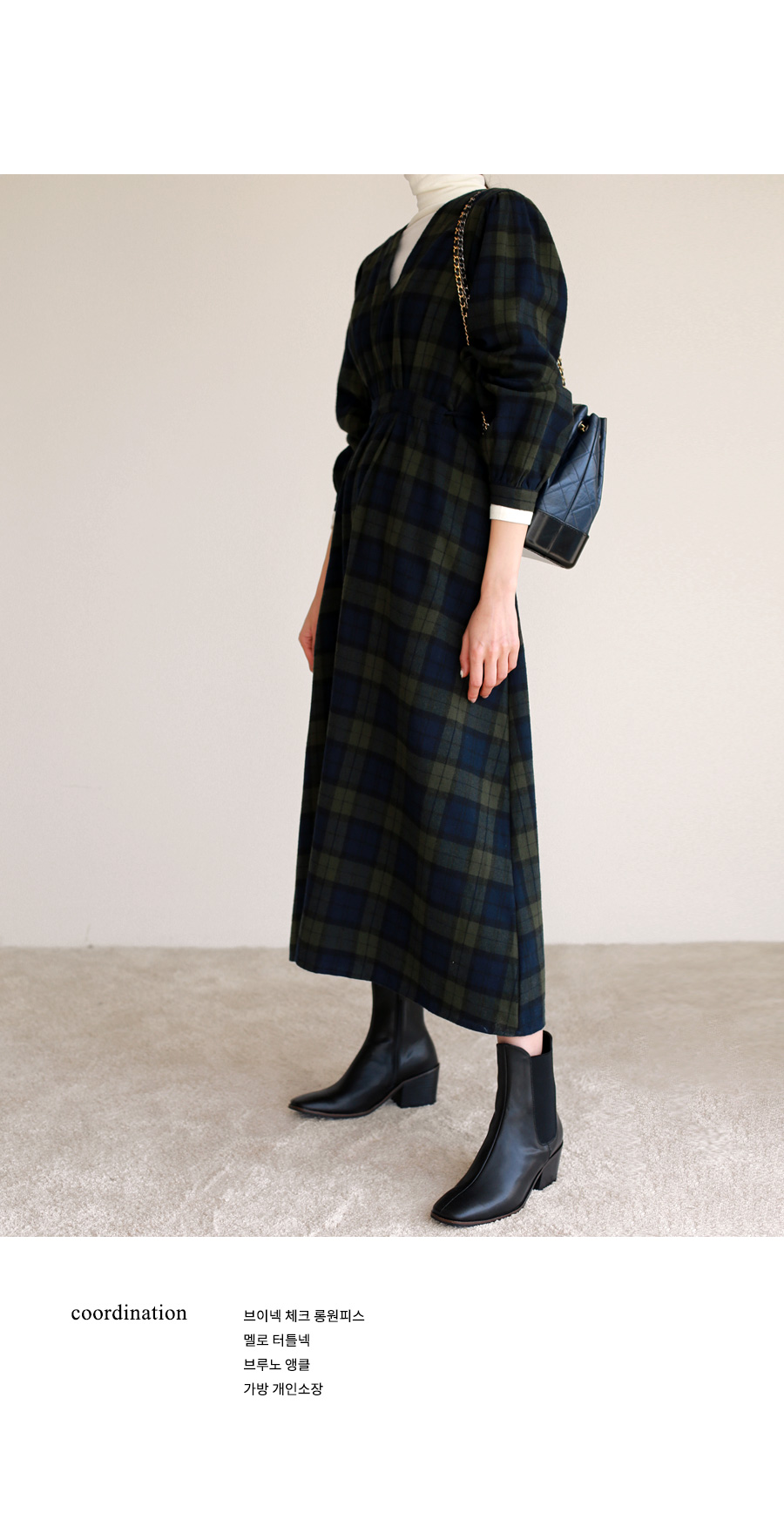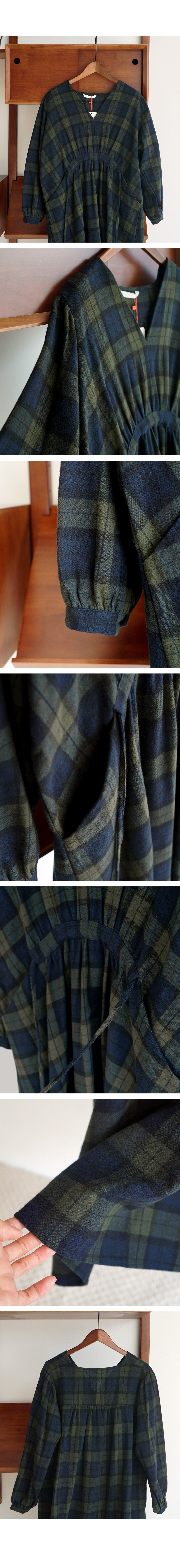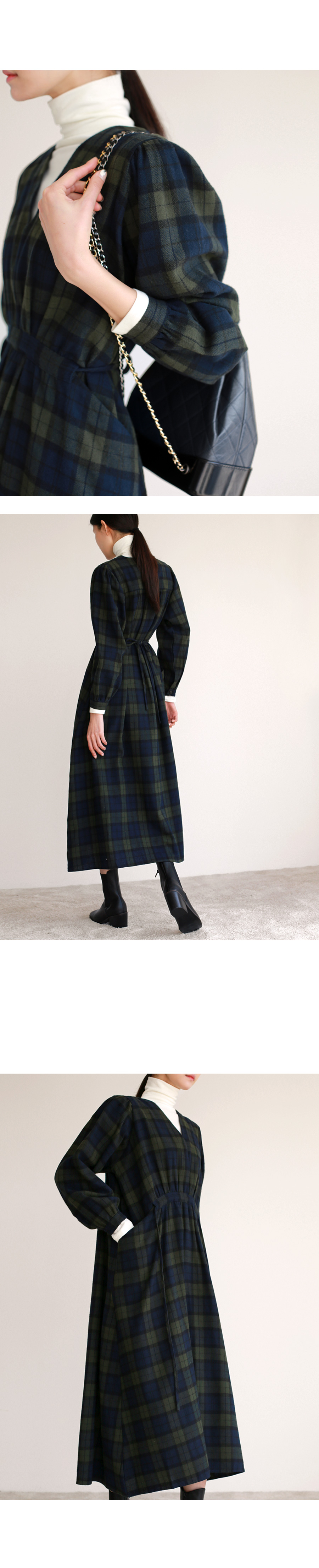브이넥 체크 롱 원피스