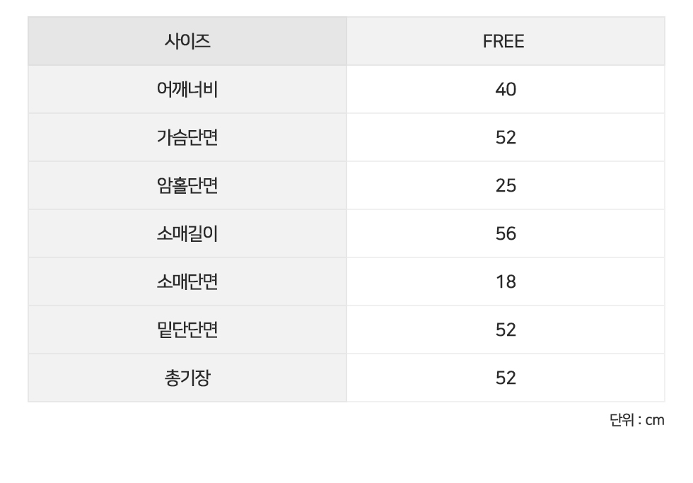 FREE 어깨단면40 가슴단면52 암홀단면25