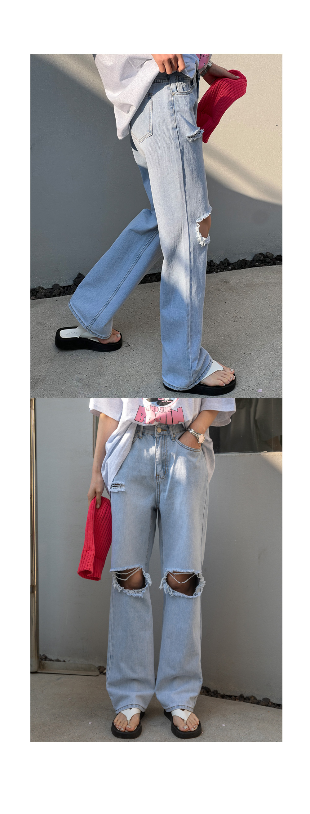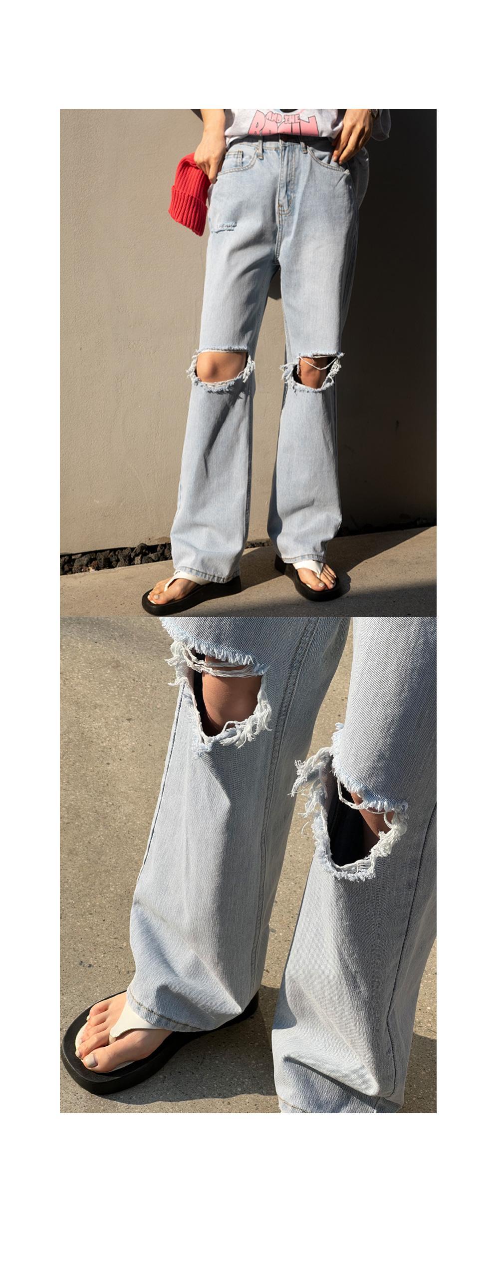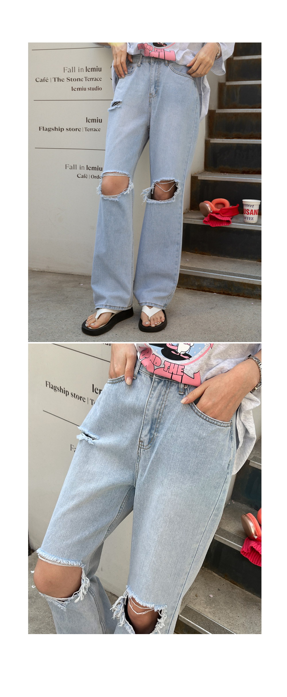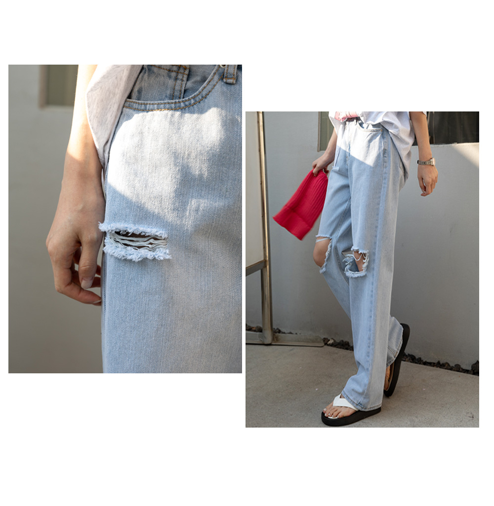 와이드한 핏과 디스트로이드 디테일로
