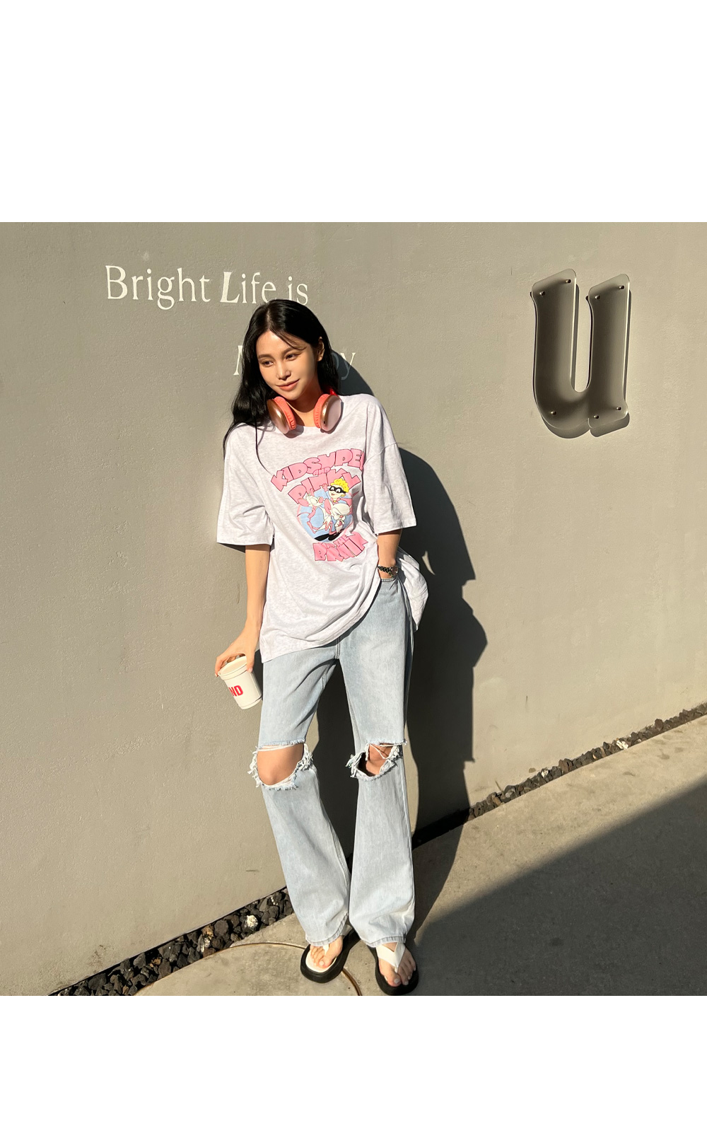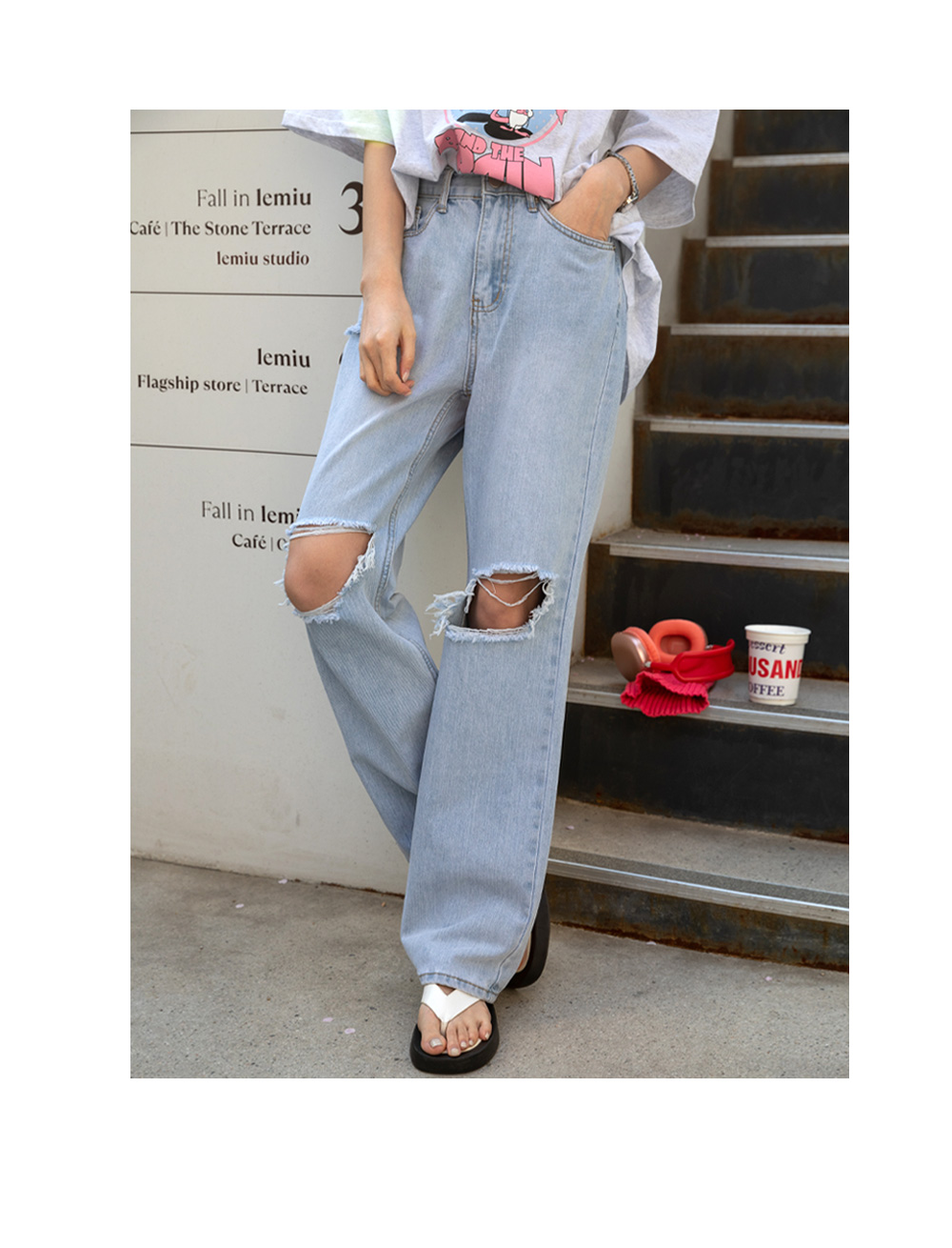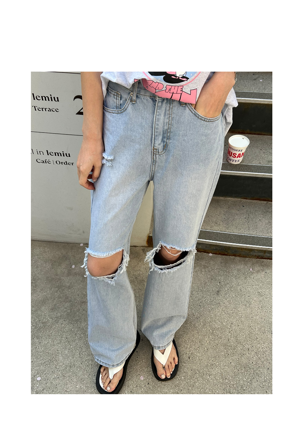 와이드한 핏과 디스트로이드 디테일로