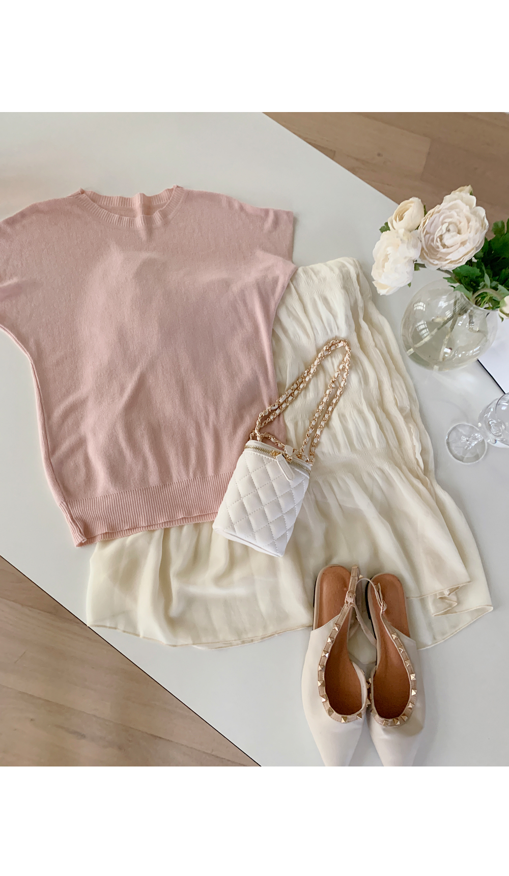 스커트가 포인트가 되어주어 페미닌한 룩을