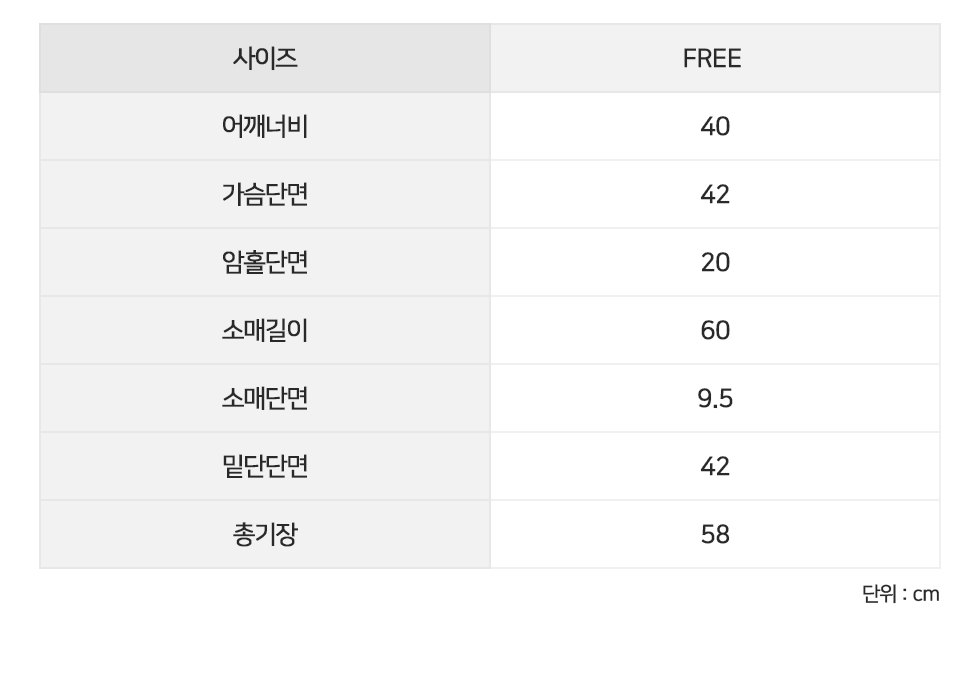 소매길이60 소매단면9.5 밑단단면42 총기장58