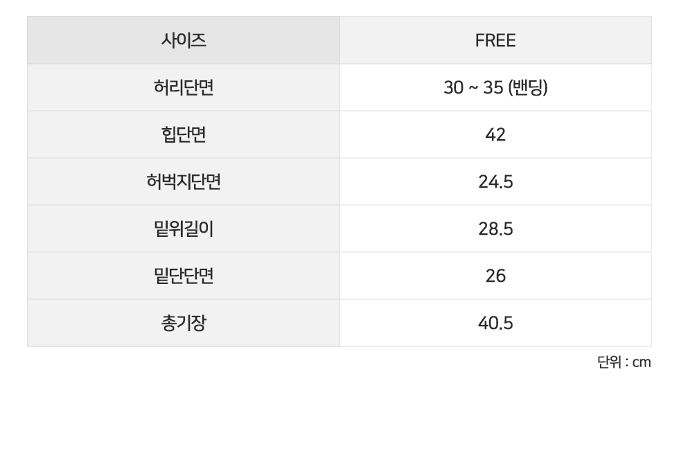 FREE 허리단면30~35(밴딩) 힙단면42 허벅지단면24.5밑위길이28.5 밑단단면26 총기장40.5