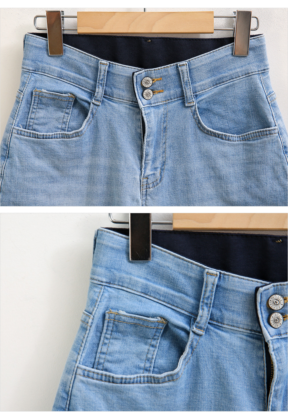 투버튼 디테일과 허리 밴딩이