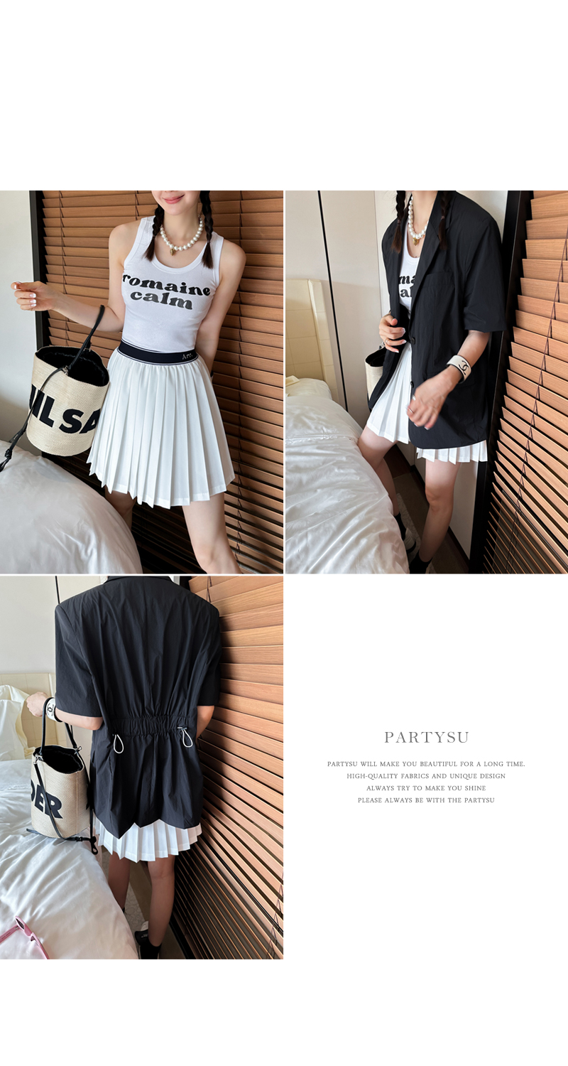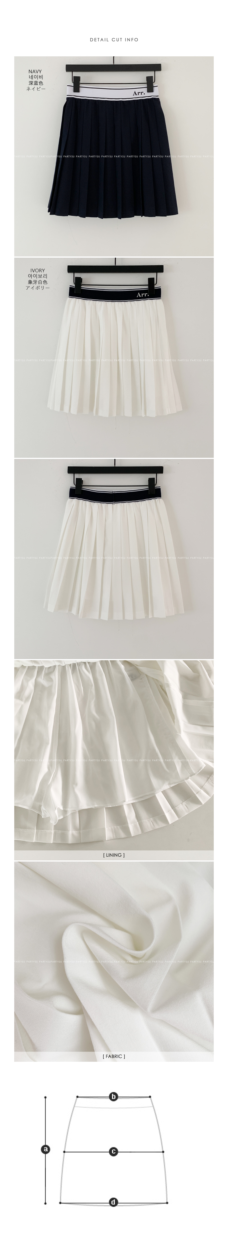 힙을 덮는 기장은 롱이시한 레그 라인을 연출하며 플리츠 디테일로