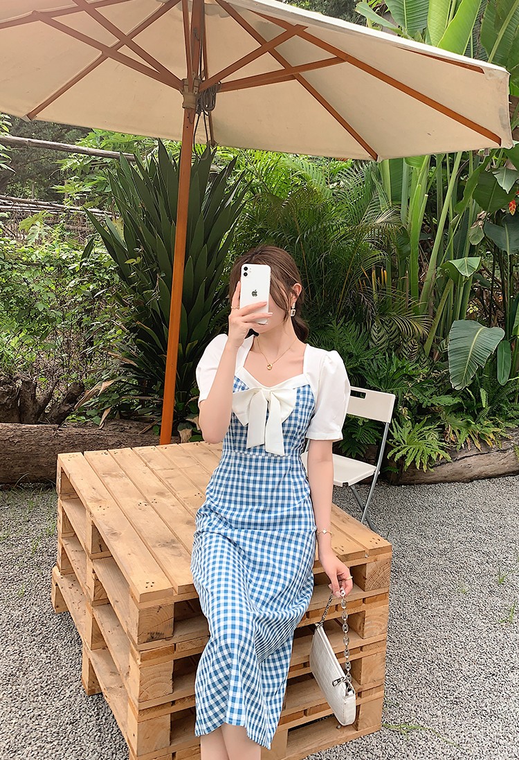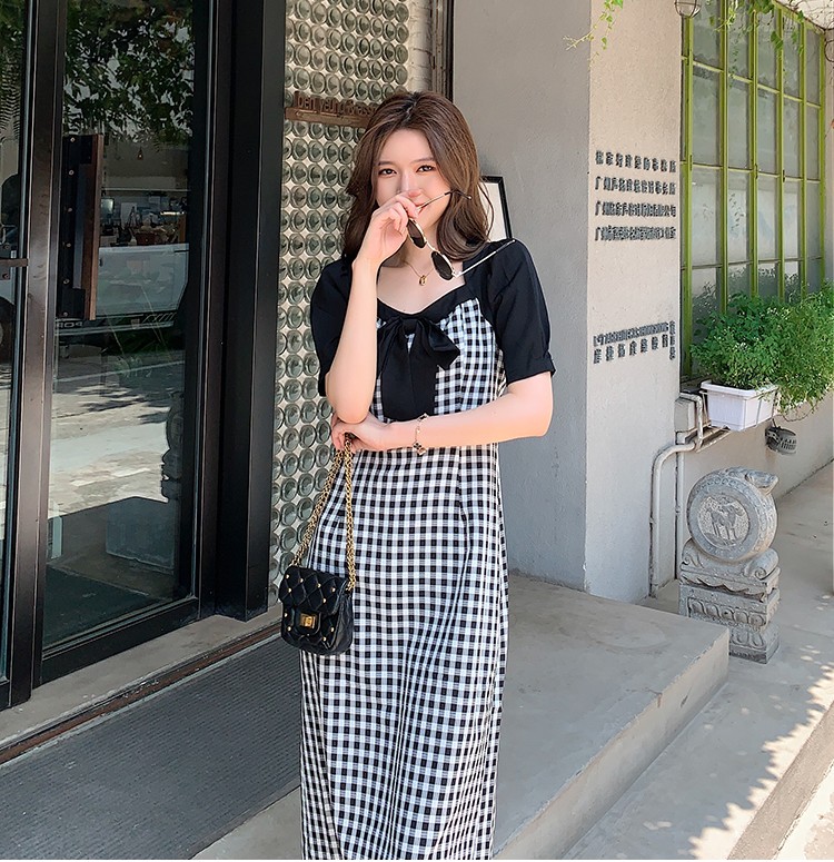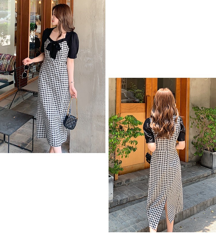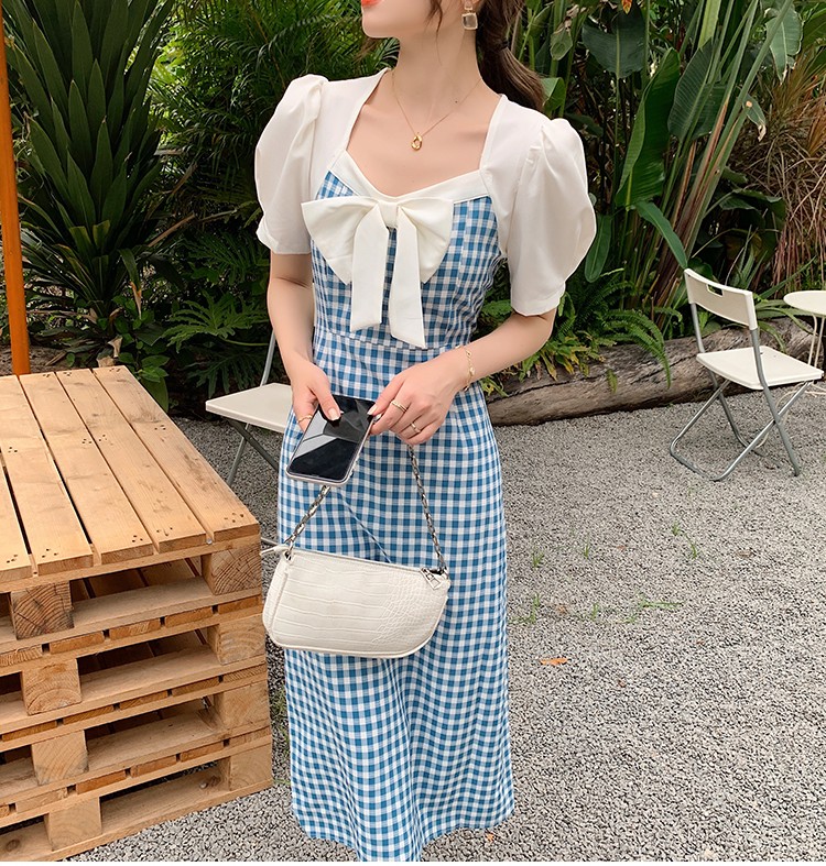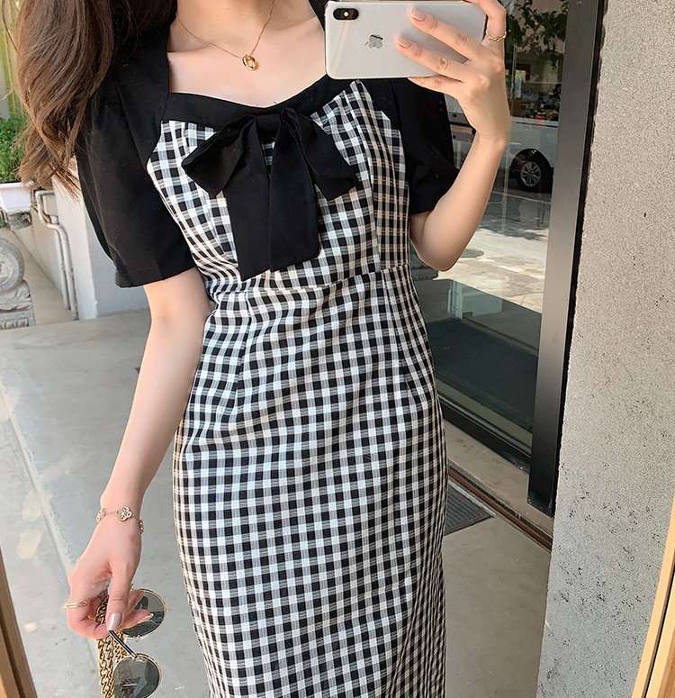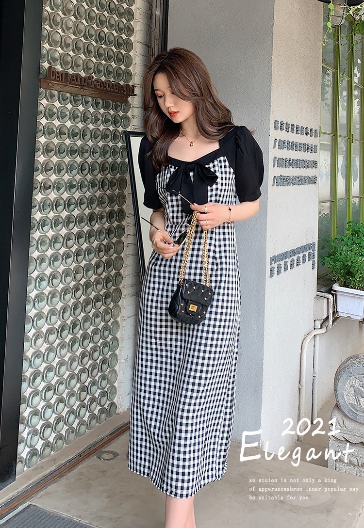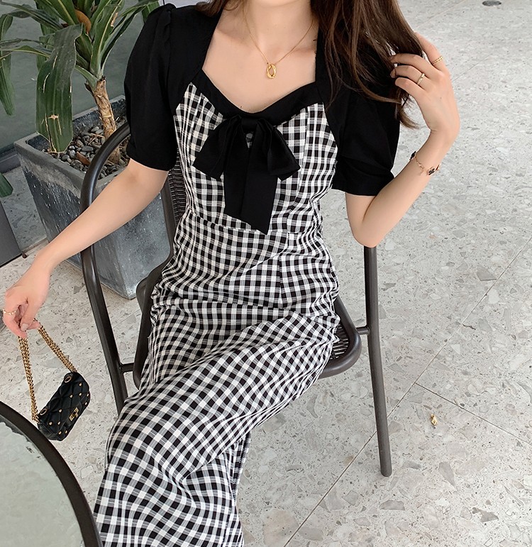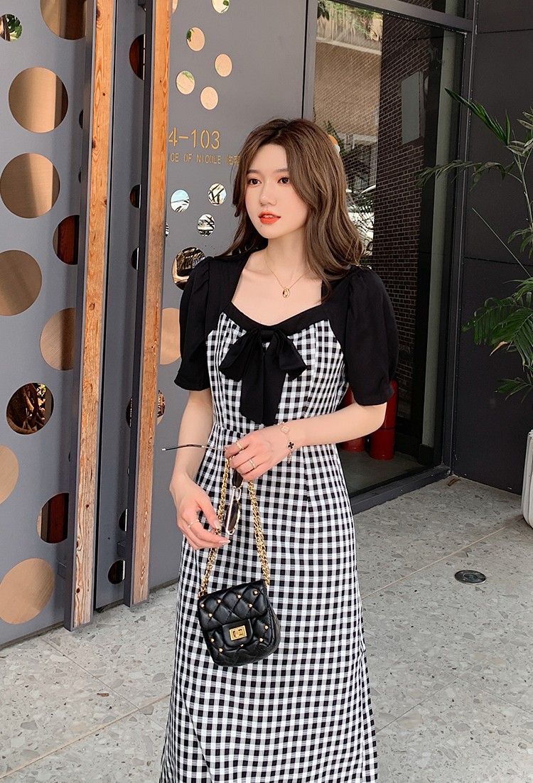 Shade ribbon and volume sleeve feminine check dress