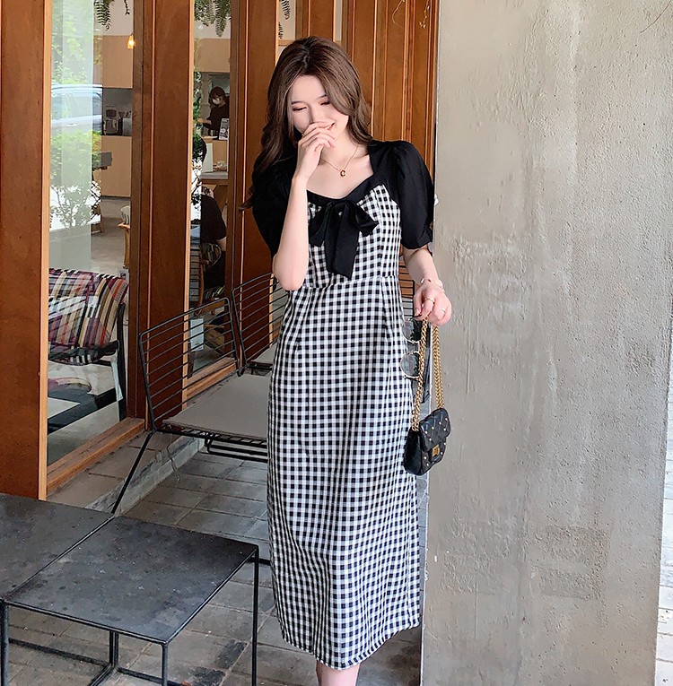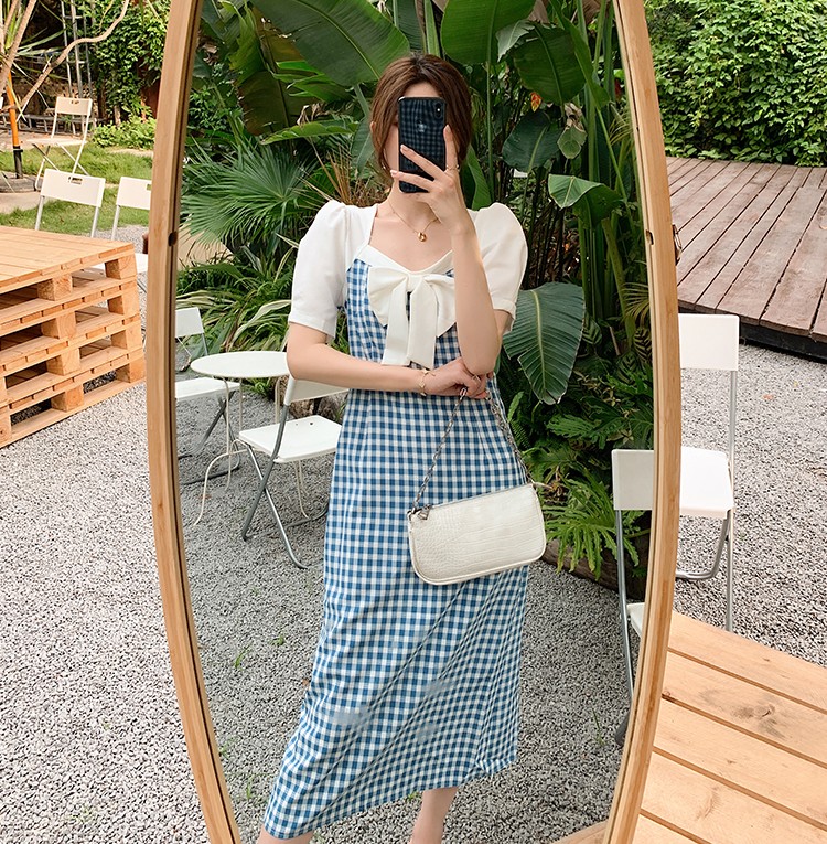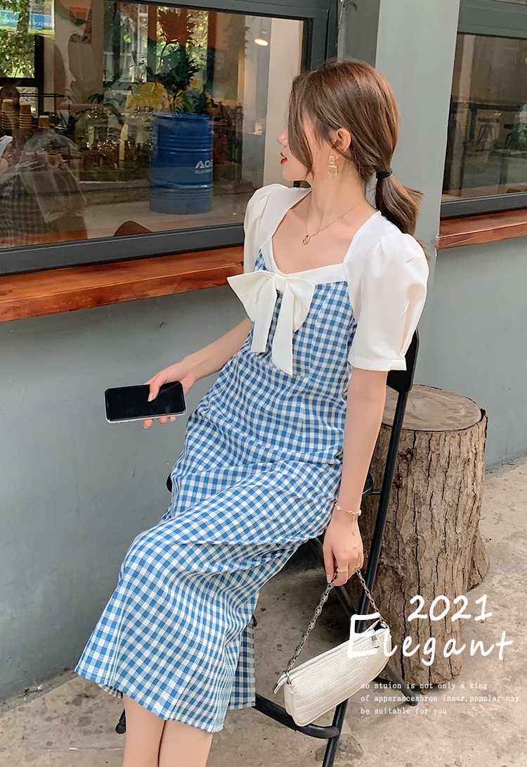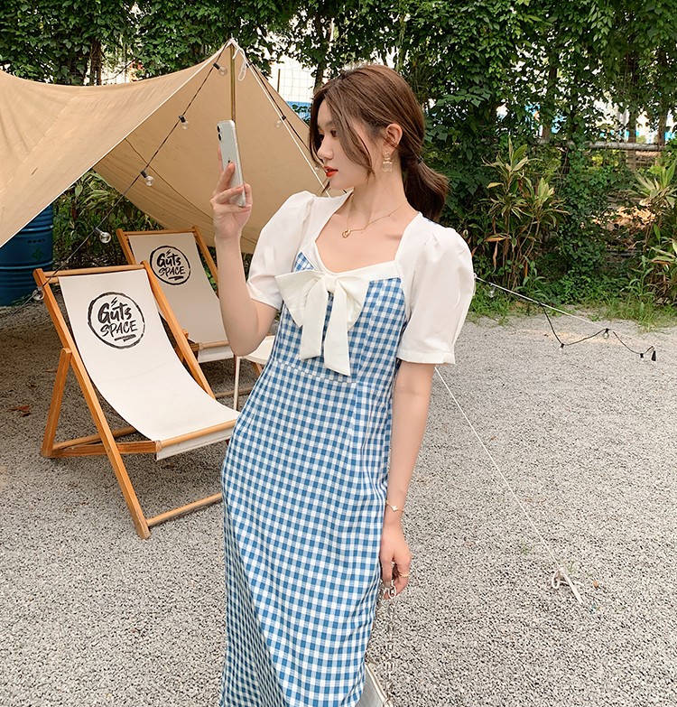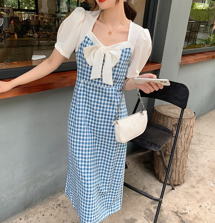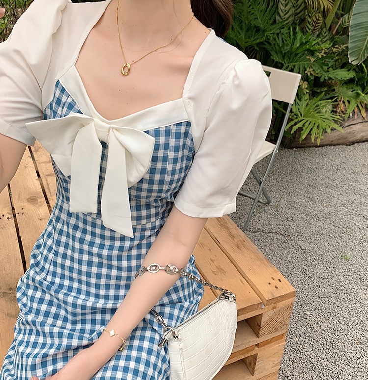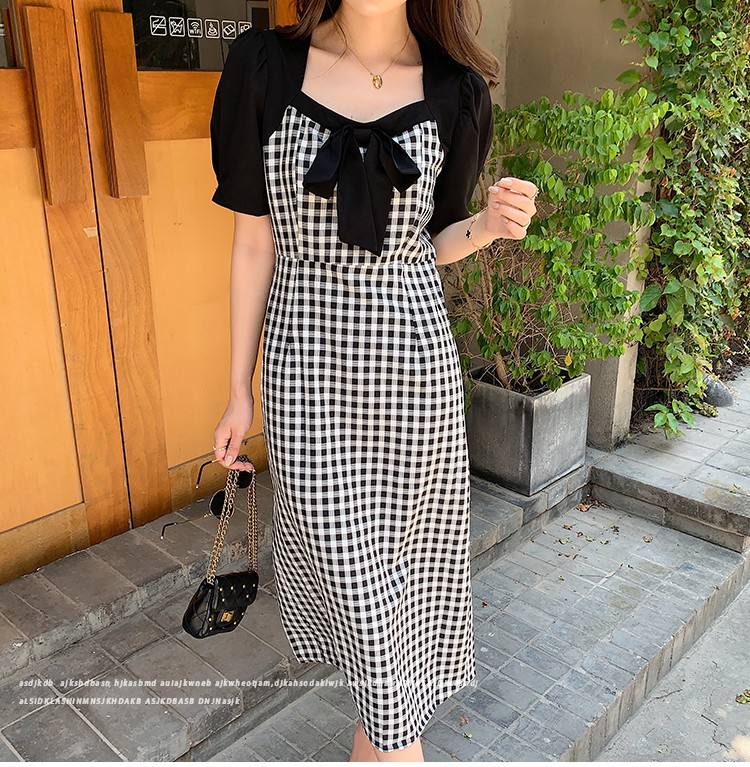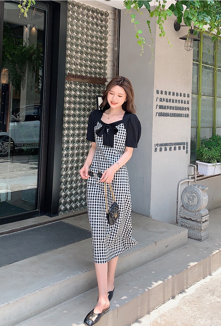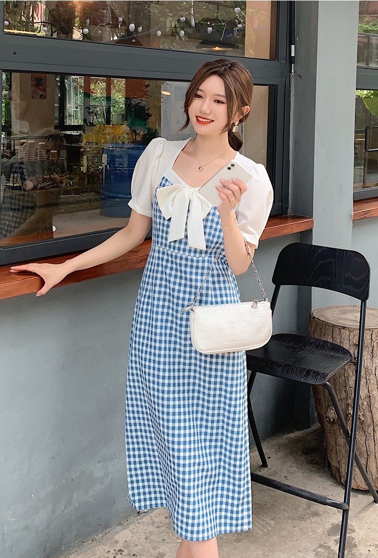 Shade ribbon and volume sleeve feminine check dress