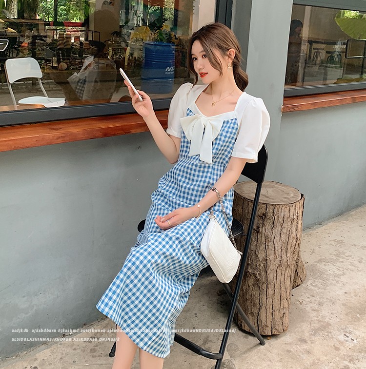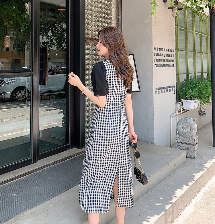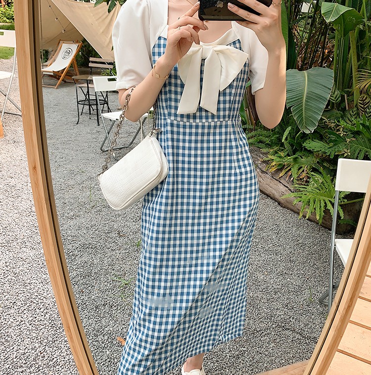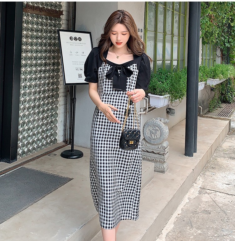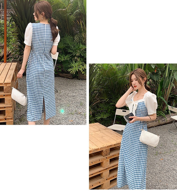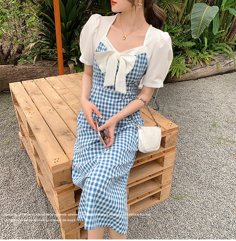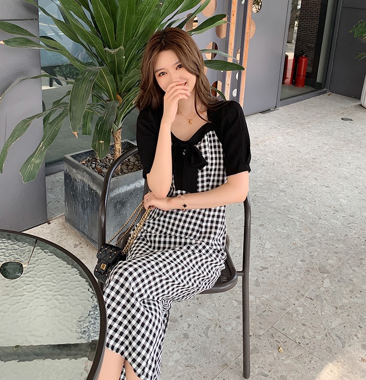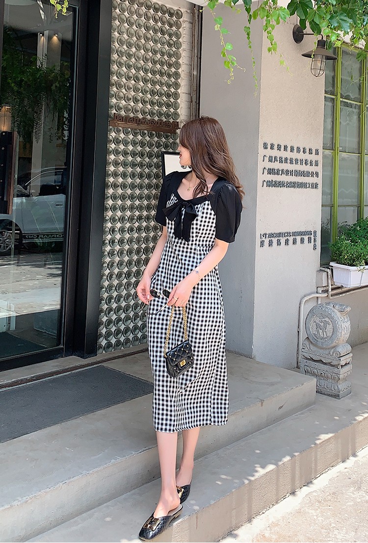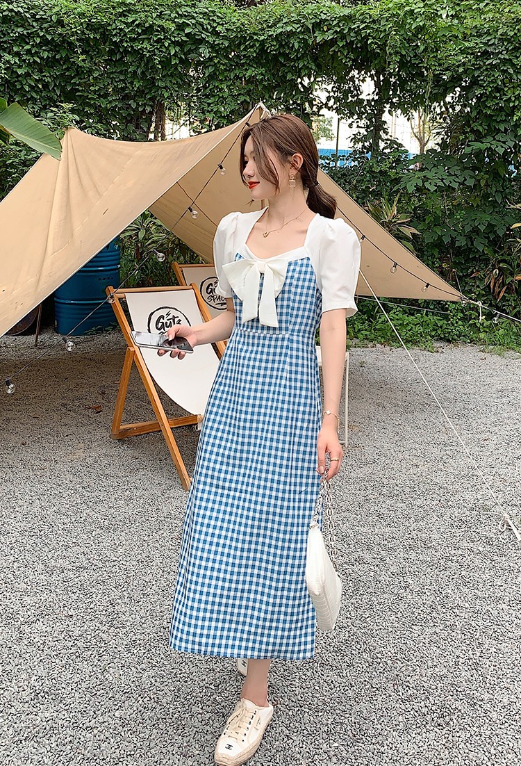 Shade ribbon and volume sleeve feminine check dress