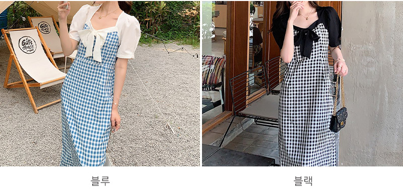 샤이드 리본과 볼륨소매 페미닌 체크 원피스