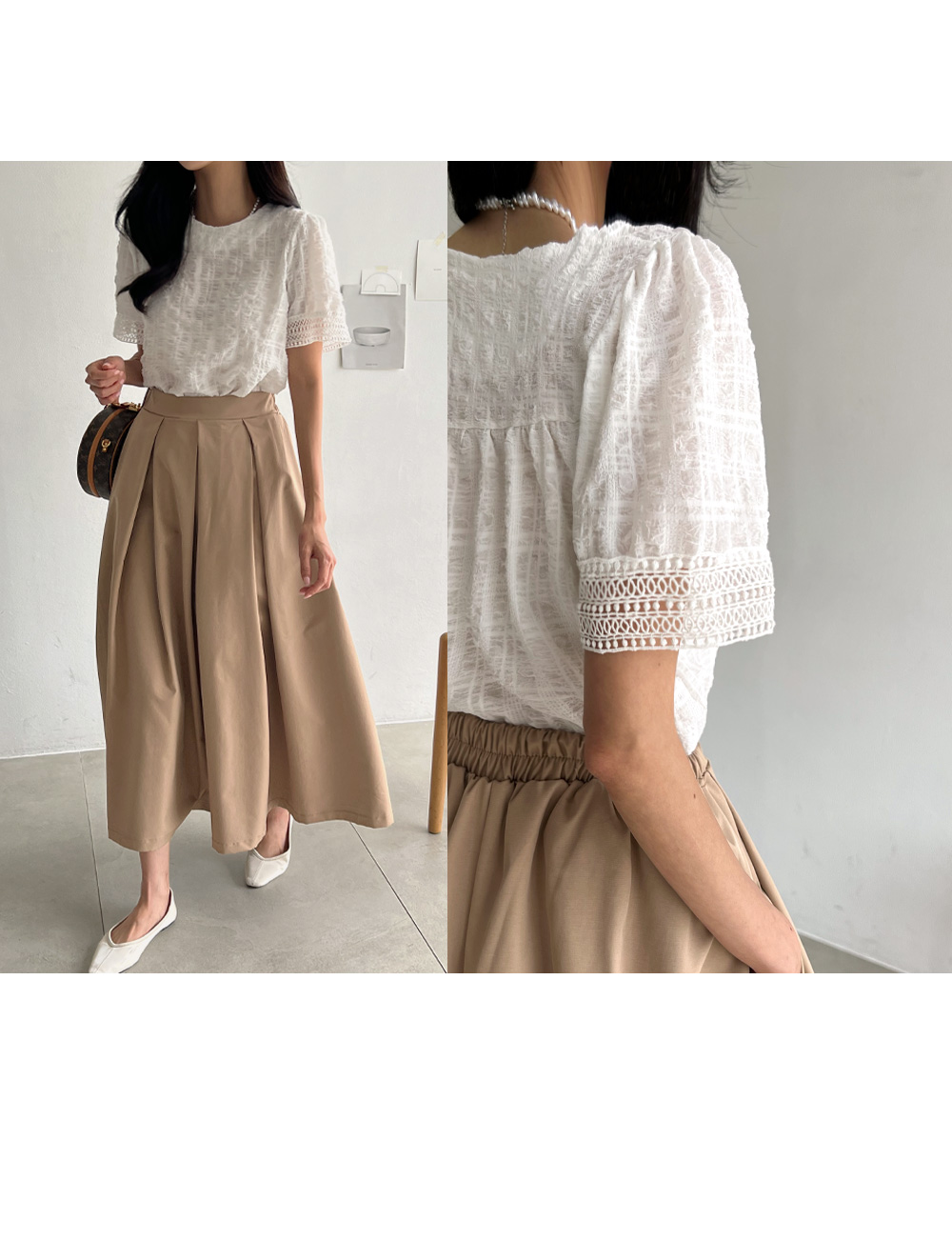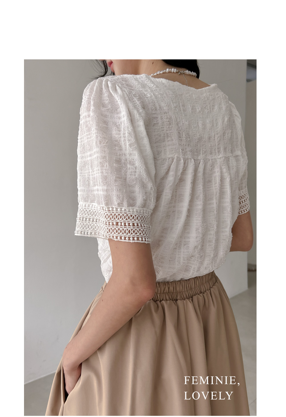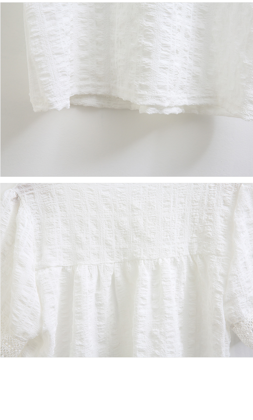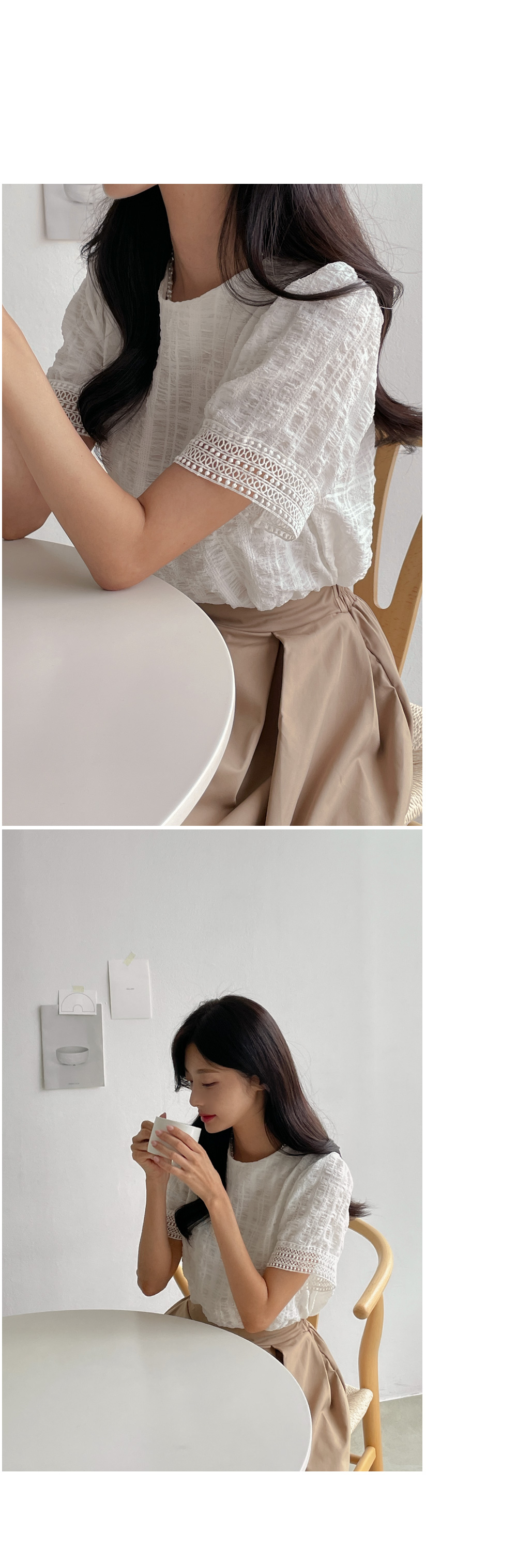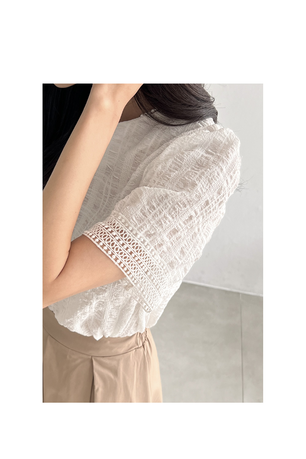 퍼프 소매와 소매 밑단 레이스 디테일로