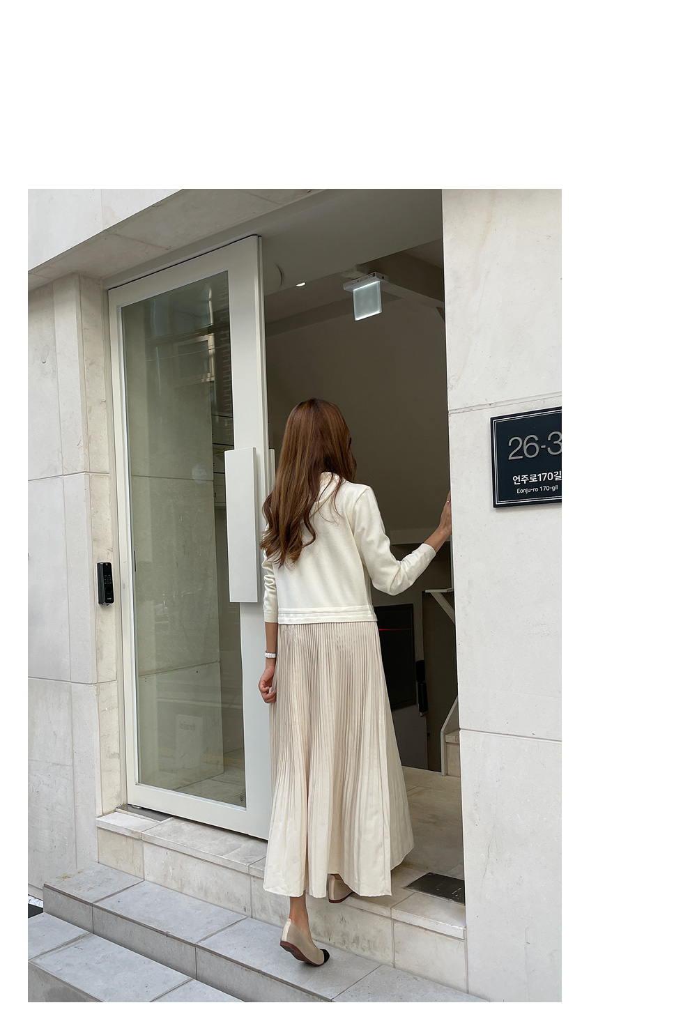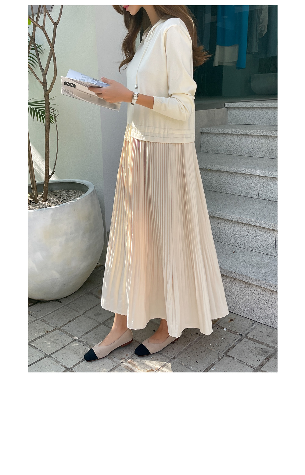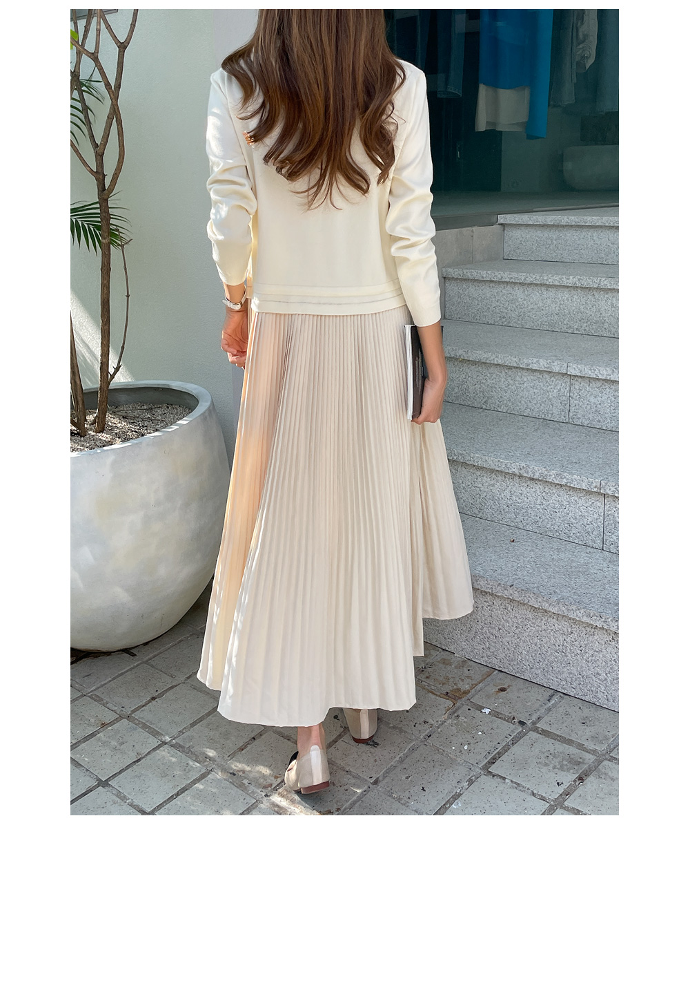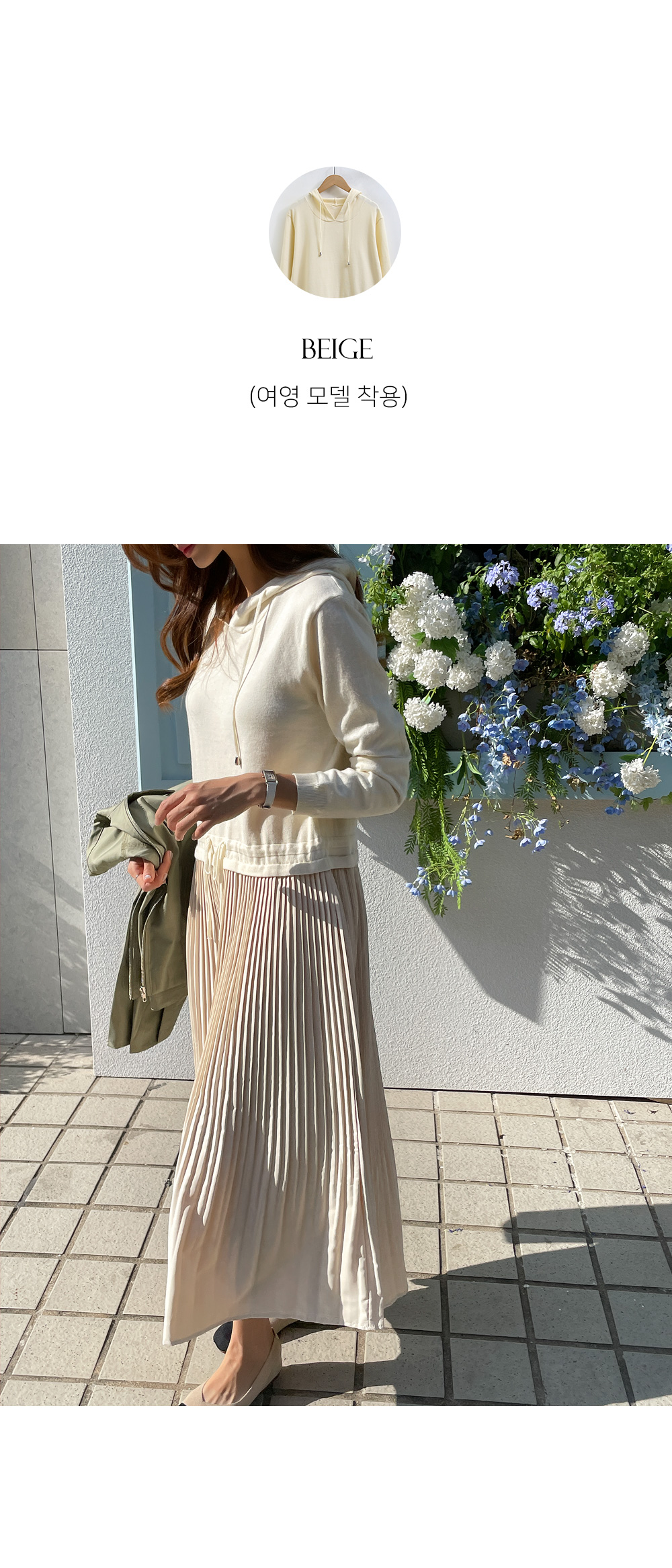 스커트는 여성스러운 플리츠로 디자인해주어